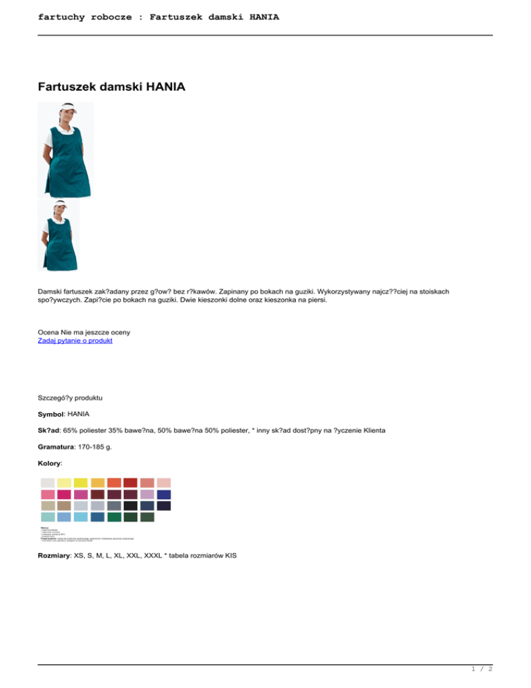 fartuchy robocze : Fartuszek damski HANIA Fartuszek damski HANIA Damski fartuszek zak?adany przez g?ow? bez r?kawów. Zapinany po bokach na guziki. Wykorzystywany najcz??ciej na stoiskach spo?ywczych. Zapi?cie po bokach na guziki. Dwie kieszonki dolne oraz kieszonka na piersi. Ocena Nie ma jeszcze oceny Zadaj pytanie o produkt Szczegó?y produktu Symbol: HANIA Sk?ad: 65% poliester 35% bawe?na, 50% bawe?na 50% poliester, * inny sk?ad dost?pny na ?yczenie Klienta Gramatura: 170-185 g. Kolory: Rozmiary: XS, S, M, L, XL, XXL, XXXL * tabela rozmiarów KIS 1 / 2 fartuchy robocze : Fartuszek damski HANIA Cennik naszych wyrobów otrzymaj? Pa?stwo dzwoni?c pod numer: 17 2270 465, wysy?aj?c e-mail z zapytaniem lub konsultuj?c si? z naszymi doradcami on-line przez komunikator GG. 2 / 2 Powered by TCPDF (www.tcpdf.org)