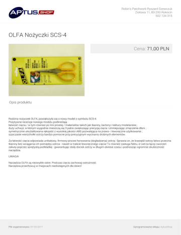 Robin's Patchwork Ryszard Szewczuk Ziołowa 11, 83-200 Rokocin 502 134 315 OLFA Nożyczki SCS-4 Cena: 71,00 PLN Opis produktu Rodzina nożyczek OLFA, powiększyła się o nowy model o symbolu SCS-4. Pozytywne recenzje nowego modelu podkreślają : łatwość cięcia / w tym również po linii prostej / materiałów takich jak tkaniny, kartony i tektury modelarskie ; duży uchwyt, w którym wygodnie mieszczą się 3 palce zwiększając precyzję cięcia i zmniejszając zmęczenie dłoni ; symetrycznie ukształtowana rękojeść z wysokiej jakości ABS pozwalająca na prawo- i leworęczne użytkowanie ; szpiczaste wierzchołki ostrzy bardzo pomocne przy precyzyjnym wycinaniu drobnych elementów. Za łatwość cięcia odpowiada unikatowy, firmowy proces honowania (dogładzania) ostrzy. Sprawia on, że krawędź ostrzy łatwo przecina tkaniny bez wciągania ich pomiędzy ostrza - nawet w trakcie leworęcznego cięcia! To również zasługa faktu, iż ostrza łączy sworzeń zakuty poprzez sprężystą podkładkę - gwarantując stały docisk ostrzy w długim okresie czasu i podnosząc ogromnie skuteczność narzędzia. UWAGA! Narzędzia OLFA są niezwykle ostre. Podczas cięcia zachowaj ostrożność. Narzędzia przechowuj w miejscach niedostępnych dla dzieci! Plik wygenerowano: 07-03-2017 Oprogramowanie sklepu: AptusShop Robin's Patchwork Ryszard Szewczuk Ziołowa 11, 83-200 Rokocin 502 134 315 Galeria Plik wygenerowano: 07-03-2017 Powered by TCPDF (www.tcpdf.org) Oprogramowanie sklepu: AptusShop
