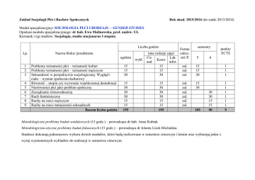 Zakład Socjologii Płci i Ruchów Społecznych Rok akad. 2015/2016 (do siatki 2013/2014) Moduł specjalizacyjny: SOCJOLOGIA PŁCI I RODZAJU – GENDER STUDIES Opiekun modułu specjalizacyjnego: dr hab. Ewa Malinowska, prof. nadzw. UŁ Kierunek i typ studiów: Socjologia, studia stacjonarne I stopnia Liczba godzin Lp. 15 15 30 inne rodzaje zajęć Ćw Lab. Konw aud infor. 15 15 30 15 30 30 30 15 15 195 15 30 30 30 15 15 195 Nazwa bloku/ przedmiotu ogółem 1 2 3 4 5 6 7 8 9 Problemy tożsamości płci – tożsamość kobiet Problemy tożsamości płci – tożsamość mężczyzn Seksualność w perspektywie socjologicznej. Wygląd i ciało – wymiar społeczno-kulturowy Równość – utopia czy wyzwanie współczesnej demokracji Nierówności płci jako problem społeczny Zarządzanie różnorodnością Ruch feministyczny Ruchy na rzecz mężczyzn Ruchy na rzecz mniejszości seksualnych Razem liczba godzin wykł semestry punkty ECTS Forma zalicz. zal./E 5 zal. zal. zal. 15 15 30 1 1 1 zal. zal. zal. zal. zal. zal. 15 30 1 1 1 1 1 1 9 105 6 30 30 15 15 90 Metodologiczne problemy badań sondażowych (15 godz.) – prowadząca dr hab. Anna Kubiak Metodologiczno-etyczne problemy badań fokusowych (15 godz.) – prowadząca dr Jolanta Lisek-Michalska. Studenci dokonują jednorazowo wyboru dwóch modułów, które będą realizowane w semestrze zimowym i letnim oraz wybierają jeden z wyżej wymienionych wykładów do realizacji w semestrze zimowym.
