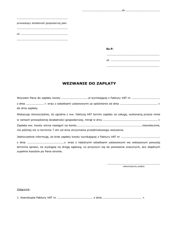 .......................................... , dn. ...................................... ......................................................... prowadzący działalność gospodarczą jako ......................................................... ul. .................................................... ......................................................... Sz.P. ........................................................... ul. ....................................................... ........................................................... WEZWANIE DO ZAPŁATY Wzywam Pana do zapłaty kwoty z dnia ..............................zł wynikającej z Faktury VAT nr ................................ .................... r. wraz z odsetkami ustawowymi za opóźnienie od dnia .......................................... r. do dnia zapłaty. Wskazuję równocześnie, że zgodnie z ww. Fakturą VAT termin zapłaty za usługę, wykonaną przeze mnie w ramach prowadzonej działalności gospodarczej, minął w dniu ............................................................. r. Zapłata ww. kwoty winna nastąpić na konto..........................................................................niezwłocznie, nie później niż w terminie 7 dni od dnia otrzymania przedmiotowego wezwania. Jednocześnie informuję, że brak zapłaty kwoty wynikającej z Faktury VAT nr z dnia ..........................................r. ............................................ wraz z należnymi odsetkami ustawowymi we wskazanym powyżej terminie sprawi, że wystąpię na drogę sądową, co przyczyni się do powstania znacznych, acz zbędnych zupełnie kosztów po Pana stronie. ........................................................... własnoręczny podpis Załącznik: 1. Kserokopia Faktury VAT nr ........................................ z dnia ............................................ r.