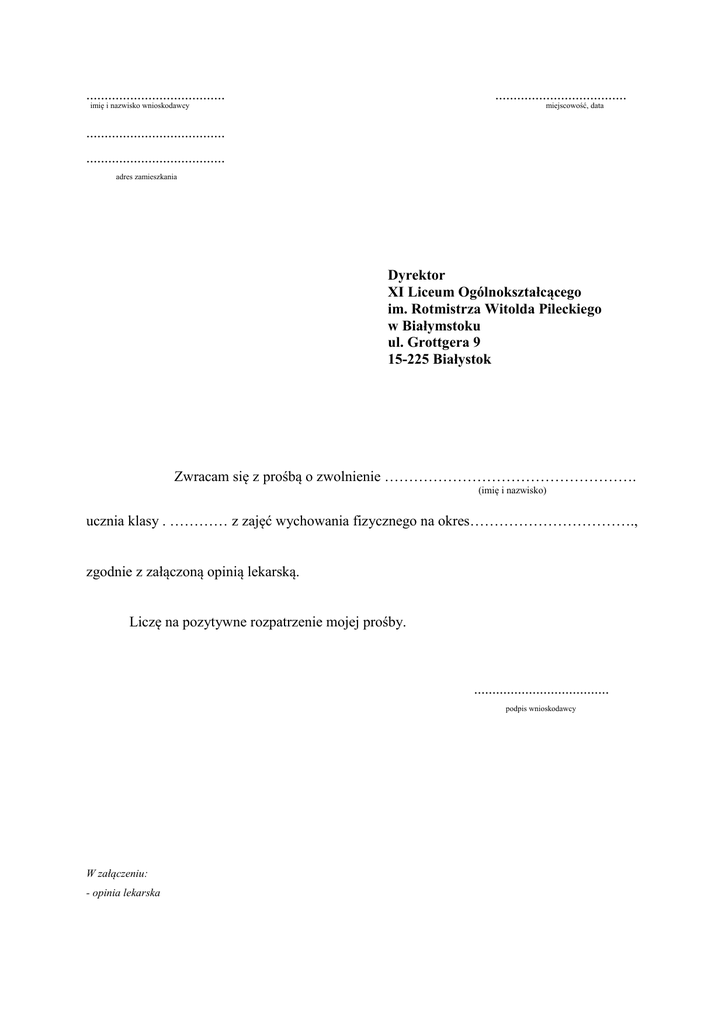 ...................................... .................................... imię i nazwisko wnioskodawcy miejscowość, data ...................................... ...................................... adres zamieszkania Dyrektor XI Liceum Ogólnokształcącego im. Rotmistrza Witolda Pileckiego w Białymstoku ul. Grottgera 9 15-225 Białystok Zwracam się z prośbą o zwolnienie ……………………………………………. (imię i nazwisko) ucznia klasy . ………… z zajęć wychowania fizycznego na okres……………………………., zgodnie z załączoną opinią lekarską. Liczę na pozytywne rozpatrzenie mojej prośby. ..................................... podpis wnioskodawcy W załączeniu: - opinia lekarska