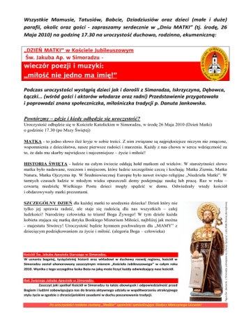 Wszystkie Mamusie, Tatusiów, Babcie, Dziadziusiów oraz dzieci (małe i duże) parafii, okolic oraz gości - zapraszamy serdecznie w „Dniu MATKI” (tj. środę, 26 Maja 2010) na godzinę 17.30 na uroczystość duchowo, rodzinno, ekumeniczną: „DZIEŃ MATKI” w Kościele Jubileuszowym Św. Jakuba Ap. w Simoradzu - wieczór poezji i muzyki: ,,miłość nie jedno ma imię!” Podczas uroczystości wystąpią dzieci jak i dorośli z Simoradza, Iskrzyczyna, Dębowca, Łączki… (wśród gości i aktorów włodarze oraz radni) Przedstawienie przygotowała i poprowadzi znana społeczniczka, miłośniczka tradycji p. Danuta Jankowska. Powtórzmy – gdzie i kiedy odbędzie się uroczystość? Uroczystość odbędzie się w Kościele Katolickim w Simoradzu, w środę 26 Maja 2010 (Dzień Matki) o godzinie 17.30 (po Mszy Świętej) MATKA - to jedno słowo ileż kryje w sobie treści. Z nim związane są najpiękniejsze niczym nie zmącone, wspomnienia z dzieciństwa, nasze pierwsze radości i marzenia. Każdy z nas chowa w sercu wdzięczność za to, że dała mu skarby największe i najcenniejsze – życie i miłość! HISTORIA ŚWIĘTA - ludzie na całym świecie oddają hołd matkom od wieków. W starożytności słowo matka było nadawane, rzeczom i miejscom, które ludzie szczególnie czczą i kochają: Matka Ziemia, Matka Natura, Matka Ojczyzna itp. W Średniowiecznej Europie było nawet święto religijne „Niedziela Matki”. W tamtych czasach ludzie w młodym wieku opuszczali domy podejmując naukę lub pracę. Raz w roku – czwartą niedzielę Wielkiego Postu dzieci mogły spędzić w domu. Odwiedzały wtedy kościół i obdarowywały matki prezentami. SZCZEGÓLNY DZIEŃ dla każdej matki to urodzenie dziecka! Dzień który nie tylko jej sprawia radość, ale staje się radością dla nas wszystkich – całej ludzkości! Narodziny człowieka to triumf Boga Żywego! W tym dziele każda kobieta stająca się matką dotyka Boskiego Misterium Miłości, najbliżej jak można - majestatu Stwórcy! Uroczystość będzie hymnem pochwalnym dla „MAMY” z dziecięcym podziękowaniem za życie i miłość. (alegoria Boga – człowieka) Kościół Św. Jakuba Apostoła Starszego w Simoradzu. W uznaniu bogatej, tysiącletniej historii oraz wkładowi w duchowy rozwój regionu, kościół w Simoradzu został uhonorowany zaszczytnym mianem „Kościoła Jubileuszowego” w całym roku 2010. Wynika z tego szczególna łaska Boża na jaką może liczyć każdy odwiedzający nasz kościół. Rok Świętego Jakuba Apostoła w Simoradzu. Zaszczyt jaki spotkał Kościół w Simoradzu to także obowiązek i odpowiedzialność przed Bogiem i ludźmi zobowiązująca nas do brania aktywnego udziału w współtworzeniu atrakcyjnego stylu życia w zgodzie z chrześcijańskimi zasadami w duchu poszanowania tradycji. Po uroczystości rozdane zostaną „Słodkie” upominki symbolizujące Słodycz Matczynego Uczucia!