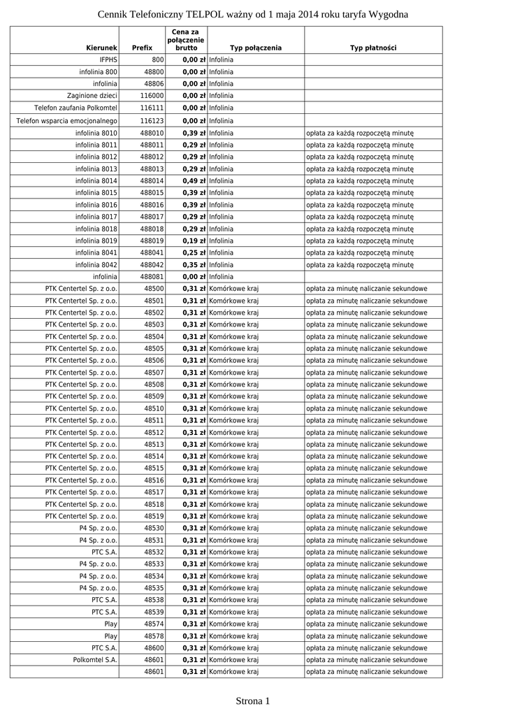 Cennik Telefoniczny TELPOL ważny od 1 maja 2014 roku taryfa