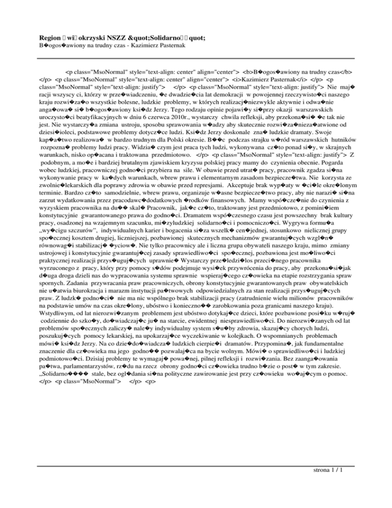 Region �wi�okrzyski NSZZ "Solidarno��quot; B�ogos�awiony na trudny czas - Kazimierz Pasternak <p class="MsoNormal" style="text-align: center" align="center"> <b>B�ogos�awiony na trudny czas</b> </p> <p class="MsoNormal" style="text-align: center" align="center"> <i>Kazimierz Pasternak</i> </p> <p class="MsoNormal" style="text-align: justify"> </p> <p class="MsoNormal" style="text-align: justify"> Nie maj� racji wszyscy ci, którzy w prze�wiadczeniu, �e dwadzie�cia lat demokracji w powojennej rzeczywisto�ci naszego kraju rozwi�za�o wszystkie bolesne, ludzkie problemy, w których realizacj�niezwykle aktywnie i odwa�nie anga�owa� si� b�ogos�awiony ksi�dz Jerzy. Tego rodzaju opinie pojawi�y si�przy okazji warszawskich uroczysto�ci beatyfikacyjnych w dniu 6 czerwca 2010r., wystarczy chwila refleksji, aby przekona�si� �e tak nie jest. Nie wystarczy�a zmiana ustroju, sposobu sprawowania w�adzy aby skutecznie rozwi�za�nieza�atwione od dziesi�ioleci, podstawowe problemy dotycz�ce ludzi. Ksi�dz Jerzy doskonale zna� ludzkie dramaty. Swoje kap�a�two realizowa� w bardzo trudnym dla Polski okresie. B��c podczas strajku w�ród warszawskich hutników rozpozna� problemy ludzi pracy. Widzia� czym jest praca tych ludzi, wykonywana cz�to ponad si�y, w skrajnych warunkach, nisko op�acana i traktowana przedmiotowo. </p> <p class="MsoNormal" style="text-align: justify"> Z podobnym, a mo�e i bardziej brutalnym zjawiskiem kryzysu polskiej pracy mamy do czynienia obecnie. Pogarda wobec ludzkiej, pracowniczej godno�ci przybiera na sile. W obawie przed utrat� pracy, pracownik zgadza si�na wykonywanie pracy w ka�dych warunkach, wbrew prawu i elementarnym zasadom bezpiecze�twa. Nie korzysta ze zwolnie�lekarskich dla poprawy zdrowia w obawie przed represjami. Akceptuje brak wyp�aty w �ci�le okre�lonym terminie. Bardzo cz�to samodzielnie, wbrew prawu, organizuje w�asne bezpiecze�two pracy, aby nie narazi� si�na zarzut wydatkowania przez pracodawc�dodatkowych �rodków finansowych. Mamy wspó�cze�nie do czynienia z wyzyskiem pracownika na du�� skal� Pracownik, jak�e cz�to, traktowany jest przedmiotowo, z pomini�iem konstytucyjnie gwarantowanego prawa do godno�ci. Dramatem wspó�czesnego czasu jest powszechny brak kultury pracy, osadzonej na wzajemnym szacunku, mi�zyludzkiej solidarno�ci i pomocniczo�ci. Wygrywa formu�a „wy�cigu szczurów”, indywidualnych karier i bogacenia si�za wszelk� cen�jednej, stosunkowo nielicznej grupy spo�ecznej kosztem drugiej, liczniejszej, pozbawionej skutecznych mechanizmów gwarantuj�cych wzgl�n� równowag�i stabilizacj� �yciow�. Nie tylko pracownicy ale i liczna grupa obywateli naszego kraju, mimo zmiany ustrojowej i konstytucyjnie gwarantuj�cej zasady sprawiedliwo�ci spo�ecznej, pozbawiona jest mo�liwo�ci praktycznej realizacji przys�uguj�cych uprawnie� Wystarczy prze�ledzi�los przeci�nego pracownika wyrzuconego z pracy, który przy pomocy s�dów podejmuje wysi�ek przywrócenia do pracy, aby przekona�si�jak d�uga droga dzieli nas do wypracowania systemu sprawnie wspieraj�cego cz�owieka na etapie rozstrzygania spraw spornych. Zadania przywracania praw pracowniczych, obrony konstytucyjnie gwarantowanych praw obywatelskich nie u�atwia biurokracja i marazm instytucji pa�twowych odpowiedzialnych za stan realizacji przys�uguj�cych praw. Z ludzk� godno�ci� nie ma nic wspólnego brak stabilizacji pracy (zatrudnienie wielu milionów pracowników na podstawie umów na czas okre�lony, ubóstwo i konieczno�� zarobkowania poza granicami naszego kraju). Wstydliwym, od lat nierozwi�zanym problemem jest ubóstwo dotykaj�ce dzieci, które pozbawione posi�ku w�ruj� codziennie do szko�y, do�wiadczaj�c ju� na starcie, ewidentnej niesprawiedliwo�ci. Do nierozwi�zanych od lat problemów spo�ecznych zaliczy� nale�y indywidualny system s�u�by zdrowia, skazuj�cy chorych ludzi, poszukuj�cych pomocy lekarskiej, na upokarzaj�ce wyczekiwanie w kolejkach. O wspomnianych problemach mówi� ksi�dz Jerzy. Na co dzie�do�wiadcza� ludzkich cierpie�i dramatów. Przypomina�, jak fundamentalne znaczenie dla cz�owieka ma jego godno�� pozwalaj�ca na bycie wolnym. Mówi� o sprawiedliwo�ci i ludzkiej podmiotowo�ci. Dzisiaj problemy te wymagaj� powa�nej, pilnej refleksji i rozwi�zania. Bez zaanga�owania pa�twa, parlamentarzystów, rz�du na rzecz obrony godno�ci cz�owieka trudno b�zie o post� w tym zakresie. „Solidarno���� stale, bez ogl�dania si�na polityczne zawirowanie jest przy cz�owieku wo�aj�cym o pomoc. </p> <p class="MsoNormal"> </p> <p> strona 1 / 1