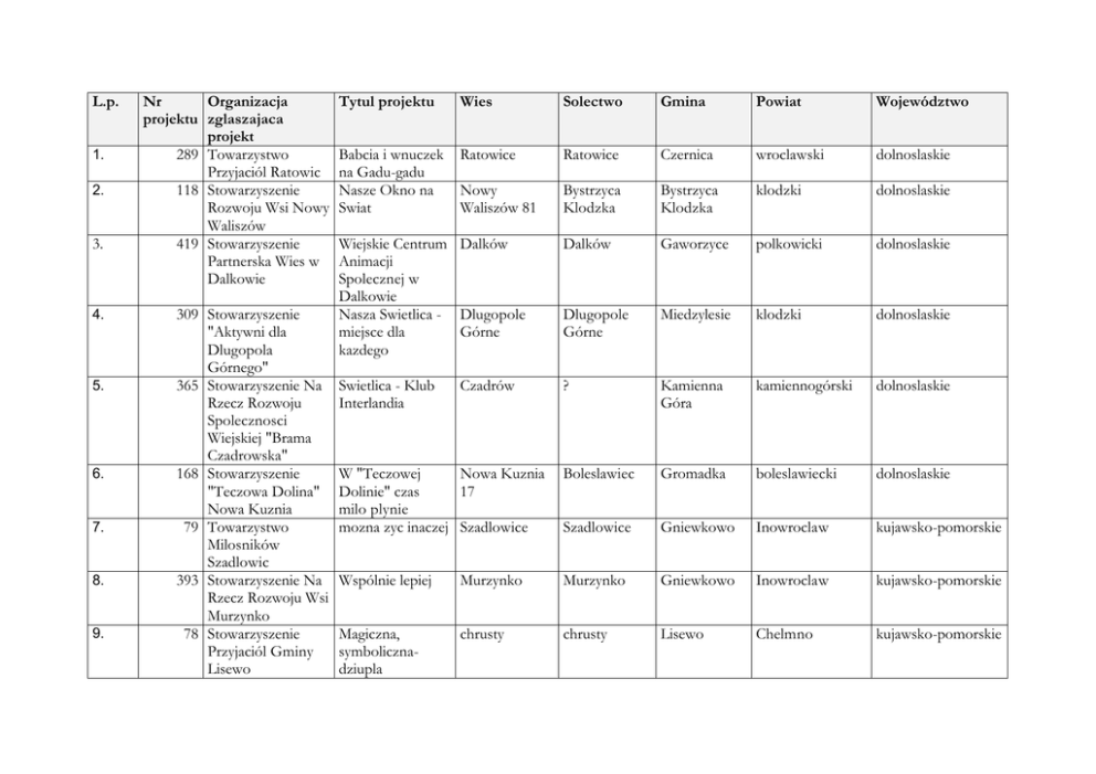 L.p. 1. 2. 3. 4. 5. 6. 7. 8. 9. Nr Organizacja projektu zglaszajaca projekt 289 Towarzystwo Przyjaciól Ratowic 118 Stowarzyszenie Rozwoju Wsi Nowy Waliszów 419 Stowarzyszenie Partnerska Wies w Dalkowie 309 Stowarzyszenie "Aktywni dla Dlugopola Górnego" 365 Stowarzyszenie Na Rzecz Rozwoju Spolecznosci Wiejskiej "Brama Czadrowska" 168 Stowarzyszenie "Teczowa Dolina" Nowa Kuznia 79 Towarzystwo Milosników Szadlowic 393 Stowarzyszenie Na Rzecz Rozwoju Wsi Murzynko 78 Stowarzyszenie Przyjaciól Gminy Lisewo Tytul projektu Wies Solectwo Gmina Powiat Województwo Babcia i wnuczek na Gadu-gadu Nasze Okno na Swiat Ratowice Ratowice Czernica wroclawski dolnoslaskie Nowy Waliszów 81 Bystrzyca Klodzka Bystrzyca Klodzka klodzki dolnoslaskie Wiejskie Centrum Dalków Animacji Spolecznej w Dalkowie Nasza Swietlica - Dlugopole miejsce dla Górne kazdego Dalków Gaworzyce polkowicki dolnoslaskie Dlugopole Górne Miedzylesie klodzki dolnoslaskie Swietlica - Klub Interlandia ? Kamienna Góra kamiennogórski dolnoslaskie W "Teczowej Nowa Kuznia Dolinie" czas 17 milo plynie mozna zyc inaczej Szadlowice Boleslawiec Gromadka boleslawiecki dolnoslaskie Szadlowice Gniewkowo Inowroclaw kujawsko-pomorskie Wspólnie lepiej Murzynko Murzynko Gniewkowo Inowroclaw kujawsko-pomorskie Magiczna, symbolicznadziupla chrusty chrusty Lisewo Chelmno kujawsko-pomorskie Czadrów L.p. Nr Organizacja projektu zglaszajaca projekt Tytul projektu Wies Solectwo Gmina Powiat Województwo Nowa swietlica w Bladowo 81 starej szkole Tuchola Tuchola Tuchola kujawsko-pomorskie Razem mozemy wiecej Trzeciewiec Trzeciewiec Dobrcz bydgoski kujawsko-pomorskie Zapiecek Wola Osowinska ul. 22 Lipca 29 ul. Rynek 10 Wola Osowinska Borki radzynski lubelskie Wisznice Wisznice bialski lubelskie Z przeszloscia w przyszlosc Wereszczyn Wereszczyn Urszulin Wlodawa lubelskie Swietlica pod basniowym ptaszkiem Zahajki Zahajki Wyryki Wlodawa lubelskie Racula Zielona Góra Zielona Góra informacyjna 10. 11. 12. 13. 14. 15. 16. 117 Stowarzyszenie Rozwoju solectwa Bladowo - "Blask" 282 Towarzystwo Rozwoju miny Dobrcz 148 Towarzystwo Regionalne w Woli Osowinskiej 104 Stowarzyszenie "Forum Rozwoju Regionu" w Wisznicach 74 Stowarzyszenie Wereszczynski Gosciniec 85 Stowarzyszenie Edukacji Regionalnej i Integracji kultur i spolecznosci 130 Stowarzyszenie Na Rzecz Rozwoju Wsi Drzonków Utworzenie swietlicy we wsi Wygoda Otwarte drzwi Drzonków ul. wiedza, inicjatywa, Sloneczna 7 twórczosc lubelskie L.p. 17. 18. 19. 20. 21. 22. 23. Nr Organizacja projektu zglaszajaca projekt 149 Stowarzyszenie Na Rzecz Wspierania i Rozwoju Wsi Lubelskiej 369 OSP Jablonów 20 Stowarzyszenie ekorozwoju (rozwoju) wsi Niekarzyn "Ekosloneczko" 318 Stowarzyszenie Wspierania Aktywnosci Lokalnej Górek Noteckich oraz Mieszkanców Brzezinki i Przysieki 216 Stowarzyszenie "Wies bez barier" Debowa Leka 459 Stowarzyszenie Na Rzecz Promocki Wsi Racula 124 Stowarzyszenie na rzecz rozwoju gminy Nowe Ostrowy Tytul projektu Wies Solectwo Gmina Powiat Województwo Wspólna sprawa Zaliszcze Podedwórze Podedwórze parczewski lubelskie Na tapczanie siedzi len nasza swietlica swietlikiem wsi Jablonów Jablonów Brzeznica Zagan lubuskie Niekarzyn Niekarzyn Skape Swiebodzin lubuskie Swietlica sercem naszej wsi Górki Noteckie Górki Noteckie Zwierzyn strzeleckodezdenecki lubuskie Swietlica Centrum Naszej Wsi Nasz swietlica w Raculi Debowa Leka Debowa Leka Wschowa wschowski lubuskie Racula Racula Zielona Góra zielonogórski lubuskie Wspólnie, aktywnie i twórczo w naszej swietlicy Ostrowy Cukrownia 15 Ostrowy Nowe Ostrowy lódzkie kutnowski L.p. 24. 25. 26. 27. 28. 29. 30. 31. 32. Nr Organizacja projektu zglaszajaca projekt 380 Stowarzyszenie Przyjaciól Baldrzychowa 173 OSP Rudka 25 Stowarzyszenie Wspierania Aktywnosci Lokalnej w Stregoborzycach 353 Stowarzyszenie Milosników Urli 19 Opinogórskie Stowarzyszenie Inicjatyw Spolecznych 56 OSP Mistów 412 Stowarzyszenie Jestesmy Razem 30 Stowarzyszenie Odnowy Wsi Sporok 324 Fundacja "Klub Inwencji Kulturalnych i Spolecznych Mlodziezy" Odrzechowa Tytul projektu Wies Solectwo Gmina Powiat Województwo Nie marnuj czasu, Baldrzychów przyjdz do nas Baldrzychów Poddebice Poddebice lódzkie Szanse mamy, rade damy ? Rudka 20 Wielgomlyny Wielgomlyny radomszczanski Stregoborzyce Stregoborzyce IgolomiaKraków wawrzenczyce malopolskie Koniec z nuda Urle Urle Jadów wolominski mazowieckie Swietlica wiejska w Palukach Paluki Paluki Opinogóra Górna Ciechanów mazowieckie Klub u strazaków Mistów Mistów Jakubów w Mistowie Z internetem Garczyn Duzy Garczyn Duzy Kaluszyn latwiej Razem mozemy Sporok Sporok kolonowskie wiele Minsk mazowieckie minski mazowieckie Strzelce opolskie Z dala od zagrozen - blizej ludzi sanocki podkarpackie Odrzechowa Odrzechowa Zarszyn lódzkie L.p. 33. 34. 35. Nr Organizacja projektu zglaszajaca projekt 224 Stowarzyszenie Kultywowania Kultury i Tradycji Ziemi Futomskiej 523 Parafia Rzymskokatolicka p.w. Podwyzszenia Krzyza Swietego w Jaszczowi 386 OSP Srednia Wies 36. 436 37. 160 38. 327 39. 397 40. 41. 483 504 42. 237 Tytul projektu Wies Solectwo Gmina Powiat Województwo Futomski Klub Animatora "Tecza" Futoma Futoma Blazowa rzeszowski podkarpackie Jaszczew Jaszczew Jedlicze krosnienski podkarpackie Srednia wies Srednia Wies Lesko leski podkarpackie Górki Górki Brzozów Brzozów podkarpackie Stowarzyszenie Bachórz Kobiet Wsi Bachórz Dzwonowa Dzwonowa Dynów rzeszowski podkarpackie Jodlowa debicki podkarpackie Kunkowce Kunkowce Przemysl przemyski podkarpackie Klichy Zawyki Zawyki Bransk Suraz bielski bialostocki podlaskie podlaskie Gorzedziej Gorzedziej Subkowy tczewski pomorskie Miedzy pokoleniowe miejsce spotkan z nowa technologia w tle Nasz Klub w Sredniej Wsi nasza wartosc Stowarzyszenie Na Swietlica Erudyta Rzecz Rozwoju Wsi w Górkach Górki szansa na "Lepsze jutro" Stowarzyszenie Bachórska eKobiet Wsi swietlica Bachórz Stowarzyszenie Sprawdz co KGW Dzwonowa slychac w internecie SKS Kunkowce Klub mlodziezowy w Kunskowcach OSP Klic