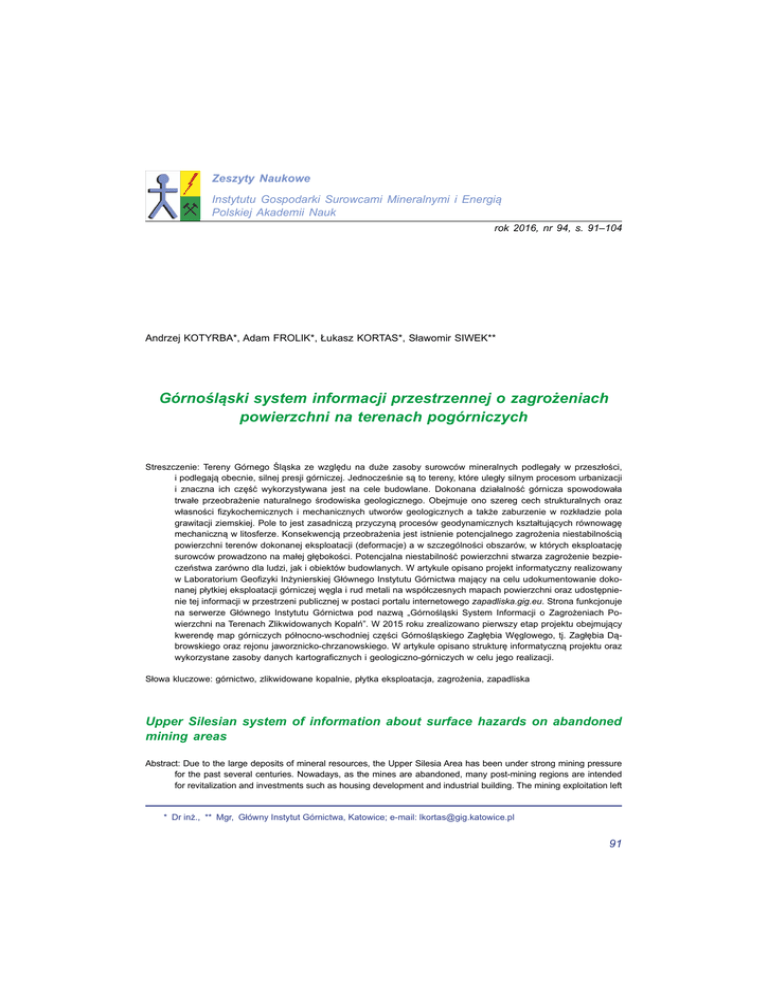Zeszyty Naukowe Instytutu Gospodarki Surowcami Mineralnymi i Energią Polskiej Akademii Nauk rok 2016, nr 94, s. 91–104 Andrzej KOTYRBA*, Adam FROLIK*, Łukasz KORTAS*, Sławomir SIWEK** Górnośląski system informacji przestrzennej o zagrożeniach powierzchni na terenach pogórniczych Streszczenie: Tereny Górnego Śląska ze względu na duże zasoby surowców mineralnych podlegały w przeszłości, i podlegają obecnie, silnej presji górniczej. Jednocześnie są to tereny, które uległy silnym procesom urbanizacji i znaczna ich część wykorzystywana jest na cele budowlane. Dokonana działalność górnicza spowodowała trwałe przeobrażenie naturalnego środowiska geologicznego. Obejmuje ono szereg cech strukturalnych oraz własności fizykochemicznych i mechanicznych utworów geologicznych a także zaburzenie w rozkładzie pola grawitacji ziemskiej. Pole to jest zasadniczą przyczyną procesów geodynamicznych kształtujących równowagę mechaniczną w litosferze. Konsekwencją przeobrażenia jest istnienie potencjalnego zagrożenia niestabilnością powierzchni terenów dokonanej eksploatacji (deformacje) a w szczególności obszarów, w których eksploatację surowców prowadzono na małej głębokości. Potencjalna niestabilność powierzchni stwarza zagrożenie bezpieczeństwa zarówno dla ludzi, jak i obiektów budowlanych. W artykule opisano projekt informatyczny realizowany w Laboratorium Geofizyki Inżynierskiej Głównego Instytutu Górnictwa mający na celu udokumentowanie dokonanej płytkiej eksploatacji górniczej węgla i rud metali na współczesnych mapach powierzchni oraz udostępnienie tej informacji w przestrzeni publicznej w postaci portalu internetowego zapadliska.gig.eu. Strona funkcjonuje na serwerze Głównego Instytutu Górnictwa pod nazwą „Górnośląski System Informacji o Zagrożeniach Powierzchni na Terenach Zlikwidowanych Kopalń”. W 2015 roku zrealizowano pierwszy etap projektu obejmujący kwerendę map górniczych północno-wschodniej części Górnośląskiego Zagłębia Węglowego, tj. Zagłębia Dąbrowskiego oraz rejonu jaworznicko-chrzanowskiego. W artykule opisano strukturę informatyczną projektu oraz wykorzystane zasoby danych kartograficznych i geologiczno-górniczych w celu jego realizacji. Słowa kluczowe: górnictwo, zlikwidowane kopalnie, płytka eksploatacja, zagrożenia, zapadliska Upper Silesian system of information about surface hazards on abandoned mining areas Abstract: Due to the large deposits of mineral resources, the Upper Silesia Area has been under strong mining pressure for the past several centuries. Nowadays, as the mines are abandoned, many post-mining regions are intended for revitalization and investments such as housing development and industrial building. The mining exploitation left * Dr inż., ** Mgr, Główny Instytut Górnictwa, Katowice; e-mail: [email protected] 91 transformations in the natural geological environment which have an impact on the geotechnical conditions. This includes a number of structural, physico-chemical and mechanical features of geological formations as well as disturbances in the distribution of the Earth’s gravity field. This field is the principal cause of geodynamic processes affecting the mechanical equilibrium in the lithosphere. As a consequence of mining exploitation in post mining areas surface deformations may occur, especially in places where mine extraction was conducted on a low depths. Potential surface hazards determine the safety for civil and building engineering. The main goal of the project which is developed in the Central Mining Institute is to record the areas of old shallow (up to 100 m) coal and ore exploitation on present cartographical maps. The results of the work will be presented on the website (zapadliska. gig.eu) working on the Central Mining Institute’s server. The first stage of the project focused on collecting the data from the North-East part of Upper Silesia was conducted in 2015. The structure of the project’s website and used resources of cartographical, geological and mining data has been described in the article. Keywords: mining, abandoned mines, shallow exploitation, surface hazards Wprowadzenie Eksploatacja górnicza kopalin wpływa w sposób trwały na środowisko, a w szczególności na powierzchnię terenu i górotwór. Charakter i skala wpływu zależy od warunków geologiczno-górniczych terenu górniczego, w tym od rodzajów skał, ich właściwości i sposobu zalegania, warunków hydrogeologicznych, metody i głębokości eksploatacji, rodzaju i miąższości wydobywanej kopaliny (Kotyrba 2005a, 2005b; Pilecki i Kotyrba 2007; Didier i in. 2008; Dobak i in. 2009; Frolik i Kotyrba 2015). Podziemna eksploatacja kopalin powoduje znaczne przeobrażenie struktury i własności przypowierzchniowych warstw górotworu, co stwarza zagrożenie wystąpienia ich niestabilności nawet w bardzo odległym czasie od zakończenia robót górniczych. Pozostawia też w płytkich warstwach geologicznych relikty działalności górniczej takie jak szyby, sztolnie, komory technologiczne itp., które mogą być źródłem analogicznego zagrożenia. Analiza takiego zagrożenia jest szczególnie istotna przy budowlanym wykorzystaniu terenów pogórniczych, gdyż stara infrastruktura górnicza stwarza zagrożenie utraty stateczności podłoża obiektów budowlanych. Szczególnie groźne jest zagrożenie deformacjami nieciągłymi, związane zwłaszcza ze stosowanymi dawniej chodnikowymi i filarowo-zabierkowymi systemami eksploatacji węgla i rud cynkowo-ołowiowych. Na podstawie zebranych danych można stwierdzić, że zdecydowana większość powstałych zapadlisk terenu miała miejsce w przypadku prowadzenia eksploatacji na głębokości mniejszej niż 100 m. Przy większej głębokości eksploatacji prawdopodobieństwo wystąpienia deformacji nieciągłej terenu wyraźnie maleje. W tym kontekście informacja górnicza dotycząca płytkiej eksplo