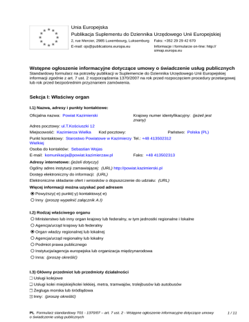 Unia Europejska Publikacja Suplementu do Dziennika Urzędowego Unii Europejskiej 2, rue Mercier, 2985 Luxembourg, Luksemburg Faks: +352 29 29 42 670 E-mail: [email protected] Informacje i formularze on-line: http:// simap.europa.eu Wstępne ogłoszenie informacyjne dotyczące umowy o świadczenie usług publicznych Standardowy formularz na potrzeby publikacji w Suplemencie do Dziennika Urzędowego Unii Europejskiej informacji zgodnie z art. 7 ust. 2 rozporządzenia 1370/2007 na rok przed rozpoczęciem procedury przetargowej lub rok przed bezpośrednim przyznaniem zamówienia. Sekcja I: Właściwy organ I.1) Nazwa, adresy i punkty kontaktowe: Krajowy numer identyfikacyjny: (jeżeli jest znany) _____ Oficjalna nazwa: Powiat Kazimierski Adres pocztowy: ul.T.Kościuszki 12 Miejscowość: Kazimierza Wielka Kod pocztowy: _____ Państwo: Polska (PL) Punkt kontaktowy: Starostwo Powiatowe w Kazimierzy Tel.: +48 413502312 Wielkiej Osoba do kontaktów: Sebastian Wojas E-mail: [email protected] Faks: +48 413502313 Adresy internetowe: (jeżeli dotyczy) Ogólny adres instytucji zamawiającej: (URL) http://powiat.kazimierski.pl Dostęp elektroniczny do informacji: (URL) _____ Elektroniczne składanie ofert i wniosków o dopuszczenie do udziału: (URL) _____ Więcej informacji można uzyskać pod adresem Powyższy(-e) punkt(-y) kontaktowy(-e) Inny (proszę wypełnić załącznik A.I) I.2) Rodzaj właściwego organu Ministerstwo lub inny organ krajowy lub federalny, w tym jednostki regionalne i lokalne Agencja/urząd krajowy lub federalny Organ władzy regionalnej lub lokalnej Agencja/urząd regionalny lub lokalny Podmiot prawa publicznego Instytucja/agencja europejska lub organizacja międzynarodowa Inna: (proszę określić) I.3) Główny przedmiot lub przedmioty działalności Usługi kolejowe Usługi kolei miejskiej/kolei lekkiej, metra, tramwajów, trolejbusów lub autobusów Żegluga morska lub śródlądowa Inny: (proszę określić) PL Formularz standardowy T01 - 1370/07 – art. 7 ust. 2 - Wstępne ogłoszenie informacyjne dotyczące umowy o świadczenie usług publicznych 1 / 11 administracja publiczna I.4) Udzielenie zamówienia w imieniu innych właściwych organów Właściwy organ dokonuje zakupu w imieniu innych właściwych organów: tak nie (jeżeli tak, więcej informacji o tych właściwych organach można podać w załączniku A.II) PL Formularz standardowy T01 - 1370/07 – art. 7 ust. 2 - Wstępne ogłoszenie informacyjne dotyczące umowy o świadczenie usług publicznych 2 / 11 Sekcja II: Przedmiot zamówienia II.1) Opis: II.1.1) Nazwa nadana zamówieniu: Świadczenie usług publicznych w zakresie wykonywania powiatowych przewozów pasażerskich na terenie Powiatu Kazimierskiego na warunkach określonych w art. 7 ust.3 ustawy o publicznym transporcie zbiorowym II.1.2) Rodzaj zamówienia, dziedzina(-y), której(-ych) dotyczą usługi transportu publicznego: Kategoria usług: nr: T-05 (Zob. kategorie usług w załączniku B) Dziedziny, których dotyczą usługi transportu publicznego: transport pasażerki Kod NUTS: PL332 II.1.3) Krótki opis zamówienia: Dokonanie wyboru operatora w trybie art. 19 ust. 1 pkt 2 ustawy o publicznym transporcie zbiorowym tj. z 9 stycznia 2009 roku o koncesji na roboty budowlane lub usługi ( Dz.U. z 2015r. poz. 113 ) na sieć komunikacyjną w transporcie drogowym Powiatu Kazimierskiego II.1.4) Wspólny Słownik Zamówień (CPV) Główny przedmiot Słownik główny 60112000 Słownik uzupełniający (jeżeli dotyczy) II.1.5) Informacje na temat podwykonawstwa Przewidywane jest zlecenie podwykonawstwa: tak nie (jeżeli tak) Wartość lub część zamówienia, które prawdopodobnie będzie zlecone stronom trzecim: minimalny procent: _____ (%), maksymalny procent: _____ (%) wartości zamówienia albo Nieznana Krótki opis wartości/części zamówienia, które będzie zlecone podwykonawcom: _____ II.2) Ilość i/lub wartość usług Opis: _____ km usług publicznych w zakresie transportu pasażerskiego: _____ Szacunkowy koszt bez VAT: (proszę podać wyłącznie dane liczbowe) _____ albo Zakres: między _____ i _____ Waluta: Waluta: II.3) Planowana data rozpoczęcia i czas trwania zamówienia lub termin realizacji Rozpoczęcie: 01/01/2017 (dd/mm/rrrr) Okres w miesiącach: 24 albo w dniach: _____ (od udzielenia zamówienia) PL Formularz standardowy T01 - 1370/07 – art. 7 ust. 2 - Wstępne ogłoszenie informacyjne dotyczące umowy o świadczenie usług publicznych 3 / 11 Sekcja III: Informacje o charakterze prawnym, ekonomicznym, finansowym i technicznym III.1) Warunki dotyczące zamówienia: III.1.1) Parametry kosztów w celu obliczenia rekompensaty: _____ III.1.2) Informacje o wyłącznych prawach: Przyznano wyłączne prawa tak nie (jeżeli tak) Wyszczególnienie przyznanych wyłącznych praw: _____ III.1.3) Podział przychodów ze sprzedaży biletów: Odsetek przydzielony podmiotowi świadczącemu usługi publiczne: _____ (%) (uznaje się, że pozostała część jest przyznawana właściwemu organowi) III.1.4) Standardy socjalne: (przejęcie personelu zgodnie z dyrektywą 2001/23/WE) Wykaz wymaganych standardów (w tym lista pracowników, których to dotyczy, szczegółowe informacje na temat umownych praw i zobowiązań pracowników oraz warunków, na jakich pracowników uznaje się za związanych ze świadczonymi usługami): _____ III.1.5) Zobowiązania do świadczenia usług publicznych: Wyszczególnienie: _____ III.1.6) Inne szczególne warunki: Wykonanie zamówienia podlega szczególnym warunkom (jeżeli tak) Opis szczególnych warunków: _____ tak nie III.2) Warunki udziału: III.2.1) Zdolność ekonomiczna i finansowa: Informacje i formalności konieczne do dokonania oceny Minimalny poziom ewentualnie wymaganych spełniania wymogów: standardów: _____ _____ III.2.2) Wymagania techniczne: Informacje i formalności konieczne do dokonania oceny Minimalny poziom ewentualnie wymaganych spełniania wymogów: standardów: _____ _____ III.3) Cele w zakr