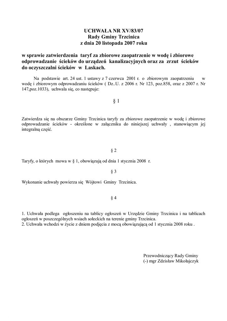 UCHWAŁA NR XV/83/07 Rady Gminy Trzcinica z dnia 20 listopada 2007 roku w sprawie zatwierdzenia taryf za zbiorowe zaopatrzenie w wodę i zbiorowe odprowadzanie ścieków do urządzeń kanalizacyjnych oraz za zrzut ścieków do oczyszczalni ścieków w Laskach. Na podstawie art. 24 ust. 1 ustawy z 7 czerwca 2001 r. o zbiorowym zaopatrzeniu w wodę i zbiorowym odprowadzaniu ścieków ( Dz..U. z 2006 r. Nr 123, poz.858, oraz z 2007 r. Nr 147,poz.1033), uchwala się, co następuje: §1 Zatwierdza się na obszarze Gminy Trzcinica taryfy za zbiorowe zaopatrzenie w wodę i zbiorowe odprowadzanie ścieków - określone w załączniku do niniejszej uchwały , stanowiącym jej integralną część. §2 Taryfy, o których mowa w § 1, obowiązują od dnia 1 stycznia 2008 r. §3 Wykonanie uchwały powierza się Wójtowi Gminy Trzcinica. §4 1. Uchwała podlega ogłoszeniu na tablicy ogłoszeń w Urzędzie Gminy Trzcinica i na tablicach ogłoszeń w poszczególnych wsiach sołeckich na terenie gminy Trzcinica. 2. Uchwała wchodzi w życie z dniem podjęcia z mocą obowiązującą od 1 stycznia 2008 roku . Przewodniczący Rady Gminy (-) mgr Zdzisław Mikołajczyk Załącznik do uchwały Nr XV/83/07 Rady Gminy Trzcinica z dnia 20 listopada 2007 r. w sprawie zatwierdzenia taryf za zbiorowe zaopatrzenie w wodę i zbiorowe odprowadzanie ścieków do urządzeń kanalizacyjnych oraz za zrzut ścieków do oczyszczalni ścieków w Laskach. I. Taryfa za zbiorowe zaopatrzenie w wodę z urządzeń stanowiących składnik mienia komunalnego Gminy Trzcinica: 1) 1,75 zł netto - za m3 wody używanej do celów bytowych, 2) 1,75 zł netto - za m3 wody używanej do celów związanych z działalnością gospodarczą, II. Taryfa za zbiorowe odprowadzanie ścieków 1) do urządzeń kanalizacyjnych stanowiących składnik mienia komunalnego Gminy Trzcinica: a) 1,95 zł netto - za m3 ścieków do celów na działalność gospodarczą, b) 1,95 zł netto - za m3 ścieków dla pozostałych użytkowników kanalizacji. 2) dowożonych i odprowadzanych do zlewni nieczystości płynnych usytuowanej na Oczyszczalni Ścieków w Laskach a) 1,30 zł netto - za m3 ścieków dla mieszkańców Gminy Trzcinica, b) 4,00 zł netto - za m3 ścieków dla osób dowożących ścieki z poza terenu Gminy Trzcinica. III. Opłata abonamentowa za wodomierze - 2,00 zł netto. Przewodniczący Rady Gminy (-) mgr Zdzisław Mikołajczyk