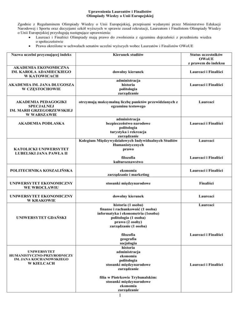Uprawnienia Laureatów i Finalistów Olimpiady Wiedzy o Unii Europejskiej Zgodnie z Regulaminem Olimpiady Wiedzy o Unii Europejskiej, przepisami wydanymi przez Ministerstwo Edukacji Narodowej i Sportu oraz decyzjami szkół wyższych w sprawie zasad rekrutacji, Laureatom i Finalistom Olimpiady Wiedzy o Unii Europejskiej przysługują następujące uprawnienia: Laureaci i Finaliści Olimpiady mają prawo do zwolnienia z egzaminu dojrzałości z przedmiotu wiedza o społeczeństwie Prawa określone w uchwałach senatów uczelni wyższych wobec Laureatów i Finalistów OWoUE Nazwa uczelni przyznającej indeks Kierunek studiów Status uczestników OWoUE z prawem do indeksu AKADEMIA EKONOMICZNA IM. KAROLA ADAMIECKIEGO W KATOWICACH dowolny kierunek Laureaci i Finaliści AKADEMIA IM. JANA DŁUGOSZA W CZĘSTOCHOWIE administracja historia politologia zarządzanie AKADEMIA PEDAGOGIKI SPECJALNEJ IM. MARII GRZEGORZEWSKIEJ W WARSZAWIE AKADEMIA PODLASKA KATOLICKI UNIWERSYTET LUBELSKI JANA PAWŁA II otrzymują maksymalną liczbę punktów przewidzianych z egzaminu testowego administracja bezpieczeństwo narodowe politologia turystyka i rekreacja zarządzanie Kolegium Międzywydziałowych Indywidualnych Studiów Humanistycznych prawo Laureaci i Finaliści Laureaci Laureaci i Finaliści Laureaci filozofia kulturoznawstwo Laureaci i Finaliści POLITECHNIKA KOSZALIŃSKA ekonomia zarządzanie i marketing Laureaci i Finaliści UNIWERSYTET EKONOMICZNY WE WROCŁAWIU stosunki międzynarodowe Finaliści UNIWERSYTET EKONOMICZNY W KRAKOWIE dowolny kierunek Laureaci historia (1 osoba) finanse i rachunkowość (1 osoba) informatyka i ekonometria (1osoba) politologia (1 osoba) prawo (2 osoby) zarządzanie (1 osoba) Laureaci filozofia geografia socjologia historia administracja ekonomia politologia stosunki międzynarodowe zarządzanie Laureaci i Finaliści UNIWERSYTET GDAŃSKI UNIWERSYTET HUMANISTYCZNO-PRZYRODNICZY IM. JANA KOCHANOWSKIEGO W KIELCACH filia w Piotrkowie Trybunalskim: stosunki międzynarodowe ekonomia zarządzanie 1 Laureaci i Finaliści UNIWERSYTET IM. ADAMA MICKIEWICZA W POZNANIU UNIWERSYTET JAGIELLOŃSKI UNIWERSYTET KARDYNAŁA STEFANA WYSZYŃSKIEGO W WARSZAWIE europeistyka politologia dziennikarstwo i komunikacja społeczna stosunki międzynarodowe politologia (Collegium Polonicum w Słubicach, Kolegium Europejskie w Gnieźnie, Kolegium w Kościanie, Ośrodek zamiejscowy w Ostrowie Wlk., Filia UAM w Pile) Międzykierunkowe Indywidualne Studia Humanistyczne (Kolegium Europejskie w Gnieźnie) filologia węgierska studia biologiczno-geograficzne europeistyka (studia stacjonarne i niestacjonarne I stopnia) europeistyka (niemcoznawstwo I stopnia) Wydział Teologiczny Wydział Prawa Kanonicznego historia (5 osób) politologia (5 osób) socjologia (5 osób) stosunki międzynarodowe UNIWERSYTET KAZIMIERZA WIELKIEGO W BYDGOSZCZY UNIWERSYTET ŁÓDZKI UNIWERSYTET MARII CURIE-SKŁODOWSKIEJ UNIWERSYTET MIKOŁAJA KOPERNIKA UNIWERSYTET OPOLSKI UNIWERSYTET PEDAGOGICZNY IM. KOMISJI EDUKACJI NARODOWEJ W KRAKOWIE administracja dziennikarstwo i komunikacja społeczna historia politologia stosunki międzynarodowe europeistyka Laureaci Laureaci Laureaci i Finaliści Laureaci Laureaci i Finaliści Laureaci i Finaliści zwolnienie z częściowego postępowania kwalifikacyjnego na inne kierunki, zobowiązani są do złożenia egzaminu z wybranego języka obcego studia filozoficzno-historyczne politologia stosunki międzynarodowe dziennikarstwo i komunikacja społeczna Laureaci Międzywydziałowe Indywidualne Studia Humanistyczne Laureaci Finaliści co najmniej dwóch wymienionych przez UMCS olimpiad Laureaci archiwistyka i zarządzanie dokumentacją historia Międzywydziałowe Indywidualne Studia Humanistyczne politologia dziennikarstwo i komunikacja społeczna Laureaci socjologia ( 3 osoby) stosunki międzynarodowe (3 osoby, w przypadku większej liczby kandydatów – wyższa liczba punktów na świadectwie dojrzałości z przedmiotów branych pod uwagę w postępowaniu kwalifikacyjnym) Laureaci i Finaliści politologia stosunki międzynarodowe Laureaci administracja pedagogika pedagogika specjalna politologia praca socjalna stosunki międzynarodowe UNIWERSYTET RZESZOWSKI historia prawo 2 Laureaci i Finaliści Laureaci i Finaliści UNIWERSYTET SZCZECIŃSKI UNIWERSYTET ŚLĄSKI UNIWERSYTET WARMIŃSKO-MAZURSKI W OLSZTYNIE UNIWERSYTET WARSZAWSKI UNIWERSYTET W BIAŁYMSTOKU europeistyka (Wydział Humanistyczny-1 osoba) politologia (1osoba) Laureaci pedagogika (wszystkie specjalności) prawo ekonomia finanse i rachunkowość informatyka i ekonometria zarządzanie Laureaci i Finaliści Najwyższa ilość punktów uzyskana z WOS-u (w algorytmie „W”) na kierunkach realizowanych na Wydziale Zarządzania i Ekonomiki Usług Laureaci i Finaliści Międzywydziałowe Indywidualne Studia Humanistyczne Laureaci (do 6 miejsca) geografia geologia geologia (spec. geofizyka) pedagogika (Cieszyn) informacja naukowa i bibliotekarstwo Laureaci i Finaliści politologia socjologia Laureaci i Finaliści (do 5% limitu przyjęć, o przyjęciu decyduje zajęte miejsce w Olimpiadzie) zarządzanie i marketing Laureaci dziennikarstwo i komunikacja społeczna historia nauki o rodzinie prawo politologia stosunki międzynarodowe teologia dziennikarstwo i komunikacja społeczna fizyka astronomia geografia gospodarka przestrzenna etnologia kulturoznawstwo matematyka filologia polska filologia nowogrecka studia międzykierunkowe Laureaci i Finaliści politologia bezpieczeństwo wewnętrzne polityka społeczna europeistyka stosunki międzynarodowe informacja naukowa i bibliotekoznawstwo informatyka profilaktyka społeczna i resocjalizacja praca socjalna Laureaci i Finaliści historia socjologia stosunki międzynarodowe pedagogika zarządzanie organizacjami publicznymi zarządzanie przedsiębiorstwem 3 Laureaci Laureaci i Finaliści UNIWERSYTET WROCŁAWSKI UNIWERSYTET ZIELONOGÓRSKI administracja ekonomia europeistyka filozofia historia politologia prawo stos