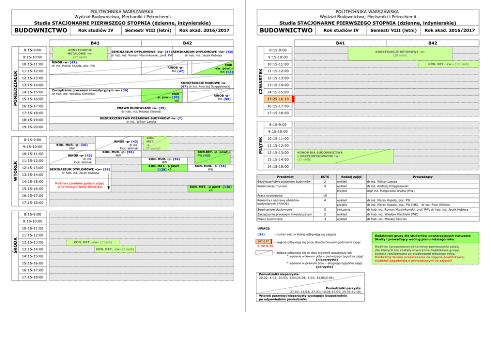 POLITECHNIKA WARSZAWSKA Wydział Budownictwa, Mechaniki i Petrochemii POLITECHNIKA WARSZAWSKA Wydział Budownictwa, Mechaniki i Petrochemii Studia STACJONARNE PIERWSZEGO STOPNIA (dzienne, inżynierskie) Studia STACJONARNE PIERWSZEGO STOPNIA (dzienne, inżynierskie) Rok studiów IV Semestr VIII (letni) Rok akad. 2016/2017 B41 8:15-9:00 9:15-10:00 PONIEDZIAŁEK 10:15-11:00 KONSTRUKCJE METALOWE -w(27 osób) RiNOB -pMK (47) EBiK -ćw. powt.WK (53) 12:15-13:00 KONSTRUKCJE MUROWE -wZARZĄDZANIE PROCESEM INWESTYCYJNYM -ćw(47) (47) dr inż. Andrzej Dzięgielewski dr hab. inż. Wiesław Kietliński 13:15-14:00 Zarządzanie procesem inwestycyjnym -w- (39) dr hab. inż. Wiesław Kietliński 15:15-16:00 16:15-17:00 EbiK -p. pow.- (53) WK 8:15-9:00 Rok akad. 2016/2017 B42 KONSTRUKCJE BETONOWE -w(20 osób) 9:15-10:00 10:15-11:00 RiNOB -pMK (56) KON. BET. -ćw.- (13 osób) 11:15-12:00 12:15-13:00 13:15-14:00 14:15-15:00 15:25-16:10 16:15-17:00 PRAWO BUDOWLANE -w- (39) dr hab. inż. Mikołaj Sikorski 17:15-18:00 Semestr VIII (letni) B41 SEMINARIUM DYPLOMOWE -ćw- (47) SEMINARIUM DYPLOMOWE -ćw- (60) dr hab. inż. Roman Marcinkowski, prof. PW dr hab. inż. Jacek Kubissa RiNOB -w- (47) dr inż. Marek Kapela, doc. PW 17:15-18:00 BEZPIECZEŃSTWO POŻAROWE BUDYNKÓW -w- (7) dr inż. Wiktor Lasota 18:15-19:00 Rok studiów IV B42 11:15-12:00 14:15-15:00 BUDOWNICTWO CZWARTEK BUDOWNICTWO 8:15-9:00 19:15-20:00 8:15-9:00 9:15-10:00 WTOREK 10:15-11:00 11:15-12:00 12:15-13:00 13:15-14:00 14:15-15:00 15:15-16:00 KON. MUR. -p- (56) MW RiNOB -p- (43) dr inż. Piotr Wiliński RiNOB -p- (43) dr inż. Piotr Wiliński KON. MUR. -p- (56) MW SEMINARIUM DYPLOMOWE -ćw- (52) dr hab. inż. Jacek Kubissa KON.BET. -p. powt.PW (43) KON. MUR. -p- (56) MW KON. MET. -p powt(128) KP 10:15-11:00 11:15-12:00 12:15-13:00 13:15-14:00 KON. MUR. -p- (56) MW KONOMIKA BUDOWNICTWA I KOSZTORYSOWANIE -w(11 osób) 14:15-15:00 Przedmiot Możliwa zamiana godzin zajęć w terminach Rady Wydziału KON. MET. -p powt- (128) KP ECTS Rodzaj zajęć Prowadzący Bezpieczeństwo pożarowe budynków 2 wykład dr inż. Wiktor Lasota Konstrukcje murowe 4 wykład dr inż. Andrzej Dzięgielewski projekt mgr inż. Małgorzata Wydra (MW) wykład dr inż. Marek Kapela, doc. PW projekt dr inż. Marek Kapela, doc. PW (MK); dr inż. Piotr Wiliński 16:15-17:00 Praca dyplomowa 17:15-18:00 Remonty i naprawy obiektów budowlanych (RiNOB) 4 Seminarium dyplomowe 5 ćwiczenia dr hab. inż. Roman Marcinkowski, prof. PW; dr hab. inż. Jacek Kubissa Zarządzanie procesem inwestycyjnym 2 wykład dr hab. inż. Wiesław Kietliński (WK) Prawo budowlane 3 wykład dr hab. inż. Mikołaj Sikorski 8:15-9:00 9:15-10:00 ŚRODA KON. MET. -l(1 osoba) PIĄTEK 9:15-10:00 10:15-11:00 UWAGI: 11:15-12:00 (35) 12:15-13:00 KON. MET. -ćw- (7 osób) 55 10 -12 10 - numer sali, w której odbywają się zajęcia 25 - zajęcia odbywają się poza standardowymi godzinami zajęć 8:00-9:30 13:15-14:00 14:15-15:00 15:15-16:00 KON. MET. -ćw- (7 osób) - zajęcia odbywają się co dwa tygodnie począwszy od: * wpisane w lewym polu – pierwszego tygodnia zajęć (nieparzyste) * wpisane w prawym polu – drugiego tygodnia zajęć (parzyste) 16:15-17:00 17:15-18:00 Dodatkowe grupy dla studentów powtarzających ćwiczenia Skróty i prowadzący według planu niższego roku. Poniedziałki nieparzyste: 20.02; 6.03; 20.03; 3.04;24.04; 8.05; 22.05;5.06; Poniedziałki parzyste: 27.02; 13.03; 27.03; 10.04;15.05; 29.05;12.06; Wtorek parzysty/nieparzysty występuje bezpośrednio po odpowiednim poniedziałku Możliwe (proponowane) terminy powtarzania zajęć, dla których nie zostały utworzone dodatkowe grupy. Zajęcia realizowane ze studentami niższego roku. Konkretny termin uczęszczania na zajęcia powtórkowe, studenci uzgadniają z prowadzącymi te zajęcia!