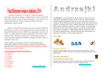 Lozanna, Szwajcaria, 21-09-2014 – Polacy zatrzymali potrójnych mistrzów z Brazylii i zdobyli drugi w historii tytuł FIVB Mistrzostw Świata w Piłce Siatkowej Mężczyzn – tym razem przed własną publicznością. Niemcy natomiast pokonali Francję, zdobywając brązowy medal. Wynik 3:1 dla Polski zakończył serię trzech złotych medali MŚ dla Brazylii, tak samo, jak ta południowoamerykańska drużyna nie dopuściła Polaków do złota w 2006 roku, wygrywając wówczas 3:0. Teraz w dorobku Biało-czerwonych znajdują się dwa złote i jeden srebrny medal. Niedzielne zwycięstwo w finale było siódmym z rzędu wygranym spotkaniem Polaków. Wszystkie siedem trwało co najmniej cztery sety. Polscy siatkarze, po niedzielnym triumfie w mistrzostwach świata, awansowali z piątego na trzecie miejsce w rankingu międzynarodowej federacji (FIVB). Liderami pozostali broniący tytułu Brazylijczycy, których biało-czerwoni pokonali w finale. Czołowa dziesiątka rankingu FIVB siatkarzy: 1. (1.) Brazylia 2. (2.) Rosja 3. (5.) Polska 4. (3.) Włochy 5. (4.) USA 6. (9.) Argentyna 7.(10.) Niemcy 8. (6.) Serbia 9. (8.) Bułgaria Wykonał: Karol Cebula W andrzejki jak co roku próbujemy trochę dla zabawy, a trochę serio uchylić rąbka zasłony spowijającej przyszłość. Wróżby to stary jak ludzkość sposób na oswojenie niepewnej przyszłości. Wierzono, że są dni, kiedy duchy przodków wracają na ziemię i odsłaniają odrobinę nieznanego. Istnieje więc wtedy możliwość zapytać je za pośrednictwem wróżb o najbliższą przyszłość. Jakie będą zbiory, czy dopisze zdrowie, próbowano wywróżyć w czasie tzw. godów - od wigilii Bożego Narodzenia do Trzech Króli. Wróżbom miłosnym zaś sprzyjał początek adwentu. Panny wróżyły zamążpójście w wigilię świętego Andrzeja, kawalerowie ożenek w przeddzień świętej Katarzyny. Jednakże katarzynki były mniej atrakcyjne od dziewczęcych andrzejek i z czasem uległy zapomnieniu. Obrączka czy różaniec? Dziewczęta mogą dowiedzieć się, co je czeka w przyszłości, dzięki wróżbie z kubkami. Należy je rozłożyć na stoliku i ukryć pod nimi przedmioty symbolizujące drogę życiową lub przyszły zawód. Czyj but pierwszy? Do dziś popularne są wróżby z butów. Dziewczęta ustawiają po kolei swoje buty wzdłuż ściany. Której but pierwszy przekroczy próg, ta może być pewna, że wkrótce wyjdzie za mąż. Wykonał: Karol Cebula W starożytności wierzono, że sny są proroczymi wiadomościami od bogów. W antycznej Grecji chorzy spali w świątyni boga medycyny, Asklepiosa, i czekali na uzdrawiający sen. Podejście do marzeń sennych nie zmieniało się przez tysiące lat, aż do momentu gdy w XIX wieku słynny neurolog i psychiatra o nazwisku Freud odkrył, że sny są obrazem naszych nieuświadomionych pragnień, a ich źródeł należy szukać w dzieciństwie. Uważał, że dogłębna interpretacja marzeń sennych powinna być podstawą psychoanalizy, a co za tym idzie, leczenia chorób i dysfunkcji psychicznych. Freudowska teoria psychoanalizy straciła na znaczeniu dopiero Zwyczaj obdarowywania się prezentami w Polsce można znaleźć w tekstach w latach 70. XX wieku, gdy amerykańscy naukowcy odkryli, że z XVIII wieku. Dzieci otrzymywały jabłka, złocone orzechy, pierniki i drewniane sny mogą mieć podłoże biochemiczne i środowiskowe. krzyżyki. Nazwa mikołajki pojawiła się w czasach PRL, na określenie miłej tradycji obdarowywania się 6 grudnia, ale z pominięciem samego świętego. Dziś nazwa ta określa zwyczaj (obecny m.in. w wielu szkołach) wymieniania się drobnymi prezentami z wcześniejszym losowaniem „swojego mikołajka” czy Okazało się, że jedna z kilku wyodrębnionych przez badaczy faz „swojej mikołajki” (czyli osoby, którą się obdaruje). marzeń sennych, faza REM, wyróżnia się wzmożoną pracą mózgu Obecność Świętego Mikołaja zapowiada nadejście świąt Bożego Narodzenia.. oraz gwałtownymi ruchami gałek ocznych. Najprawdopodobniej W dniu tym Święty Mikołaj (właściwie osoba przebrana za niego) przynosi na tym etapie snu spędzamy większość życia płodowego, choć, dzieciom prezenty. Zazwyczaj są to drobne upominki, słodycze lub małe rzecz jasna, obrazy senne z tamtego okresu nie mają żadnego zabawki. Osoby dorosłe również obdarowują swoich bliskich. wpływu na nasze losy po narodzinach. Wykonał: Karol Cebula Wykonał: Karol Cebula