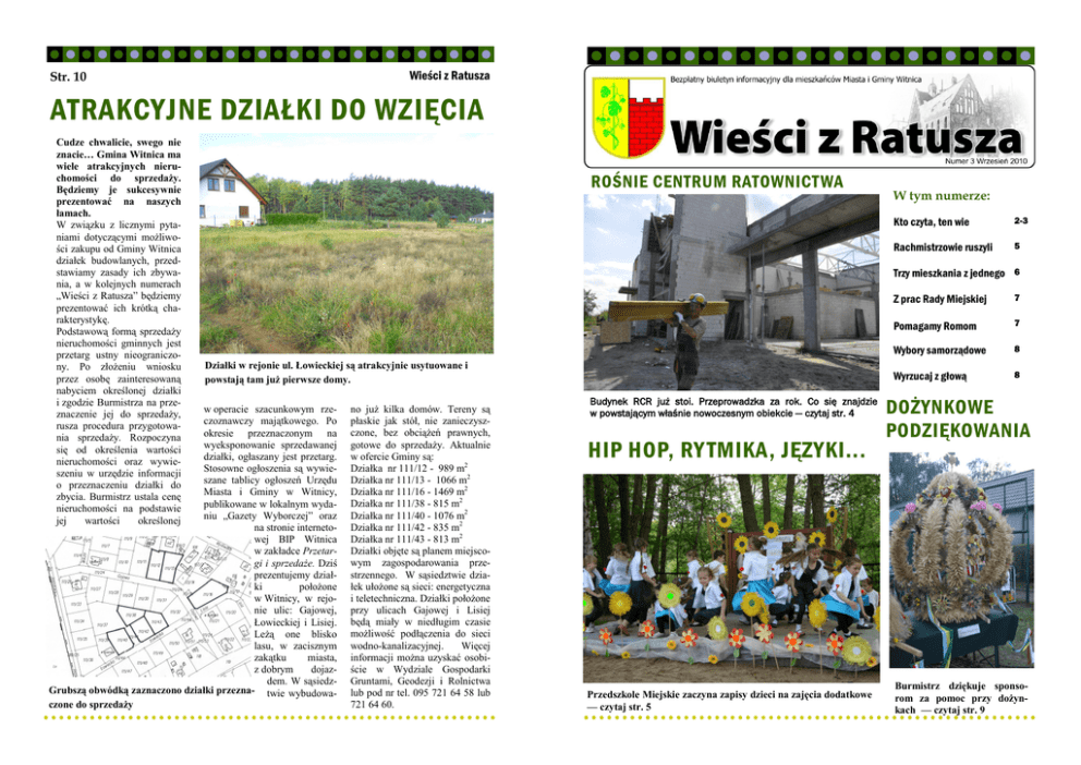 Wieści z Ratusza Str. 10 ATRAKCYJNE DZIAŁKI DO WZIĘCIA Cudze chwalicie, swego nie znacie… Gmina Witnica ma wiele atrakcyjnych nieruchomości do sprzedaży. Będziemy je sukcesywnie prezentować na naszych łamach. W związku z licznymi pytaniami dotyczącymi możliwości zakupu od Gminy Witnica działek budowlanych, przedstawiamy zasady ich zbywania, a w kolejnych numerach „Wieści z Ratusza” będziemy prezentować ich krótką charakterystykę. Podstawową formą sprzedaży nieruchomości gminnych jest przetarg ustny nieograniczony. Po złożeniu wniosku przez osobę zainteresowaną nabyciem określonej działki i zgodzie Burmistrza na przeznaczenie jej do sprzedaży, rusza procedura przygotowania sprzedaży. Rozpoczyna się od określenia wartości nieruchomości oraz wywieszeniu w urzędzie informacji o przeznaczeniu działki do zbycia. Burmistrz ustala cenę nieruchomości na podstawie jej wartości określonej ROŚNIE CENTRUM RATOWNICTWA W tym numerze: Kto czyta, ten wie 2-3 Rachmistrzowie ruszyli 5 Trzy mieszkania z jednego 6 Działki w rejonie ul. Łowieckiej są atrakcyjnie usytuowane i powstają tam już pierwsze domy. w operacie szacunkowym rzeczoznawczy majątkowego. Po okresie przeznaczonym na wyeksponowanie sprzedawanej działki, ogłaszany jest przetarg. Stosowne ogłoszenia są wywieszane tablicy ogłoszeń Urzędu Miasta i Gminy w Witnicy, publikowane w lokalnym wydaniu „Gazety Wyborczej” oraz na stronie internetowej BIP Witnica w zakładce Przetargi i sprzedaże. Dziś prezentujemy działki położone w Witnicy, w rejonie ulic: Gajowej, Łowieckiej i Lisiej. Leżą one blisko lasu, w zacisznym zakątku miasta, z dobrym dojazdem. W sąsiedzGrubszą obwódką zaznaczono działki przezna- twie wybudowaczone do sprzedaży no już kilka domów. Tereny są płaskie jak stół, nie zanieczyszczone, bez obciążeń prawnych, gotowe do sprzedaży. Aktualnie w ofercie Gminy są: Działka nr 111/12 - 989 m2 Działka nr 111/13 - 1066 m2 Działka nr 111/16 - 1469 m2 Działka nr 111/38 - 815 m2 Działka nr 111/40 - 1076 m2 Działka nr 111/42 - 835 m2 Działka nr 111/43 - 813 m2 Działki objęte są planem miejscowym zagospodarowania przestrzennego. W sąsiedztwie działek ułożone są sieci: energetyczna i teletechniczna. Działki położone przy ulicach Gajowej i Lisiej będą miały w niedługim czasie możliwość podłączenia do sieci wodno-kanalizacyjnej. Więcej informacji można uzyskać osobiście w Wydziale Gospodarki Gruntami, Geodezji i Rolnictwa lub pod nr tel. 095 721 64 58 lub 721 64 60. Budynek RCR już stoi. Przeprowadzka za rok. Co się znajdzie w powstającym właśnie nowoczesnym obiekcie — czytaj str. 4 HIP HOP, RY TMIKA, JĘZYKI... Przedszkole Miejskie zaczyna zapisy dzieci na zajęcia dodatkowe — czytaj str. 5 Z prac Rady Miejskiej 7 Pomagamy Romom 7 Wybory samorządowe 8 Wyrzucaj z głową 8 DOŻYNKOWE PODZIĘKOWANIA Burmistrz dziękuje sponsorom za pomoc przy dożynkach — czytaj str. 9 Wieści z Ratusza Str. 2 KTO CZY TA, TEN WIE... WYSTAW WORKI. Worki CZG-12 do segregacji odpadów aktualnie z terenu całej gminy będą odbierane 14 października. Prosimy o wystawienie worków w terminie. MALARSTWO I FOTOGRAFIA W MDK. Zapraszamy na otwarcie poplenerowej wystawy malarsko-fotograficznej „Warto nad Wartą”, które odbędzie się w Żółtym Pałacyku 26 września o godz. 17.00. Swoje prace zaprezentują artyści-amatorzy – uczestnicy polsko-niemieckiego pleneru pn „Nadwarciański Raj”, który był jedną z imprez towarzyszących Nocy Perseidów. (Projekt EWT w Euroregionie Pro Europa Viadrina). Serdecznie zapraszamy. DABROSZYN SIĘ BAWIŁ. 19 września przy Pałacu Dąbroszyńskim odbył się doroczny festyn szkolny i dożynki wiejskie. Przy sprzyjającej pogodzie oraz suto zastawionych stołach miło spędzały czas całe rodziny. O oprawę muzyczną zadbał zespół muzyczny z Gorzowa. Atrakcją były występy grupy z DPS z Kamienia Wielkiego, przejazdy kucykiem, pokazy sprzętu strażackiego, Koło Fortuny, turniej darta, przejażdżki motocyklami, oraz liczne konkurencje sportowe. WITNICA W OBIEKTYWIE. Zapraszamy do ogrodu przed Żółtym Pałacykiem, gdzie jeszcze przez cały miesiąc można oglądać fotografie Renate JohnLindner. Pani Renate obserwując Witnicę, dostrzega szybko następujące zmiany, których my nie zauważamy i uwiecznia je na fotografiach. Organizatorzy wystawy – Miejski Dom Kultury oraz Towarzystwo Przyjaciół Witnicy – planują rozpocząć cykl wystaw pod nazwą „Galeria w drodze” w kolejnych miejscach naszej gminy. Chętnych – zapraszamy do kontaktu (tel. 505 149 541). BICRAJDY I BIESIADORAJDY. 17 września w Szkole Podstawowej w Nowinach Wielkich przy współpracy Lubuskiego Zrzeszenia Ludowych Związków Sportowych odbył się Festyn SportowoRekreacyjny „Łączy nas Warta” czyli Biesiadorajdy i Bicrajd II. Impreza od lat cieszy się uznaniem wśród uczniów szkoły, którzy są współorganizatorami tego przedsięwzięcia. W tym roku uczestnicy mieli okazję oglądać pokazy wschodnich sztuk walki i przejechać się chopperami. Dzieci bawiły się w dmuchanych zamkach, a rodzice częstowali wszystkich bigosem, kiełbaskami, ciastem, lodami i napojami. Wiele drużyn wyjechało z pucharami za zwycięstwo. Po rozgrywkach sportowych chętni mogli skorzystać z uroków Dinoparku. WYPEŁNIJ WAŻNY DRUK. Od października 2010 r. każdy podatnik otrzyma prosty, jednostronicowy druk IN-2 Aktualizacja wykazu nieruchomości. Aby druk IN–2 został wypełniony prawidłowo, każdy powinien dokładnie zmierzyć wszystkie swoje nieruchomości (mieszkanie, dom – z uwzględnieniem przybudówek, adaptacji strychów, nowo wybudowane garaże czy budynki gospodarcze, itp.) Powyższy formularz powinien być dostarczony do Urzędu Miasta i Gminy w Witnicy – Wydział Finansów i Budżetu, pok. 19 w terminie do 15 grudnia 2010 r. OBÓZ Z SUKCESEM. Od 28 czerwca do 19 sierpnia 2010r. Szkoła Podstawowa w No