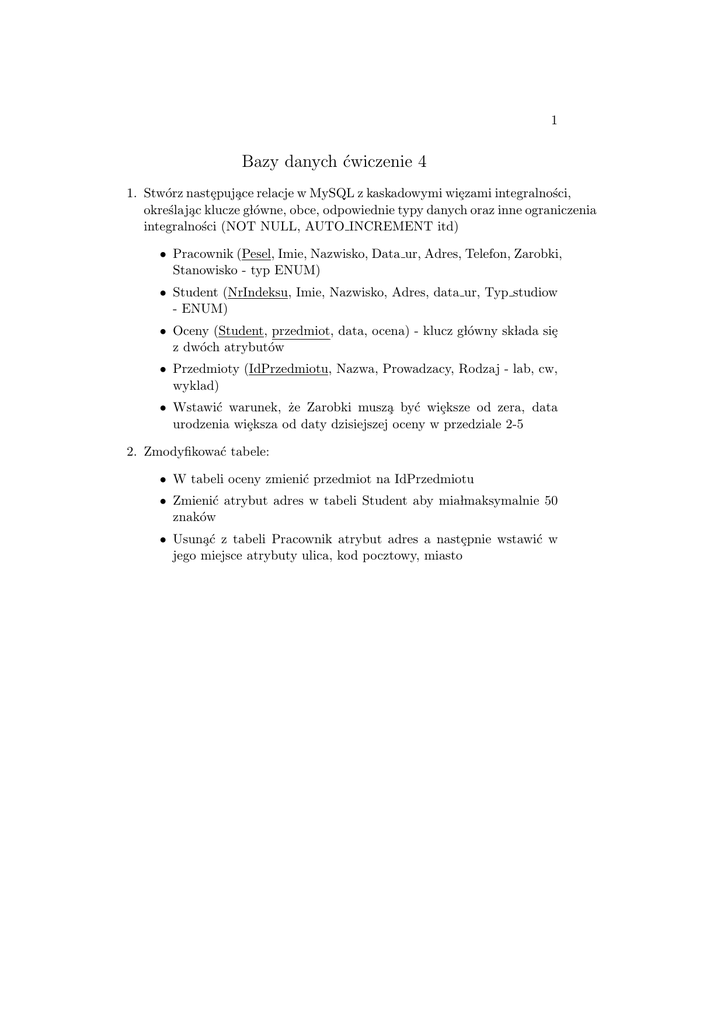 1 Bazy danych ćwiczenie 4 1. Stwórz nastȩpuja̧ce relacje w MySQL z kaskadowymi wiȩzami integralności, określaja̧c klucze gÃlówne, obce, odpowiednie typy danych oraz inne ograniczenia integralności (NOT NULL, AUTO INCREMENT itd) • Pracownik (Pesel, Imie, Nazwisko, Data ur, Adres, Telefon, Zarobki, Stanowisko - typ ENUM) • Student (NrIndeksu, Imie, Nazwisko, Adres, data ur, Typ studiow - ENUM) • Oceny (Student, przedmiot, data, ocena) - klucz gÃlówny skÃlada siȩ z dwóch atrybutów • Przedmioty (IdPrzedmiotu, Nazwa, Prowadzacy, Rodzaj - lab, cw, wyklad) • Wstawić warunek, że Zarobki musza̧ być wiȩksze od zera, data urodzenia wiȩksza od daty dzisiejszej oceny w przedziale 2-5 2. Zmodyfikować tabele: • W tabeli oceny zmienić przedmiot na IdPrzedmiotu • Zmienić atrybut adres w tabeli Student aby miaÃlmaksymalnie 50 znaków • Usuna̧ć z tabeli Pracownik atrybut adres a nastȩpnie wstawić w jego miejsce atrybuty ulica, kod pocztowy, miasto