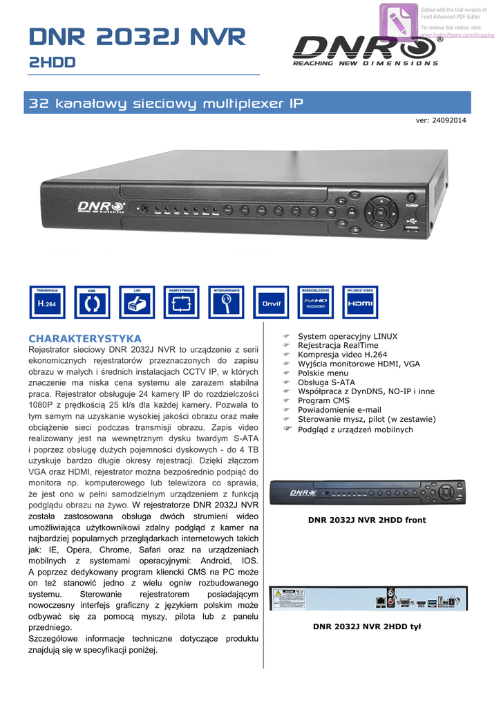 Edited with the trial version of Foxit Advanced PDF Editor DNR 2032J NVR To remove this notice, visit: www.foxitsoftware.com/shopping 2HDD 32 kanałowy sieciowy multiplexer IP ver: 24092014 CHARAKTERYSTYKA Rejestrator sieciowy DNR 2032J NVR to urządzenie z serii ekonomicznych rejestratorów przeznaczonych do zapisu obrazu w małych i średnich instalacjach CCTV IP, w których znaczenie ma niska cena systemu ale zarazem stabilna praca. Rejestrator obsługuje 24 kamery IP do rozdzielczości 1080P z prędkością 25 kl/s dla każdej kamery. Pozwala to tym samym na uzyskanie wysokiej jakości obrazu oraz małe obciążenie sieci podczas transmisji obrazu. Zapis video realizowany jest na wewnętrznym dysku twardym S-ATA i poprzez obsługę dużych pojemności dyskowych - do 4 TB uzyskuje bardzo długie okresy rejestracji. Dzięki złączom VGA oraz HDMI, rejestrator można bezpośrednio podpiąć do monitora np. komputerowego lub telewizora co sprawia, że jest ono w pełni samodzielnym urządzeniem z funkcją podglądu obrazu na żywo. W rejestratorze DNR 2032J NVR została zastosowana obsługa dwóch strumieni wideo umożliwiająca użytkownikowi zdalny podgląd z kamer na najbardziej popularnych przeglądarkach internetowych takich jak: IE, Opera, Chrome, Safari oraz na urządzeniach mobilnych z systemami operacyjnymi: Android, IOS. A poprzez dedykowany program kliencki CMS na PC może on też stanowić jedno z wielu ogniw rozbudowanego systemu. Sterowanie rejestratorem posiadającym nowoczesny interfejs graficzny z językiem polskim może odbywać się za pomocą myszy, pilota lub z panelu przedniego. Szczegółowe informacje techniczne dotyczące produktu znajdują się w specyfikacji poniżej. System operacyjny LINUX Rejestracja RealTime Kompresja video H.264 Wyjścia monitorowe HDMI, VGA Polskie menu Obsługa S-ATA Współpraca z DynDNS, NO-IP i inne Program CMS Powiadomienie e-mail Sterowanie mysz, pilot (w zestawie) Podgląd z urządzeń mobilnych DNR 2032J NVR 2HDD front DNR 2032J NVR 2HDD tył Edited with the trial version of Foxit Advanced PDF Editor To remove this notice, visit: www.foxitsoftware.com/shopping Specyfikacja techniczna Model System operacyjny Funkcjonalność Obsługa Video Wyjścia video Audio Wejście/wyjście Nagrywanie Kompresja Video Kompresja Audio Rozdzielczość Tryb Odtwarzanie Wyszukiwanie Prędkość Sieć Protokoły Obsługa Podgląd Bitrate Urządzenia mobilne Dodatkowy strumień Karta sieciowa Archiwizacja Zewnętrzna Wewnętrzna Sieciowa Interfejs RS 485 USB LAN Pozostałe Wymiary:wys/szer/gł Waga Temperatura pracy Zasilanie DNR 2032J NVR 2HDD Linux Funkcja Pentaplex: Obraz na żywo, Nagrywanie, Odtwarzanie, Archiwizacja i zdalny dostęp Panel, Mysz, Pilot, Klawiatura, Sieć HDMI: FullHD, VGA : FullHD 1/1 H.264 G.711 24x1080P, 16x1080P, 32x960P, 16x720P, 16x3MP, 8x5MP Ręczny, Harmonogram, Detekcja ruchu, Prealarm (maks. 30 sekund na kanał) Nr kanału, Czas/Data, Alarm, Detekcja ruchu i Zaawansowane szukanie x1/x2/x3/x4 TCP/IP,SMTP, HTTP, DHCP, PPPoE (ADSL), DNS, DDNS Przeglądarka internetowa IE, oprogramowanie klienckie CMS Przeglądarki: FF, Opera, Safari 160Mb/s Android, iOS Zależny od konfiguracji kamery Port RJ-45 (1000Mbps) TAK HDD 2 x 3,5” SATA (max 4TB) Program kliencki CMS, przeglądarka IE Tak 2xUSB 2.0, 1xUSB 3.0 Tak 45x295x348 mm 1740g -0°C~50°C 12V 4A
