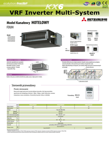 09KX08E-A-0 Model Kanałowy HOTELOWY FDUH Sterownik przewodowy Model FDUH22KXE6D FDUH28KXE6D FDUH36KXE6D RC-E4 (opcja) RCH-E3 (opcja) Zestaw do odprowadzenia skroplin (600mm) UH-DU-E (opcja) Sterownik bezprzewodowy *Spadek ciśnienia: 5Pa RCN-KIT3-E (opcja) Filtr UH-FL1E Kompaktowa i zwarta budowa Jednostka zaprojektowana specjalnie dla klimatyzacji pokojów hotelowych . Niewielkie wymiary i wysoka energooszczędność. Ponadto - waga tylko 20 kg. Ułatwienia instalacyjne Skrzynkę elektryczną oraz odporowadzenie skroplin można projektować po obydwu stronach jednostki a wlot powietrza jest możliwy od spodu lub z tyłu. Wybór indywidualnego rozwiązania jest możliwy dzięki stosowaniu zaawansowanych Skrzynka elektryczna technologii. 570mm 257 mm 530mm Cicha praca Bardzo cicha praca umożliwia komfortowy pobyt, pracę i odpoczynek w hotelu. Odprowadzenie skroplin Sterownik przewodowy Proste sterowanie Biorąc pod uwagę konieczność prostej obsługi sterownika, ilość jego przycisków ograniczono do niezbędnego minimum : Włącz / Wyłącz, wybór trybu pracy, nastawy temperatury i pracy wentylatora. Sterownik jest prosty i łatwy w obsłudze. Wydajność chłodzenia Wydajność grzewcza Zasilanie Model kW kW Chłodzenie kW Ogrzewanie Poziom ciśnienia akustycznego dB(A) Wymiary zewnętrzne Wys.xSzer.xGłęb. mm Waga netto kg m3/min. Przepływ powietrza Ciśnienie statyczne Pa Filtr powietrza Sterownik Pobór mocy Przyłącze rurowe mm (inch) FDUH22KXE6D 2.2 2.5 Przewodowy FDUH28KXE6D 2.8 3.2 1 Faza 220-240V, 50Hz 0.05-0.07 0.05-0.07 HI: 33 Me: 30 Lo: 27 257x570x530 22 HI: 7 Me: 6.5 Lo: 6 30 Zakup lokalny przewodowy: RCH-E3,RC-E4 bezprzewodowy: RCN-KIT3-E Ciecz: ø6.35(1/4") Gaz: ø9.52(3/8") Warunki prezentacji danych (ISO-T1) 1. Chłodzenie: temperatura wewnętrzna 270CDB, 190CWB, temperatura zewnętrzna 350CDB. Ogrzewanie: temperatura wewnętrzna 200CDB, temperatura zewnętrzna 70CDB, 60CWB. 2. Poziom ciśnienia akustycznego mierzony w komorze bezechowej. Podczas normalnej pracy urządzenia wartości nieco wyższe z powodu warunków zewnętrznych. RCH-E3 (opcja) FDUH36KXE6D 3.6 4.0 Gaz: ø12.7(1/2") Jednostki kanałowe typu FDUH dedykowane są szczególnie dla rozwiązań hotelowych, pod względem trzech optymalnych zakresów mocy chłodniczych jak i zalet technicznych. Kompaktowe wymiary umożliwiają łatwy montaż w przestrzeni sufitu podwieszonego. Jednostki są zwarte i lekkie. Zaletą funkcjonalną jest możliwość doprowadzenia powietrza od spodu lub z tyłu urządzenia. Skrzynkę elektryczną oraz odprowadzenie skroplin zaprojektować można po obydwu stronach jednostki. Niski poziom hałasu (27 / 30 / 33 dB(A) ) zapewnia komfort gościom hotelowym. Uproszczona wersja “pilota” (prosty sterownik przewodowy - jako opcja) zapewnia niekłopotliwą obsługę klimatyzacji nawet niedoświadczonym użytkownikom. Rozwiązanie pozwala w razie potrzeby sterować indywidualnie 16 jednostkami wewnętrznymi poprzez wybranie adresu jednostki wewnętrznej z poziomu sterownika. Urządzenie wyposażone jest w funkcję automatycznego restartu (np. po zaniku napięcia, “pamięta” ostatnie nastawy). Isnieje także możliwość sterowania jednostkami hotelowymi przez obsługę hotelu za pomocą sterownika standardowego, który może być udostępniony lub zablokowany dla gościa hotelowego. Jednostki FDUH oraz inne jednostki wewnętrzne, systemowe mogą występować jako część składowa rozbudowanego sytemu VRF KX6 (do 80 jednostek wewnętrznych) lub też prostego systemu MICRO KX - w wersjach do 8 lub 22 jednostek wenętrznych, spiętych z jedną jednostką zewnętrzną. 32.5 83.3 53 30.8 Wymiary Symbol Symbol Wszystkie jednostki w mm 100 145 㸦Duct dimension㸧 Wymiary kanału 32 Drain hose piece Odprowadzenie skroplin 㸦Standard Accessory㸧 575.2 㸦Installed on site㸧 Note㸦4㸧 32 27.6 Supply air duct Kanał powietrza nawiewanego 㸦Suspension bolts pitch㸧 (Rozstaw śrub mocujących) Space for installation and servicei serwisowa Przestrzeń montażowa 255.8 F 40 30.8 62.1 68 E 549.2 30 150 150 494.2 574 150 32 27.5 G 610 Wersja z wlotem powietrzaairodintake spodu In case of Bottom Bottom plate Płyta denna (możliwa zamocowania z tyłu) 㸦Able to bedolocated on the back side㸧 Simple remote control Prosty sterownik bezprzewodowy on the reverse side. 50.5 150 150 50.5 150 12-φ4 OtworyHolesdoforpołączenia tapping screws wkrętami 18.2 537.6 Wlot powietrza Air inlet 30 120 28.5 32 27.5 28.3 37.6 30 160 200 WlotAirpowietrza inlet 38.2 188.5 148.5 Notes Uwagi ࠉ㸦㸯㸧Thez nazwą model name label is attached on the 1 Tabliczka modelu znajduje się fan nacase obudowie wentylatora. the air returnodprowadzenie grille. 2 Należyinside zainstalować skroplin (VP20) ࠉ 㸦㸰㸧 Prepare the connecting socket 㸦VP20㸧 on site. (otwór C1 lub C2 - do wyboru) 㸦As for drain piping,mocowania it is possible toskrzynki choose C1 orelektrycznej C2㸧 3 Należy wybrać miejsce i zaplanować ࠉ㸦㸱㸧When control box is located on the reverse side, Installation przestrzeń montażową. 4 Skrzynkę elektryczną i przewód odprowadzenia skroplin można lokować ࠉ㸦㸲㸧Contorl box and Drain hosejednostki. piece are able to be relocated dowolnie, po obu stronach 30 12-φ4 Otwory Holes for do połączenia tapping screws wkrętami D 100 Jednostki wUnit:mm mm 160 Air inletpowietrza Wlot 㸦D㸧 890 600 198.2 B C2 21 Skrzynka Control box elektryczna Note 㸦4㸧 530 A 488 (Rozstaw śrubbolts mocujących) 㸦Suspension pitch㸧 156.8 66 21 66 95.3 C1 150 150 494 Wymiary kanału 㸦Duct dimension㸧 273 66.4 Air outlet Wylot powietrza 30.8 150 27.6 32.5 12-φ4 Otwory Holes forśrub tapping screws mocujących 145.6 AA BB CC1,C,2C 1 2 DD EE FF C o n t eOpis nt FDUH22KXE6D,28KXE6D FDUH36KXE6D FDU280KXE6 FDUH22KXE6, 28KXE6 φ9.52㸦9.52 3㸭8"㸧 㸦Flare㸧 φ12.7㸦12.7 1㸭2"㸧 㸦Flare㸧 (1/2”) (kielich) (3/8”) (kielich) φ6.35㸦1㸭4"㸧 㸦Flare㸧 6,35 (1/4”) (kieli
