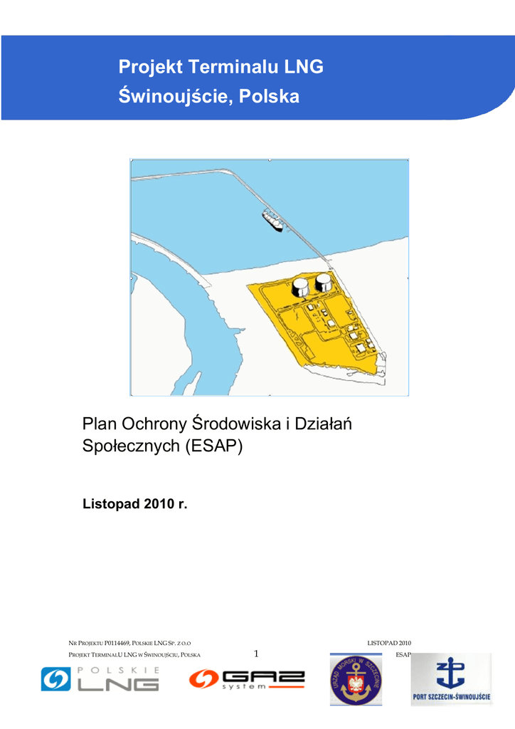 Projekt Terminalu LNG Świnoujście, Polska Plan Ochrony Środowiska i Działań Społecznych (ESAP) Listopad 2010 r. NR PROJEKTU P0114469, POLSKIE LNG SP. Z O.O PROJEKT TERMINALU LNG W ŚWINOUJŚCIU, POLSKA LISTOPAD 2010 1 ESAP Plan ochrony środowiska i działań społecznych (ESAP) Krótki Opis Projektu Spółka Polskie LNG (PLNG) rozpoczęła budowę terminalu skroplonego gazu ziemnego (LNG) w porcie Świnoujście. Terminal LNG umożliwi rozładunek gazu importowanego za pomocą specjalnych statków (metanowców), przechowywanie i regazyfikację LNG na terenie terminalu, a następnie przesył gazu za pośrednictwem gazociągu do istniejącego krajowego systemu przesyłowego. Projekt składa się z czterech głównych elementów Projektu. Oprócz terminalu, który zostanie wybudowany przez PLNG, Projekt obejmuje: budowę infrastruktury portowej (falochron i nabrzeże dla tankowców/obiekty pirsu) realizowaną przez Urząd Morski w Szczecinie (UMS) oraz Zarząd Morskich Portów Szczecin i Świnoujście (ZMPSiS), oraz budowę gazociągu przyłączeniowego (ok. 6 km) z terminala LNG do krajowej sieci przesyłowej budowanej przez GAZ-SYSTEM (gazociąg przesyłowy o długości ok. 76 km). PLNG, UMS, ZMPSiS oraz GAZ-SYSTEM będą dalej nazywani „Sponsorami Projektu”, dodatkowoGAZ-SYSTEM będzie pełnił rolę koordynatora całości Projektu zgodnie z Porozumieniem o Współpracy zawartym pomiędzy Sponsorami z sierpnia 2009 roku oraz Ustawy z dnia 24.04.2009 r. o inwestycjach w zakresie terminalu regazyfikacyjnego skroplonego gazu ziemnego w Świnoujściu. Szczegółowe Streszczenie Ogólne znajduje się na stronie http://www.polskielng.pl/. Cel i zakres ESAP Plan Ochrony Środowiska i Działań Społecznych (ESAP) kompiluje wymogi organizacyjne i działania ochronne („Działania”) mające na celu niedopuszczenie do potencjalnie niekorzystnego wpływu Projektu na środowisko, warunki bezpieczeństwa i higieny pracy pracowników i społeczeństwa lokalnego oraz warunki społeczne i społeczno-ekonomiczne. ESAP ma zastosowanie do wszystkich faz Projektu, tj. prac projektowych, budowy, eksploatacji oraz wycofania z użytku terminalu LNG. NR PROJEKTU P0114469, POLSKIE LNG SP. Z O.O PROJEKT TERMINALU LNG W ŚWINOUJŚCIU, POLSKA LISTOPAD 2010 2 ESAP ESAP będzie stanowić część umowy kredytowej pomiędzy Kredytodawcami a PLNG. W rezultacie całościowa odpowiedzialność za wdrożenie ESAP spoczywa na PLNG. ESAP przedstawia również Działania w celu zapewnienia zgodności Projektu z wymogami i najlepszymi praktykami międzynarodowymi oraz Wymogami Kredytodawców, które są zdefiniowane w następujący sposób: Wymogi Kredytodawców dotyczące ochrony środowiska i działań społecznych: Wszystkie elementy Projektu będą musiały być zgodne z postanowieniami prawa i przepisami dotyczącymi środowiska, bezpieczeństwa i zdrowia oraz społeczeństwa; Wszystkie elementy Projektu będą realizowane zgodnie ze standardami Unii Europejskiej dotyczącymi ochrony środowiska i działań społecznych, w szczególności z wymogami SEA, EIA, Dyrektyw Ptasiej i Siedliskowej oraz IPPC. Zgodność ze Standardami IFC dostępnymi na stronie http://www.ifc.org/enviro oraz Zasadami Equator dostępnymi na stronie http://www.equator-principles.com/ Zgodność z Wymogami dot. Polityki i Działania (PR) w Zakresie Ochrony Środowiska i Działań Społecznych EBOR z 2008 roku. (http://www.ebrd.com/about/policies/enviro/policy/2008policy.pdf) Konsultacje publiczne i zaangażowanie interesariuszy w procesie decyzyjnym (zgodnie z konwencją ONZ ECE z Aarhus. Projekt obejmuje wszystkie działania konieczne do uniknięcia, minimalizacji lub ograniczenia ewentualnych niekorzystnych zmian środowiska oraz wpływu na zdrowie i bezpieczeństwo społeczeństwa. Poszczególne decyzje, pozwolenia i zgody otrzymane dotychczas przez Sponsorów Projektu dla poszczególnych Komponentów Projektu zawierają wiele konkretnych instrukcji dotyczących działań ochronnych. Niniejszy ESAP zwiera streszczenie ogólnych działan, które zostały uszczegółowione we właściwych dokumentach. ESAP zostanie udostępniony Wykonawcom działającym w imieniu Sponsorów, którzy są zobowiązani do przestrzegania jego zapisów (dotyczy to również podwykonawców). Ponadto niniejszy dokument zostanie udostępniony publicznie dla wszystkich zainteresowanych stron. Zostanie powołany Oficer Łącznikowy ds. Kontaktów ze Społecznością Lokalną (CLO), który będzie zajmował się komunikacją, udzielaniem odpowiedzi na pytania i zapewnianiem, NR PROJEKTU P0114469, POLSKIE LNG SP. Z O.O PROJEKT TERMINALU LNG W ŚWINOUJŚCIU, POLSKA LISTOPAD 2010 3 ESAP aby społeczność była świadoma zobowiązań Sponsorów. CLO będzie również odpowiedzialny za mechanizm rozpatrywania skarg, ze strony społeczeństwa lub interesariuszy, w tym pracowników. Wdrażanie ESAP oraz zgodność z Wymogami Kredytodawców będą monitorowane przez Kredytodawców, a w razie potrzeby z pomocą Niezależnego Konsultanta ds. Monitoringu Ochrony Środowiska i Działań Społecznych (IESMC) oraz Niezależnego Konsultanta Technicznego (ITC). NR PROJEKTU P0114469, POLSKIE LNG SP. Z O.O PROJEKT TERMINALU LNG W ŚWINOUJŚCIU, POLSKA LISTOPAD 2010 4 ESAP Tabele Działań Działania w ramach ESAP zostały przestawione w poniższych tabelach. W poszczególnych Działaniach zawarto odniesienia do Planu Zaangażowania Interesariuszy (SEP) oraz Planu Działań Biodywersyfikacyjnych (BAP), które zostały opracowane na potrzeby Projektu. Tabele Działań zostały uporządkowane w następujący sposób: Tabela 1 dla Całości Projektu Terminalu LNG („OP”), Tabela 2 dla Terminalu LNG („T”), Tabela 3 dla Falochronu i Pirsu („BJ”), Tabela 4 dla Rurociągu („P”), oraz Tabela 5 obejmująca działania, które wynikają z Analizy Społecznej Projektu („SR”). NR PROJEKTU P0114469, POLSKIE LNG SP. Z O.O PROJEKT TERMINALU LNG W ŚWINOUJŚCIU, POLSKA LISTOPAD