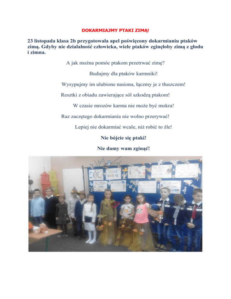 DOKARMIAJMY PTAKI ZIMĄ! 23 listopada klasa 2b przygotowała apel poświęcony dokarmianiu ptaków zimą. Gdyby nie działalność człowieka, wiele ptaków zginęłoby zimą z głodu i zimna. A jak można pomóc ptakom przetrwać zimę? Budujmy dla ptaków karmniki! Wysypujmy im ulubione nasiona, łączmy je z tłuszczem! Resztki z obiadu zawierające sól szkodzą ptakom! W czasie mrozów karma nie może być mokra! Raz zaczętego dokarmiania nie wolno przerywać! Lepiej nie dokarmiać wcale, niż robić to źle! Nie bójcie się ptaki! Nie damy wam zginąć!