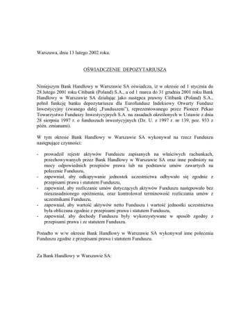 Warszawa, dnia 13 lutego 2002 roku. OŚWIADCZENIE DEPOZYTARIUSZA Niniejszym Bank Handlowy w Warszawie SA oświadcza, iż w okresie od 1 stycznia do 28 lutego 2001 roku Citibank (Poland) S.A., a od 1 marca do 31 grudnia 2001 roku Bank Handlowy w Warszawie SA działając jako następca prawny Citibank (Poland) S.A., pełnił funkcję banku depozytariusza dla Eurofundusz Indeksowy Otwarty Fundusz Inwestycyjny (zwanego dalej „Funduszem”), reprezentowanego przez Pioneer Pekao Towarzystwo Funduszy Inwestycyjnych S.A. na zasadach określonych w Ustawie z dnia 28 sierpnia 1997 r. o funduszach inwestycyjnych (Dz. U. z 1997 r. nr 139, poz. 933 z późn. zmianami). W tym okresie Bank Handlowy w Warszawie SA wykonywał na rzecz Funduszu następujące czynności: - - prowadził rejestr aktywów Funduszu zapisanych na właściwych rachunkach, przechowywanych przez Bank Handlowy w Warszawie SA oraz inne podmioty na mocy odpowiednich przepisów prawa lub na podstawie umów zawartych na polecenie Funduszu, zapewniał, aby odkupywanie jednostek uczestnictwa odbywało się zgodnie z przepisami prawa i statutem Funduszu, zapewniał, aby rozliczanie umów dotyczących aktywów Funduszu następowało bez nieuzasadnionego opóźnienia, oraz kontrolował terminowość rozliczania umów z uczestnikami Funduszu, zapewniał, aby wartość aktywów netto Funduszu i wartość jednostki uczestnictwa była obliczana zgodnie z przepisami prawa i statutem Funduszu, zapewniał, aby dochody Funduszu były wykorzystywane w sposób zgodny z przepisami prawa i ze statutem Funduszu. Ponadto w w/w okresie Bank Handlowy w Warszawie SA wykonywał inne polecenia Funduszu zgodne z przepisami prawa i statutem Funduszu. Za Bank Handlowy w Warszawie SA: