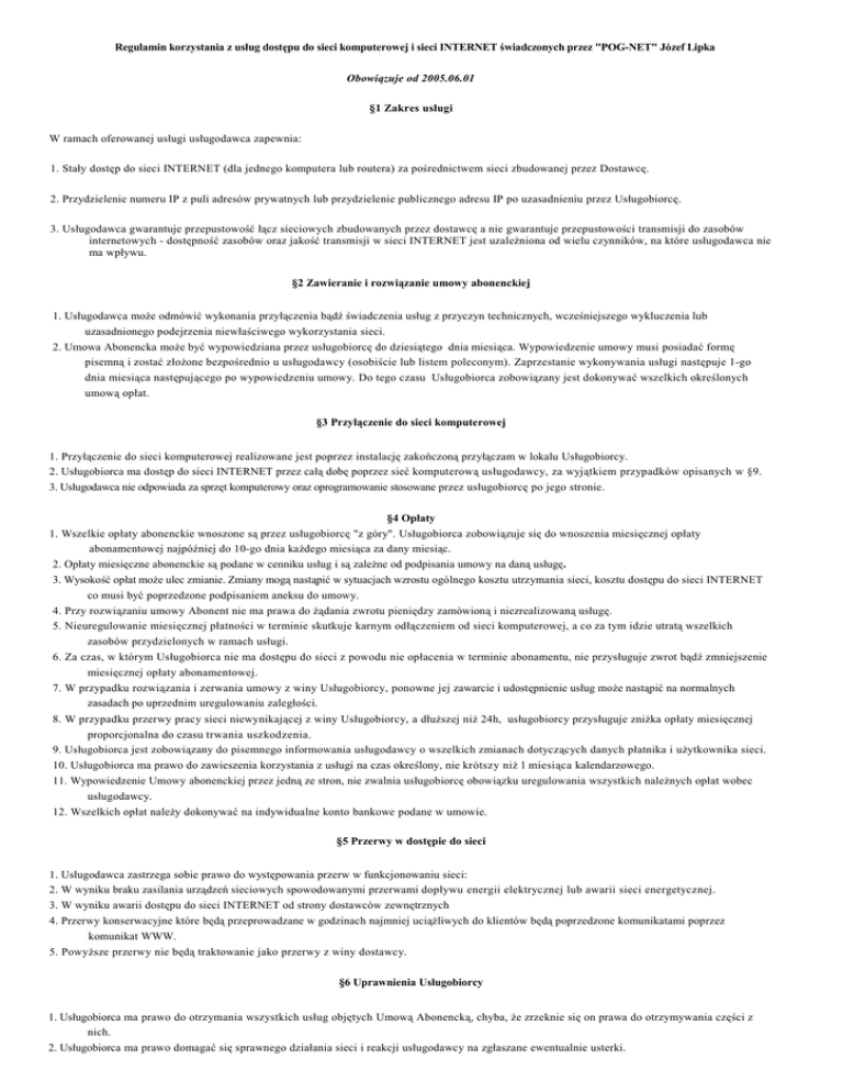 Regulamin korzystania z usług dostępu do sieci komputerowej i sieci INTERNET świadczonych przez "POG-NET" Józef Lipka Obowiązuje od 2005.06.01 §1 Zakres usługi W ramach oferowanej usługi usługodawca zapewnia: 1. Stały dostęp do sieci INTERNET (dla jednego komputera lub routera) za pośrednictwem sieci zbudowanej przez Dostawcę. 2. Przydzielenie numeru IP z puli adresów prywatnych lub przydzielenie publicznego adresu IP po uzasadnieniu przez Usługobiorcę. 3. Usługodawca gwarantuje przepustowość łącz sieciowych zbudowanych przez dostawcę a nie gwarantuje przepustowości transmisji do zasobów internetowych - dostępność zasobów oraz jakość transmisji w sieci INTERNET jest uzależniona od wielu czynników, na które usługodawca nie ma wpływu. §2 Zawieranie i rozwiązanie umowy abonenckiej 1. Usługodawca może odmówić wykonania przyłączenia bądź świadczenia usług z przyczyn technicznych, wcześniejszego wykluczenia lub uzasadnionego podejrzenia niewłaściwego wykorzystania sieci. 2. Umowa Abonencka może być wypowiedziana przez usługobiorcę do dziesiątego dnia miesiąca. Wypowiedzenie umowy musi posiadać formę pisemną i zostać złożone bezpośrednio u usługodawcy (osobiście lub listem poleconym). Zaprzestanie wykonywania usługi następuje 1-go dnia miesiąca następującego po wypowiedzeniu umowy. Do tego czasu Usługobiorca zobowiązany jest dokonywać wszelkich określonych umową opłat. §3 Przyłączenie do sieci komputerowej 1. Przyłączenie do sieci komputerowej realizowane jest poprzez instalację zakończoną przyłączam w lokalu Usługobiorcy. 2. Usługobiorca ma dostęp do sieci INTERNET przez całą dobę poprzez sieć komputerową usługodawcy, za wyjątkiem przypadków opisanych w §9. 3. Usługodawca nie odpowiada za sprzęt komputerowy oraz oprogramowanie stosowane przez usługobiorcę po jego stronie. §4 Opłaty 1. Wszelkie opłaty abonenckie wnoszone są przez usługobiorcę "z góry". Usługobiorca zobowiązuje się do wnoszenia miesięcznej opłaty abonamentowej najpóźniej do 10-go dnia każdego miesiąca za dany miesiąc. 2. Opłaty miesięczne abonenckie są podane w cenniku usług i są zależne od podpisania umowy na daną usługę. 3. Wysokość opłat może ulec zmianie. Zmiany mogą nastąpić w sytuacjach wzrostu ogólnego kosztu utrzymania sieci, kosztu dostępu do sieci INTERNET co musi być poprzedzone podpisaniem aneksu do umowy. 4. Przy rozwiązaniu umowy Abonent nie ma prawa do żądania zwrotu pieniędzy zamówioną i niezrealizowaną usługę. 5. Nieuregulowanie miesięcznej płatności w terminie skutkuje karnym odłączeniem od sieci komputerowej, a co za tym idzie utratą wszelkich zasobów przydzielonych w ramach usługi. 6. Za czas, w którym Usługobiorca nie ma dostępu do sieci z powodu nie opłacenia w terminie abonamentu, nie przysługuje zwrot bądź zmniejszenie miesięcznej opłaty abonamentowej. 7. W przypadku rozwiązania i zerwania umowy z winy Usługobiorcy, ponowne jej zawarcie i udostępnienie usług może nastąpić na normalnych zasadach po uprzednim uregulowaniu zaległości. 8. W przypadku przerwy pracy sieci niewynikającej z winy Usługobiorcy, a dłuższej niż 24h, usługobiorcy przysługuje zniżka opłaty miesięcznej proporcjonalna do czasu trwania uszkodzenia. 9. Usługobiorca jest zobowiązany do pisemnego informowania usługodawcy o wszelkich zmianach dotyczących danych płatnika i użytkownika sieci. 10. Usługobiorca ma prawo do zawieszenia korzystania z usługi na czas określony, nie krótszy niż l miesiąca kalendarzowego. 11. Wypowiedzenie Umowy abonenckiej przez jedną ze stron, nie zwalnia usługobiorcę obowiązku uregulowania wszystkich należnych opłat wobec usługodawcy. 12. Wszelkich opłat należy dokonywać na indywidualne konto bankowe podane w umowie. §5 Przerwy w dostępie do sieci 1. Usługodawca zastrzega sobie prawo do występowania przerw w funkcjonowaniu sieci: 2. W wyniku braku zasilania urządzeń sieciowych spowodowanymi przerwami dopływu energii elektrycznej lub awarii sieci energetycznej. 3. W wyniku awarii dostępu do sieci INTERNET od strony dostawców zewnętrznych 4. Przerwy konserwacyjne które będą przeprowadzane w godzinach najmniej uciążliwych do klientów będą poprzedzone komunikatami poprzez komunikat WWW. 5. Powyższe przerwy nie będą traktowanie jako przerwy z winy dostawcy. §6 Uprawnienia Usługobiorcy 1. Usługobiorca ma prawo do otrzymania wszystkich usług objętych Umową Abonencką, chyba, że zrzeknie się on prawa do otrzymywania części z nich. 2. Usługobiorca ma prawo domagać się sprawnego działania sieci i reakcji usługodawcy na zgłaszane ewentualnie usterki. §7 Uprawnienia Usługodawcy 1. Usługodawca ma prawo do logowania i zapisywania wszystkich połączeń generowanych przez komputery klienckie (obowiązek logowania połączeń jest nakazany przez prawo telekomunikacyjne) 2. Usługodawca nie ponosi odpowiedzialności za jakość i treść informacji dostępnych w sieci lokalnej i sieci INTERNET. 3. Usługodawca ma prawo wypowiedzieć Umowę w przypadku naruszenia przez Usługobiorcę zasad regulaminu. 4. Usługodawca ma prawo szczegółowego analizowania ruchu w sieci, oraz blokowania niektórych usług w celu ochrony sieci komputerowej i internetowej. 5. Usługodawca może zastosować ograniczenia w działaniu niektórych programów P2P. Ograniczenia te nie mają wpływu na ruch po stronach WWW pobieranie z nich plików, programów pocztowych i popularnych komunikatorów. §8 Obowiązki usługobiorcy 6. Abonent ma obowiązek we własnym zakresie dbać o przyłącze Dostawcy zainstalowane w jego lokalu. Abonent zobowiązuje się do nie wykonywania jakichkolwiek przeróbek instalacji sieciowej w jego lokalu bez wiedzy i zgody Dostawcy. 7. Abonent umożliwi Dostawcy kontrolę stanu technicznego i konserwację sieci znajdującej się w mieszkaniu usługobiorcy oraz umożliwi sprawdzenie sposobu, 