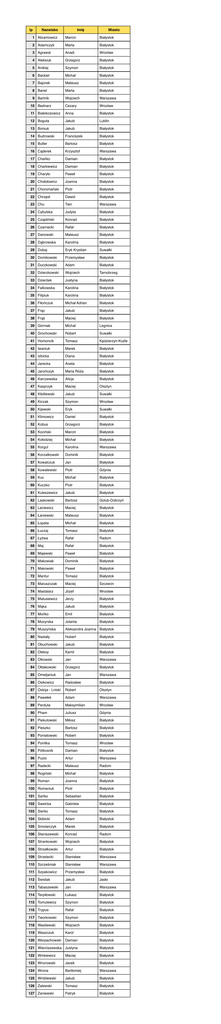 lp Nazwisko Imię Miasto 1 Abramowicz Marcin Białystok 2 Adamczyk Marta Białystok 3 Agrawal Anadi Wrocław 4 Aleksiuk Grzegorz Białystok 5 Anikiej Szymon Białystok 6 Backiel Michał Białystok 7 Bajorek Mateusz Białystok 8 Banel Marta Białystok 9 Bartnik Wojciech Warszawa 10 Bednarz Cezary Wrocław 11 Białokozowicz Anna Białystok 12 Boguta Jakub Lublin 13 Borsuk Jakub Białystok 14 Budrowski Franciszek Białystok 15 Butler Bartosz Białystok 16 Cąderek Krzysztof Warszawa 17 Chańko Damian Białystok 18 Charkiewicz Damian Białystok 19 Charyło Paweł Białystok 20 Chołołowicz Joanna Białystok 21 Choromański Piotr Białystok 22 Chrzęst Dawid Białystok 23 Chu Tien Warszawa 24 Cybulska Judyta Białystok 25 Czapliński Konrad Białystok 26 Czarnecki Rafał Białystok 27 Danowski Mateusz Białystok 28 Dąbrowska Karolina Białystok 29 Dobaj Eryk Krystian Suwałki 30 Domikowski Przemysław Białystok 31 Duczkowski Adam Białystok 32 Dzierzkowski Wojciech Tarnobrzeg 33 Dzierżek Justyna Białystok 34 Falkowska Karolina Białystok 35 Filipiuk Karolina Białystok 36 Fiłończuk Michał Adrian Białystok 37 Frąc Jakub Białystok 38 Frąś Maciej Białystok 39 Górniak Michał Legnica 40 Grochowski Robert Suwałki 41 Homoncik Tomasz Kędzierzyn-Koźle 42 Iwaniuk Marek Białystok 43 Izbicka Diana Białystok 44 Jarecka Aneta Białystok 45 Jarończyk Maria Róża Białystok 46 Karczewska Alicja Białystok 47 Kasprzyk Maciej Olsztyn 48 Kibitlewski Jakub Suwałki 49 Kiczak Szymon Wrocław 50 Kijewski Eryk Suwałki 51 Klimowicz Daniel Białystok 52 Kobus Grzegorz Białystok 53 Kociński Marcin Białystok 54 Kołodziej Michał Białystok 55 Korgul Karolina Warszawa 56 Korzatkowski Dominik Białystok 57 Kowalczuk Jan Białystok 58 Kowalewski Piotr Gdynia 59 Kuc Michał Białystok 60 Kuczko Piotr Białystok 61 Kuleszewicz Jakub Białystok 62 Laskowski Bartosz Golub-Dobrzyń 63 Leciewicz Maciej Białystok 64 Łaniewski Mateusz Białystok 65 Łopata Michał Białystok 66 Łuczaj Tomasz Białystok 67 Łyżwa Rafał Radom 68 Maj Rafał Białystok 69 Majewski Paweł Białystok 70 Makowiak Dominik Białystok 71 Makowski Paweł Białystok 72 Mantur Tomasz Białystok 73 Maruszczak Maciej Szczecin 74 Mastalarz Józef Wrocław 75 Matusiewicz Jerzy Białystok 76 Mąka Jakub Białystok 77 Mońko Emil Białystok 78 Mozyrska Jolanta Białystok 79 Muszyńska Aleksandra Joanna Białystok 80 Nastały Hubert Białystok 81 Obuchowski Jakub Białystok 82 Oleksy Kamil Białystok 83 Olkowski Jan Warszawa 84 Ołdakowski Grzegorz Białystok 85 Omeljaniuk Jan Warszawa 86 Osikowicz Radosław Białystok 87 Ostoja - Lniski Robert Olsztyn 88 Pawełek Adam Warszawa 89 Perduta Maksymilian Wrocław 90 Pham Juliusz Gdynia 91 Piekutowski Miłosz Białystok 92 Pieszko Bartosz Białystok 93 Poniatowski Robert Białystok 94 Ponitka Tomasz Wrocław 95 Pólkosnik Damian Białystok 96 Puzio Artur Warszawa 97 Radecki Mateusz Radom 98 Rogiński Michał Białystok 99 Roman Joanna Białystok 100 Romaniuk Piotr Białystok 101 Sańko Sebastian Białystok 102 Sawicka Gabriela Białystok 103 Sierko Tomasz Białystok 104 Skibicki Adam Białystok 105 Smolarczyk Marek Białystok 106 Staniszewski Konrad Radom 107 Strankowski Wojciech Białystok 108 Strzałkowski Artur Białystok 109 Strzelecki Stanisław Warszawa 110 Szcześniak Stanisław Warszawa 111 Szpakowicz Przemysław Białystok 112 Świstak Jakub Jasło 113 Tabaszewski Jan Warszawa 114 Terpiłowski Łukasz Białystok 115 Tomulewicz Szymon Białystok 116 Trypus Rafał Białystok 117 Tworkowski Szymon Białystok 118 Wasilewski Wojciech Białystok 119 Waszczuk Karol Białystok 120 Werpachowski Damian Białystok 121 Wierciszewska Justyna Białystok 122 Winkiewicz Maciej Białystok 123 Wnorowski Jacek Białystok 124 Wrona Bartłomiej Warszawa 125 Wróblewski Jakub Białystok 126 Zalewski Tomasz Białystok 127 Zaniewski Patryk Białystok