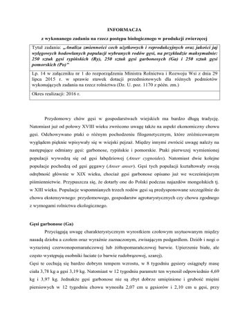 INFORMACJA z wykonanego zadania na rzecz postępu biologicznego w produkcji zwierzęcej Tytuł zadania: „Analiza zmienności cech użytkowych i reprodukcyjnych oraz jakości jaj wylęgowych hodowlanych populacji wybranych rodów gęsi, na przykładzie maksymalnie: 250 sztuk gęsi rypińskich (Ry), 250 sztuk gęsi garbonosych (Ga) i 250 sztuk gęsi pomorskich (Po)” Lp. 14 w załączniku nr 1 do rozporządzenia Ministra Rolnictwa i Rozwoju Wsi z dnia 29 lipca 2015 r. w sprawie stawek dotacji przedmiotowych dla różnych podmiotów wykonujących zadania na rzecz rolnictwa (Dz. U. poz. 1170 z późn. zm.) Okres realizacji: 2016 r. Przydomowy chów gęsi w gospodarstwach wiejskich ma bardzo długą tradycję. Natomiast już od połowy XVIII wieku zwrócono uwagę także na aspekt ekonomiczny chowu gęsi. Odchowywano ptaki o różnym pochodzeniu filogenetycznym, które zróżnicowanym wyglądem pięknie wpisywały się w wiejski pejzaż. Między innymi zwrócić uwagę należy na następujące odmiany gęsi: garbonose, rypińskie i pomorskie. Ptaki pierwszej wymienionej populacji wywodzą się od gęsi łabędziowej (Anser cygnoides). Natomiast dwie kolejne populacje pochodzą od gęsi gęgawy (Anser anser). Gęsi tych populacji kształtowały swoją odrębność głównie w XIX wieku, chociaż gęsi garbonose opisano już we wcześniejszym piśmiennictwie. Przypuszcza się, że dotarły one do Polski podczas najazdów mongolskich tj. w XIII wieku. Populacje wspomnianych trzech rodów gęsi są predysponowane szczególnie do chowu ekstensywnego: przydomowego, gospodarstw agroturystycznych czy chowu zgodnego z wymogami rolnictwa ekologicznego. Gęsi garbonose (Ga) Przyciągają uwagę charakterystycznym wyrostkiem czołowym usytuowanym między nasadą dzioba a czołem oraz wyraźnie zaznaczonym, zwisającym podgardlem. Dziób i nogi o wyrazistej czerwonopomarańczowej lub żółtopomarańczowej barwie. Upierzenie białe, ale często występują osobniki łaciate (o barwie rudobrązowej, szarej). Gęsi te cechują się bardzo dobrym tempem wzrostu, w 8 tygodniu gęsiory osiągnęły masę ciała 3,78 kg a gęsi 3,19 kg. Natomiast w 12 tygodniu parametr ten wynosił odpowiednio 4,69 kg i 3,97 kg. Jednakże gęsi garbonose nie są zbyt dobrze umięśnione i grubość mięśni piersiowych w 12 tygodniu chowu wynosiła 2,07 cm u gęsiorów i 2,10 cm u gęsi, przy długości grzebienia mostka wynoszącej odpowiednio15,98 cm i 15,12 cm. Nie zaleca się tych ptaków do prowadzenia tuczu owsianego. Fot. E. Gornowicz Fot. 1. Gęsi garbonose (Ga) – charakteryzują się białym lub łaciatym upierzeniem i czerwono-pomarańczowym lub żółto-pomarańczowym dziobem i łapami, ale przede wszystkim wyrostkiem czołowym usytuowanym między nasadą dzioba a czołem oraz wyraźnie zaznaczonym, zwisającym podgardlem Produkcji nieśna tych ptaków trwała 21 tygodni i w tym okresie zniosły blisko 50 jaj (49,77) o średniej masie 166 g. Przy zestawieniu stadka w proporcji 1 gęsior na 4 gęsi, zapłodnienie było bardzo dobre i wyniosło 94,70% a wskaźnik wylęgowości z jaj nałożonych 72,28 %. Gęsiory cechowały się lepszą przeżywalnością, wynoszącą w okresach wychowu 93,02 % i reprodukcji 98,88 %. Wskaźnik ten dla samic był gorszy odpowiednio o 0,43 p.p. i 4,1 p.p. Gęsi pomorskie (Po) Ptaki te charakteryzują się walcowatoowalnym tułowiem, o pełnej piersi i brzuchu, z podbrzuszem zaznaczonym jedną fałdą tłuszczową. Dziób i nogi są dobrze wykształcone oraz silne, w kolorze pomarańczowoczerwonym. Najczęściej są spotykane osobniki białe (o oczach jasnoniebieskich), rzadziej siodłate (o oczach brązowozłocistych). W 8 tygodniu odchowu masa ciała gęsiorów wyniosła 3,71 i gęsi 3,34 kg, a po kolejnych czterech tygodniach wyniosła odpowiednio 4,49 kg i 3,89 kg. Skrzydła i grzebień mostka są stosunkowo długie. W 12 tygodniu odchowu długość przedramienia wyniosła 18,20 cm u gęsiorów i 17,18 cm u gęsi, w związku z czym skrzydła były dość wysoko osadzone, ale dobrze przylegały do tułowia. Fot. E. Gornowicz Fot. 2. Gęsi pomorskie (Po) – cechują się białym upierzeniem i pomarańczowo-czerwonym dziobem i łapami oraz długimi i wysoko osadzonymi skrzydłami Natomiast długość grzebienia mostka w 12 tygodniu chowu kształtowała się na poziomie 16,93 (samce) i 15,83 cm (samice) przy grubości mięśni piersiowych odpowiednio 2,06 cm i 1,96 cm. Ptaki te bardzo dobrze nadają się do tuczu owsianego. Okres produkcji jaj gęsi Po trwał 20 tyg. i do tego tygodnia produkcji gęsi zniosły 52,80 jaj o średniej masie 173 g i przy zapłodnieniu 87,64 %. Gęsi te cechowały się przeżywalnością w okresie reprodukcji na średnim poziomie 96,74 %. Gęsi rypińskie (Ry) Ptaki te określane są jako średniej wielkości i taki jest też ich tułów o zaokrąglonym grzbiecie. Nogi są mocne i szeroko rozstawione o barwie, tak jak i dziób, pomarańczowoczerwonej. Ich upierzenie jest przeważnie białe, ale występują osobniki o pojedynczych szarych piórach i łaciate. W 12 tygodniu odchowu charakteryzowały się najmniejszą różnicą masy ciała między samcami (4,36 kg) a samicami (3,87 kg) oraz zwartą budową tułowia (długość grzebienia mostka 15,60 cm u gęsiorów i 15,26 cm u gęsi). Grubość mięśni piersiowych w 12 tygodniu odchowu wynosząca u samców 2,23 cm a u samic 2,12 cm, świadczy o ich bardzo dobrym uformowaniu. W ciągu 20 tygodni produkcji nieśnej gęsi te zniosły 42,31 jaj o masie 179 g, cechujących się jednakże wskaźnikiem wylęgowości z jaj nałożonych na średnim poziomie (71,04 %). Przeżywalność gęsi Ry w całym okresie badań zawierała się od 96,67 % do 96,44 %. Fot. E. Gornowicz Fot. 3. Gęsi rypińskie (Ry) – charakteryzują się głównie białym opierzeniem, bywają osobniki z pojedynczymi szarymi piórami, pomarańczowo-czerwonym dziobem i łapami oraz szyją niezbyt długą, dobrze umięśnioną Populacje gęsi