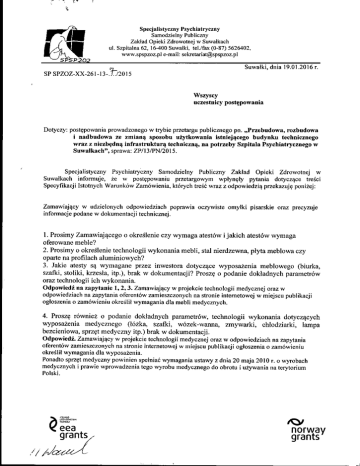 Sp€cjalistyczny Psychirtryczny Samodzielny Publiczny Zaklad opieki Zdrowotnej w Suwalkach ul. Szpitalna 62, 16-400 Suwalki, t€I./fax (0-87) 5626402, www.spspzoz.pl e-mail: [email protected] Suwalki, dnia 19.01.2016 r. sP sP zoz -xx -26t - B -.Yt 20 t 5 Wsryscy uczestnicy postepowalia Dotyczy: postgpowania prowadzonego w trybie przetargu publicznego pn. ,Przebudowa, rozbudowa nadbudowa ze zmiana sposobu uirytkowania istniej4cego budynku technicznego wraz z niezbgdnq infrastruktur4 technicznq, na potrzeby Szpitala Psychiatrycznego w i Suwalkach", sprawa: ZPl13/PN/201 5. Specjalistyczny Psychiatryczny Samodzielny Publiczny Zaklad Opieki Zdrowotnej w Suwalkach informuje, Ze w post9powaniu przetargowym wplyngly pfania dotycz4ce tresci Specyfikacji lstotnych Warunk6w Zam6wienia, kt6rych tresd wraz z odpowiedzi4 przekazujg ponizej: Zamawiaj4cy w udzielonych odpowiedziach poprawia oczywiste omylki pisarskie oraz precyzuje informacje podane w doLumentacji rechnicznej. l. Prosimy Zamawiaj4cego o okeslenie czy wymaga atest6w ijakich atest6w wymaga oferowane meble? 2. Prosimy o okreslenie technologii wykonania mebli, stal nierdzewna, pl1,ta meblowa czy oparte na profilach aluminiowych? 3. Jakie atesty s4 wymagane przez inwestora dotyczqce wyposazenia meblowego (biurka, szafki, stoliki, krzesla, itp.), brak w dokurnentacji? Proszg o podanie dokladnych pammetr6w oraz technologii ich wykonania. Odpowiedi na zapytanie 1,2,3. Zafiawiajqcy w pmjekcie techoologii medyczngj oraz w odpowiedziach na zap)'tania oferent6w zamieszczonych na stronie intemetowej w miejscu publikacji oglosz€nia o zam6wieniu okreslil *rymagania dla mebli medycznych. 4. Proszg r6wnie2 o podanie dokladnych parametr6w, technologii wykonania dotycz4cych wyposazenia medycznego (l6zka" szafki, w6zek-wanna, zmywarki, chlodziarki, lampa bezcieniowa, sprzgt medyczny itp.) brak w dokumentacji. Odpowiede Zamawiaj4cy w projekcie technologii medycznej oraz w odpowiedziach na zaplania oferent6w zamieszczonych na stronie internetowej w miejscu publikacji ogloszenia o zam6wieniu okeSlil wymagania dla wyposazenia. Ponadto sptzgt medyczny powinien spelnia6 \rlmagania ustawy z dnia 20 maja 2010 r. o wyrobach medycznych i prawie wprowadzenia tego wyrobu medycznego do obrotu i uzywania na terytorium Polski. ?;u qrants,, ,/ ,/ /1,/.2d14 ,S/ norwav grants' 5. Czy sprzgt elektroriczny (tj. komputery, telefony, rzutnik, telewizory, itp.) wchodz4 w zakes postgpowania przetargowego? Je(li tak proszg o podanie dokladnych iloici i ich Parametr6w. Odpowiedi. Tak. ZamawiajEcy w projekcie technologii medycznej oraz w odpowiedziach na zap)'tania oferent6w zamieszczonych na stronie internetowej w miejscu publikacji ogloszenia o ,/am6$ieniu okrealil ilo\ci i$maganra dla wyposienia. 6. W przypadku dostawy i montazu wyposazenia technologicznego i budowlano-instalacyjnego zawartego w projekcie technologii medycznej prosimy o podanie cech i parametr6w technicznych wszystkich element6w wyposaZenia. Odpowiedi czgsd 3. ZamawiajAcy ponizej podaje parametry techniczne i ilosci wyposazenia. Pojemnik na mydlo w plynie i plyn dezynfekcyjny uruchamiany bezdotykowo Ilosi - 2 szt. Bezdotykowy dozownik do mydla przeznaczony jest do monta2u natynkowego. Wykonany ze stali szlachetnej, matovr'ej. Zastosowana powierzchnia pozwala zachowad czystosi urz4dzenia na dluzej. Dozownik przystosowany do mydla w plynie i plynu dezynfekcyjnego. . . . . . . . . . . . . Pojemno(i: 800 - 1200m1 Material obudowy: stal szlachetna Wykoiczenie powiezchni: matowe Powierzchnia: ochrona przed odciskiwaniem sig palc6w Grubo66 materialu: minimum 0.8 mm Spos6b uruchamiania: bezdotykowy (czujnik zblizania na podczerwieri) Wizjer do kontroli poziomu mydla Przeznaczenie: mydlo w plynie lub Srodki dezynfekcyjne Tbiomik u ielokrotnego u./upelniania Jedna doza mydla: 0,6 - 1,1 ml Zamek iklucz: metal Wykonawca zobowiqzanyjest dostarczyt sprzet dokonai monta2u, wykonad niezbgdn4 instalacje i podtqczyi urz4dzenia - sprzgt gotowy do uzycia. Lustro icienne kpl - sala 01/21 choreoterapia Lustro przyklejone do iciany o grubosci 6mm, srebme, wykoiiczenie rama lustra, wymiary: dI. 4,5 x szer.2,5 m (l4czone mozliwie zjak naj\,iqkszych elemenl6w). wlkonawca zoborviqzanyjest dostarczyi lustro i dokona6 montazu. Zm)'rvarka naczyli z programem wyparzania Zamawia.j4cy w odpowiedzi na z pytaiia 4 omylkowo niewlaSciwq iloid zmylvarek. z - ilost 2 dnia 05.0t.2016 r. pkt. 8 podal parametry techniczne i W zwi4zkr z rym Zan wiajqcy dokonuje korekty itosciowej. po korekcie ilosi znywarek do naczyi z progmmem wyparzania wynosi 2 szt. eea grants norwav gfants' St6l roboczy z szalkami i szufladami - ilo36 3 wymiary: 110 x 60 x 85 cm - iloSi 2 wymiary: 150 x 60 x 85 cm - iloii I Zlewozm),rryak dwukomorowy z miejscem na zmlavarkg ilosd (st6l ze zlewem dwukomorowym, p6lk4 i miejscem na zmywarkg) wymiary: 180 x 60 x 90 Umywalka porzedkowa ze zlewem - ilo66 2 wymiary: 50x70/50/85 Stril z dwoma zlewami i szaIk4 - iloi6 1 wymiary: 140x60x90 (+-5cm) Szafa kuchenna - ilo(d I wymiary: 60 x 60 x 200 . . . . . . I meble wykonane z atestowanej wysokogatunkowej stali nierdzewnej w gatunku AISI 304 lub innych atestowanych stali nierdzewnych konstrukcja mebli zapewniaj4ca sztywnosd i wyrzymaloSi na r6vmomiemie rozlozone obci4zenia pionowe i boczne drzwi uchylne szafek na zawiasach skzydelkowych lub przesuwne zawieszane na w6zkach rolkowych szuflady na prowadnicach rolkowych o nosnosci minimum 40 kg stopki regulowane z wysokogatunkowego oraz odpomego na zarysowada i chemikalia tworzywa, o zakresie regulacji plyta wierzchnia stolu o gladkiej powierzchni, latwej w utrzymaniu czystosci i odpomej na znisz,czenia, wykonana z blachy o gruboici co najmniej I mm, dodatkowo wygluszona materialami tlumiqcymi drgania i nie chlonqcymi wilgoci plyta ze zlewoztnywakiem wykon),\rana z blachy o gruboSci co najmniej 1,5 mm . . powierzchnia robocza plyty . . . . . . . . . zaglgbieniem zabezpieczaj4cym przed splywaniem wody poza obrys stolu wszystkie kawgdzie wewngtrzne