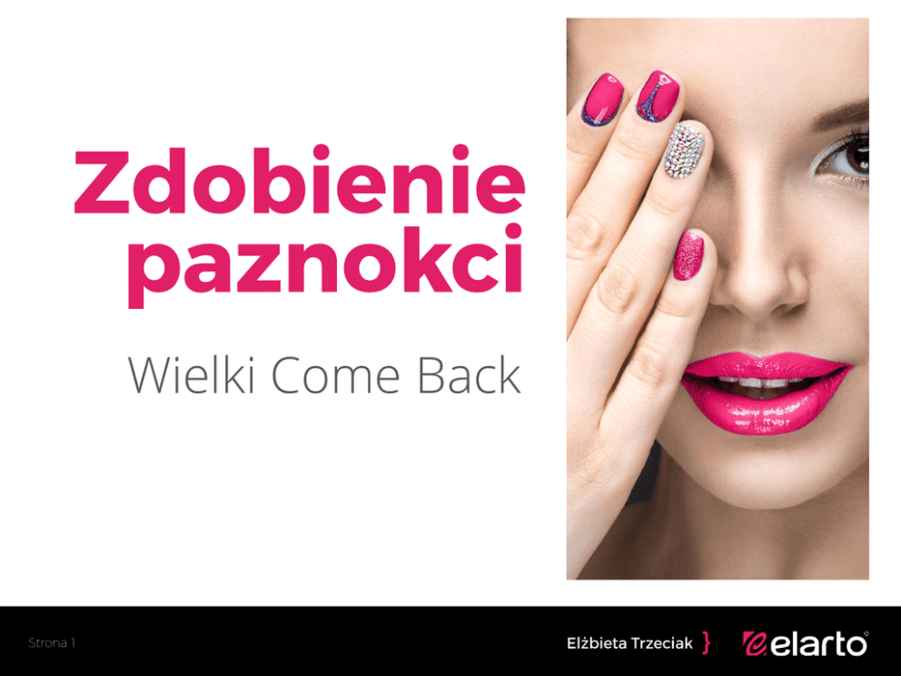 Wielki Come Back 3000 lat p.n.e. Faraon Narmer - barwienie henną wnętrza dłoni, podeszwy stóp i paznokci. Nefretete - barwienie na czerwono paznokci (kolor zastrzeżony wyłącznie dla rodu królewskiego). Chiny - lakier (guma arabska + żelatyna + wosk pszczeli + barwniki roślinne + kurze białko). 600 p.n.e. Chiny - naparstki biżuteryjne ze srebra i złota. 0-1800 n.e. 1900 Renesans - preparaty bezbarwne, - paznokcie w kształcie migdała, - krótkie i lekko wyostrzone, - adaptacja patyczka z drewna pomarańczowego. - Użycie metalowych nożyczek i metalowych pilników, - wcieranie w paznokcie barwionych pudrów i kremów. 1800-1900 Wcieranie oliwy zabarwionej na czerwono. 1910 Flowery manicure products nowy rodzaj pilnika materiał ścierny na drewnianym podkładzie. 1920 Wykorzystanie farb samochodowych jako lakierów do paznokci. 1917 1925 "Nie obcinaj skórek!” reklama w Vogue. Pierwszy zestaw do domowego manicure. Pojawienie się lakierów w odcieniach różu i czerwieni. 1927 1932 Powstaje pierwowzór francuskiego manicure - różowy krem i kredowo biały płyn nakładany pod końcówkę paznokcia. Revlon – powstanie lakieru Dopasowywanie koloru szminki do lakieru. 1930 1934 Gwiazdy filmowe wprowadzają lakiery do mody. Zmywacz i oliwka. G. Garbo - przedłużanie paznokci taśmą filmową i malowanie na czerwono. Maxwell Lappe (dentysta) tworzy sztuczne paznokcie dla osób obgryzających. 1940 1936 Powstaje szablon nakładany na paznokieć zapewniający równe nałożenie lakieru. Rita Hayworth - moda na długie, czerwone paznokcie - bardziej owalne niż ostre. Popularność męskiego manicure. 1937 1950 Zostaje opatentowana metoda stosowania tipsów do naprawy i przedłużania paznokci. Powiększanie gamy kolorów. Moda na owalne i jaśniejsze. 1957 1973 Thomas Slack - patent na foliowe szablony do nakładania akrylu. Moda na kwadratowe paznokcie (konkursy stylizacji, krzywa C). 1970 1976 „Lata 70 latami sztucznych paznokci”. Paznokcie bardzo długie dla bogatych sfer. Powstają pierwsze salony piękności. Jeff Pink - twórca francuskiego manicure. 1995 1982 1979 Firma Sogo - system fiberglass. Pierwszy system żelowy (lampa wynaleziona przez Jamesa Giuliano). Uma Thurman - moda na krótkie, naturalne paznokcie z francuskim manicure lub pomalowane na bardzo ciemne kolory np.: bordo, burgund. 1980 1994 Zaadaptowanie frezarek dentystycznych i jubilerskich. Pierwsze targi i mistrzostwa świata stylizacji. Neonowy szał. Światłoutwardzalny liquid i akryl trafiają na rynek. mini Black & white asymetria moda na paznokciach kokardy pastele spodnie do ślubu ślubna czerwień i neon ekspozycja pleców