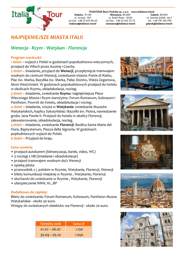ITAIATOUR Biuro Podróży sp. z o.o. www.italiatour.travel Kraków, 31-144 Warszawa, 00-669 Gdańsk, 80-835 ul. Asnyka 10/1 ul. Emilii Plater 10/54 ul. Szeroka 64/66 lok.1 tel./fax: +48 12 633 06 63 tel./fax: +48 22 412 72 72 tel.: +48 791 140 793 [email protected] [email protected] [email protected] NAJPIĘKNIEJSZE MIASTA ITALII Wenecja - Rzym - Watykan - Florencja Program wycieczki: 1 dzień – wyjazd z Polski w godzinach popołudniowo-wieczornych, przejazd do Włoch przez Austrię i Czechy. 2 dzień – śniadanie, przyjazd do Wenecji, przepłynięcie tramwajem wodnym do centrum Wenecji, zwiedzanie miasta: Ponte di Rialto, Plac św. Marka, Bazylika św. Marka, Pałac Dożów, Wieża Zegarowa, Most Westchnień. W godzinach popołudniowych przejazd do hotelu w okolicach Rzymu, obiadokolacja, nocleg. 3 dzień – śniadanie, zwiedzanie Rzymu: najpiękniejsze Place Wiecznego Miasta i Rzym starożytny: Forum Romanum, Koloseum i Pantheon. Powrót do hotelu, obiadokolacja i nocleg. 4 dzień – śniadanie, wizyta w Watykanie: zwiedzanie Muzeów Watykańskich, Kaplicy Sykstyńskiej i Bazyliki św. Piotra, nawiedzenie grobu Jana Pawła II. Przejazd do hotelu w okolicy Florencji, zakwaterowanie, obiadokolacja, nocleg. 5 dzień – śniadanie, zwiedzanie Florencji: Basilica Santa Maria del Fiore, Baptysterium, Piazza della Signoria. W godzinach popłudniowych wyjazd do Polski. 6 dzień – Przyjazd do kraju. Cena zawiera: • przejazd autokarem (klimatyzacja, barek, video, WC) • 3 noclegi z HB (śniadania i obiadokolacje) • przejazd tramwajem wodnym do/z Wenecji • opiekę pilota • przewodnik z j. polskim w Rzymie, Watykanie, Florencji, Wenecji • bilety komunikacji miejskiej w Rzymie , Watykanie, Florencji • słuchawki do zwiedzania w Rzymie , Watykanie, Florencji • ubezpieczenie NNW, KL ,BP Dodatkowo do zapłaty: Bilety do zwiedzania: Forum Romanum, Koloseum, Pantheon Muzea Watykańskie - około 30 euro. Wstępy do zwiedzanych obiektów we Florencji - około 20 euro. Terminy 2016 01.07 – 06.07 30.09 – 05.10 Cena zł 1.150 1.050