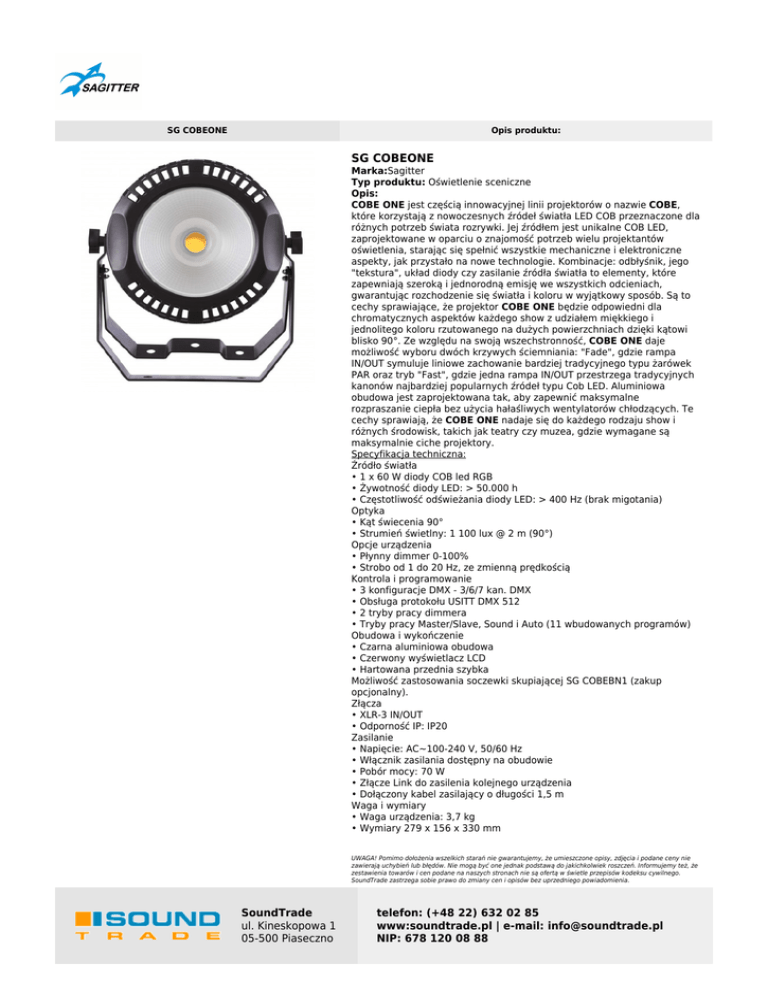SG COBEONE Opis produktu: SG COBEONE Marka:Sagitter Typ produktu: Oświetlenie sceniczne Opis: COBE ONE jest częścią innowacyjnej linii projektorów o nazwie COBE, które korzystają z nowoczesnych źródeł światła LED COB przeznaczone dla różnych potrzeb świata rozrywki. Jej źródłem jest unikalne COB LED, zaprojektowane w oparciu o znajomość potrzeb wielu projektantów oświetlenia, starając się spełnić wszystkie mechaniczne i elektroniczne aspekty, jak przystało na nowe technologie. Kombinacje: odbłyśnik, jego "tekstura", układ diody czy zasilanie źródła światła to elementy, które zapewniają szeroką i jednorodną emisję we wszystkich odcieniach, gwarantując rozchodzenie się światła i koloru w wyjątkowy sposób. Są to cechy sprawiające, że projektor COBE ONE będzie odpowiedni dla chromatycznych aspektów każdego show z udziałem miękkiego i jednolitego koloru rzutowanego na dużych powierzchniach dzięki kątowi blisko 90°. Ze względu na swoją wszechstronność, COBE ONE daje możliwość wyboru dwóch krzywych ściemniania: "Fade", gdzie rampa IN/OUT symuluje liniowe zachowanie bardziej tradycyjnego typu żarówek PAR oraz tryb "Fast", gdzie jedna rampa IN/OUT przestrzega tradycyjnych kanonów najbardziej popularnych źródeł typu Cob LED. Aluminiowa obudowa jest zaprojektowana tak, aby zapewnić maksymalne rozpraszanie ciepła bez użycia hałaśliwych wentylatorów chłodzących. Te cechy sprawiają, że COBE ONE nadaje się do każdego rodzaju show i różnych środowisk, takich jak teatry czy muzea, gdzie wymagane są maksymalnie ciche projektory. Specyfikacja techniczna: Źródło światła • 1 x 60 W diody COB led RGB • Żywotność diody LED: > 50.000 h • Częstotliwość odświeżania diody LED: > 400 Hz (brak migotania) Optyka • Kąt świecenia 90° • Strumień świetlny: 1 100 lux @ 2 m (90°) Opcje urządzenia • Płynny dimmer 0-100% • Strobo od 1 do 20 Hz, ze zmienną prędkością Kontrola i programowanie • 3 konfiguracje DMX - 3/6/7 kan. DMX • Obsługa protokołu USITT DMX 512 • 2 tryby pracy dimmera • Tryby pracy Master/Slave, Sound i Auto (11 wbudowanych programów) Obudowa i wykończenie • Czarna aluminiowa obudowa • Czerwony wyświetlacz LCD • Hartowana przednia szybka Możliwość zastosowania soczewki skupiającej SG COBEBN1 (zakup opcjonalny). Złącza • XLR-3 IN/OUT • Odporność IP: IP20 Zasilanie • Napięcie: AC~100-240 V, 50/60 Hz • Włącznik zasilania dostępny na obudowie • Pobór mocy: 70 W • Złącze Link do zasilenia kolejnego urządzenia • Dołączony kabel zasilający o długości 1,5 m Waga i wymiary • Waga urządzenia: 3,7 kg • Wymiary 279 x 156 x 330 mm UWAGA! Pomimo dołożenia wszelkich starań nie gwarantujemy, że umieszczone opisy, zdjęcia i podane ceny nie zawierają uchybień lub błędów. Nie mogą być one jednak podstawą do jakichkolwiek roszczeń. Informujemy też, że zestawienia towarów i cen podane na naszych stronach nie są ofertą w świetle przepisów kodeksu cywilnego. SoundTrade zastrzega sobie prawo do zmiany cen i opisów bez uprzedniego powiadomienia. SoundTrade ul. Kineskopowa 1 05-500 Piaseczno telefon: (+48 22) 632 02 85 www:soundtrade.pl | e-mail: [email protected] NIP: 678 120 08 88
