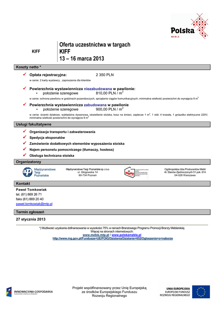 Oferta uczestnictwa w targach KIFF 13 – 16 marca 2013 KIFF Koszty netto * Opłata rejestracyjna: 2 350 PLN w cenie: 2 karty wystawcy , zaproszenia dla klientów Powierzchnia wystawiennicza niezabudowana w pawilonie: połoŜenie szeregowe ▪ 810,00 PLN / m 2 w cenie: ochrona pawilonu w godzinach pozaroboczych, sprzątanie ciągów komunikacyjnych; minimalna wielkość powierzchni do wynajęcia 9 m2 Powierzchnia wystawiennicza zabudowana w pawilonie połoŜenie szeregowe ▪ 900,00 PLN / m 2 w cenie: ścianki działowe, wykładzina dywanowa, oświetlenie stoiska, kosz na śmieci, zaplecze 1 m2, 1 stół, 4 krzesła, 1 gniazdko elektryczne 220V; 2 minimalna wielkość powierzchni do wynajęcia 9 m Usługi fakultatywne Organizacja transportu i zakwaterowania Spedycja eksponatów Zamówienie dodatkowych elementów wyposaŜenia stoiska Najem personelu pomocniczego (tłumaczy, hostess) Obsługa techniczna stoiska Organizatorzy Międzynarodowe Targi Poznańskie sp. z o.o. ul. Głogowska 14 60-734 Poznań Ogólnopolska Izba Producentów Mebli Al. Stanów Zjednoczonych 51 pok. 614 04-028 Warszawa Kontakt Paweł Tomkowiak tel. (61) 869 26 71 faks (61) 869 20 40 [email protected] Termin zgłoszeń 27 stycznia 2013 *| MoŜliwość uzyskania dofinansowania w wysokości 75% w ramach BranŜowego Programu Promocji BranŜy Meblarskiej. Więcej na stronach internetowych: www.meble.mtp.pl / www.polskameble.pl http://www.mg.gov.pl/Fundusze+UE/POIG/Dzialania/Dzialanie+652/Ogloszenie+o+naborze Projekt współfinansowany przez Unię Europejską ze środków Europejskiego Funduszu Rozwoju Regionalnego