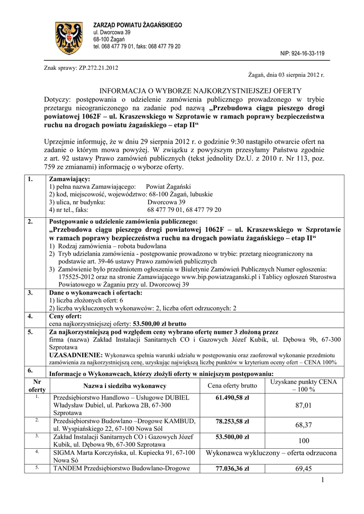 ZARZĄD POWIATU ŻAGAŃSKIEGO ul. Dworcowa 39 68-100 Żagań tel. 068 477 79 01, faks: 068 477 79 20 NIP: 924-16-33-119 Znak sprawy: ZP.272.21.2012 Żagań, dnia 03 sierpnia 2012 r. INFORMACJA O WYBORZE NAJKORZYSTNIEJSZEJ OFERTY Dotyczy: postępowania o udzielenie zamówienia publicznego prowadzonego w trybie przetargu nieograniczonego na zadanie pod nazwą „Przebudowa ciągu pieszego drogi powiatowej 1062F – ul. Kraszewskiego w Szprotawie w ramach poprawy bezpieczeństwa ruchu na drogach powiatu żagańskiego – etap II“ Uprzejmie informuję, że w dniu 29 sierpnia 2012 r. o godzinie 9:30 nastąpiło otwarcie ofert na zadanie o którym mowa powyżej. W związku z powyższym przesyłamy Państwu zgodnie z art. 92 ustawy Prawo zamówień publicznych (tekst jednolity Dz.U. z 2010 r. Nr 113, poz. 759 ze zmianami) informację o wyborze oferty. 1. Zamawiający: 1) pełna nazwa Zamawiającego: Powiat Żagański 2) kod, miejscowość, województwo: 68-100 Żagań, lubuskie 3) ulica, nr budynku: Dworcowa 39 4) nr tel., faks: 68 477 79 01, 68 477 79 20 2. Postępowanie o udzielenie zamówienia publicznego: „Przebudowa ciągu pieszego drogi powiatowej 1062F – ul. Kraszewskiego w Szprotawie w ramach poprawy bezpieczeństwa ruchu na drogach powiatu żagańskiego – etap II“ 1) Rodzaj zamówienia – robota budowlana 2) Tryb udzielania zamówienia - postępowanie prowadzono w trybie: przetarg nieograniczony na podstawie art. 39-46 ustawy Prawo zamówień publicznych 3) Zamówienie było przedmiotem ogłoszenia w Biuletynie Zamówień Publicznych Numer ogłoszenia: 175525-2012 oraz na stronie Zamawiającego www.bip.powiatzaganski.pl i Tablicy ogłoszeń Starostwa Powiatowego w Żaganiu przy ul. Dworcowej 39 Dane o wykonawcach i ofertach: 1) liczba złożonych ofert: 6 2) liczba wykluczonych wykonawców: 2, liczba ofert odrzuconych: 2 Ceny ofert: cena najkorzystniejszej oferty: 53.500,00 zł brutto Za najkorzystniejszą pod względem ceny wybrano ofertę numer 3 złożoną przez firma (nazwa) Zakład Instalacji Sanitarnych CO i Gazowych Józef Kubik, ul. Dębowa 9b, 67-300 Szprotawa UZASADNIENIE: Wykonawca spełnia warunki udziału w postępowaniu oraz zaoferował wykonanie przedmiotu 3. 4. 5. zamówienia za najkorzystniejszą cenę, uzyskując największą liczbę punktów w kryterium oceny ofert – CENA 100% 6. Nr oferty 1. 2. 3. 4. 5. Informacje o Wykonawcach, którzy złożyli oferty w niniejszym postępowaniu: Uzyskane punkty CENA Cena oferty brutto Nazwa i siedziba wykonawcy – 100 % Przedsiębiorstwo Handlowo – Usługowe DUBIEL 61.490,58 zł Władysław Dubiel, ul. Parkowa 2B, 67-300 87,01 Szprotawa Przedsiębiorstwo Budowlano –Drogowe KAMBUD, 78.253,58 zł 68,37 ul. Wyspiańskiego 22, 67-100 Nowa Sól Zakład Instalacji Sanitarnych CO i Gazowych Józef 53.500,00 zł 100 Kubik, ul. Dębowa 9b, 67-300 Szprotawa SIGMA Marta Korczyńska, ul. Kupiecka 91, 67-100 Wykonawca wykluczony – oferta odrzucona Nowa Só TANDEM Przedsiębiorstwo Budowlano-Drogowe 77.036,36 zł 69,45 1 ZARZĄD POWIATU ŻAGAŃSKIEGO ul. Dworcowa 39 68-100 Żagań tel. 068 477 79 01, faks: 068 477 79 20 6. Sp z o.o., ul. Pułaskiego 8, 68-200 Żary Firma Handlowo – Usługowa Maciej Berger, ul. Dołanowo 4, 68-120 Iłowa NIP: 924-16-33-119 Wykonawca wykluczony – oferta odrzucona 2