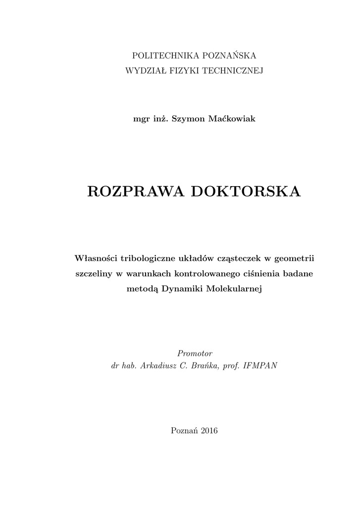 POLITECHNIKA POZNAŃSKA WYDZIAŁ FIZYKI TECHNICZNEJ mgr inż. Szymon Maćkowiak ROZPRAWA DOKTORSKA Własności tribologiczne układów cząsteczek w geometrii szczeliny w warunkach kontrolowanego ciśnienia badane metodą Dynamiki Molekularnej Promotor dr hab. Arkadiusz C. Brańka, prof. IFMPAN Poznań 2016 STRESZCZENIE W rozprawie przedstawione zostały wyniki badań własności tribologicznych układów oddziałujących cząsteczek ograniczonych ruchomymi ścianami w warunkach zewnętrznego obciążenia oraz metoda Nierównowagowej Dynamiki Molekularnej. W części metodologicznej omówiono problem symulowania układów w warunkach ograniczenia fizycznymi ścianami oraz wprowadzono nowy, mikroskopowy schemat kontroli temperatury, ciśnienia i ścinania w geometrii szczeliny. Zaproponowane równania ruchu zachowują pęd całkowity i pozwalają sformułować nowe wyrażenie na współczynnik tarcia, a ich postać oraz interpretacja znajduje uzasadnienie we współczesnych modelach tarcia. W oparciu o zaproponowane równania ruchu, wykonano obliczenia dla układu typu szczeliny, zbudowanego z kilku tysięcy cząsteczek oddziałujących potencjałem LennardaJonesa, ograniczonych ścianami krystalicznymi lub amorficznymi, w warunkach kontrolowanego ciśnienia, temperatury i ścinania. Rozprawa omawia tworzące się stany stacjonarne i przedstawia otrzymane mapy stanów stacjonarnych, współczynnika tarcia i siły tarcia, zarówno dla układów ograniczonych ścianami krystalicznymi jak i amorficznymi. Przeprowadzone badania pozwoliły zaobserwować i częściowo wyjaśnić szereg zjawisk takich jak nadśliskość, drgania cierne oraz negatywna wartość różniczkowego współczynnika tarcia. Pokazano istnienie związku pomiędzy tworzącymi się stanami stacjonarnymi a współczynnikiem tarcia w układzie oraz istotny wpływ chropowatości ograniczających ścian na właściwości tribologiczne układu. ABSTRACT In this dissertation the research of tribological systems of interacting particles confined between moving walls under external load as well as the method of Non-equilibrium Molecular Dynamics have been presented. The problem of simulating systems confined between physical walls and the introduction of a new, microscopic scheme of temperature, pressure and shear rate control in the slit geometry have been presented in the methodological part. The proposed equations of motion conserve total momentum of the system and allow to introduce a new expression for friction coefficient, while their form and interpretation is justified in modern models of friction. Based on the proposed equations of motion calculations for a slit model composed of several thousands of molecules interacting via Lennard-Jones potential, confined by crystalline and amorphous walls, under external pressure, temperature and shear rate control have been performed. The observed structures and obtained maps of stationary states, maps of friction coefficient and maps of friction force for both types of confinement between crystalline and amorphous walls have been presented. Performed simulations allowed to observe and partially explain such phenomena as superlubricity, stick-slip motion and negative differential coefficient of friction. The relation between the stationary states and the corresponding friction coefficient in the system have been noticed along with a significant impact of confining walls’ roughness on the tribological properties of the system. Serdecznie dziękuję Panu Profesorowi IFMPAN Arkadiuszowi Brańce, za naukową opiekę i wszelką pomoc w trakcie studiów doktoranckich oraz wskazówki w czasie pisania tej pracy. Dziękuję pracownikom Wydziału Fizyki Technicznej Politechniki Poznańskiej, w szczególności Profesorom Ryszardowi Czajce, Piotrowi Pierańskiemu, Marianowi Radnemu oraz doktorowi hab. Arkadiuszowi Ptakowi, za pomoc i życzliwość na różnych etapach mojego doktoratu. Dziękuję najbliższym, w których zawsze miałem wsparcie. LISTA SYMBOLI I SKRÓTÓW F − siła p − pęd r − położenie U − energia potencjalna układu K − energia kinetyczna układu N − liczba cząsteczek µ − współczynnik tarcia RW T − różniczkowy współczynnik tarcia v0 − zadana prędkość ścinania T0 − zadana temperatura PN − zadane ciśnienie normalne LJ − potencjał Lennarda-Jonesa W CA − potencjał Weeks–Chandler–Andersen P H − potencjał Petravic-Harrowell M D − dynamika molekularna N EM D − nierównowagowa dynamika molekularna N H − termostat Noségo-Hoovera V S − skalowanie prędkości L − stan ciekły CL − stan centralnej lokalizacji SK-SL − stan drgań ciernych P S − stan nieruchomego czopu AM − stan asymetrycznego topnienia M OP − metoda płaszczyzn BG − barostat globalny BM − barostat mikroskopowy P T − model Prandtla AF M − mikroskop sił atomowych SF A − aparat sił powierzchniowych QCM − technika mikrowagi kwarcowej M EM S − mikroukład elektroniczno-mechaniczny N EM S − nanoukład elektroniczno-mechaniczny F F − ograniczenie ścianami krystalicznymi RR − ograniczenie ścianami amorficznymi Spis treści 1 Wstęp 11 2 Zjawisko tarcia 17 2.1 Historyczne hipotezy i modele tarcia suchego . . . . . . . . . . . . . . . . 19 2.2 Współczesne hipotezy tarcia suchego . . . . . . . . . . . . . . . . . . . . 21 2.3 Molekularne hipotezy tarcia . . . . . . . . . . . . . . . . . . . . . . . . . 23 2.4 Hipotezy tarcia wewnętrznego w płynach . . . . . . . . . . . . . . . . . . 26 3 Metoda symulacji tarcia w mikroszczelinie 29 3.1 Budowa ścian . . . . . . . . . . . . . . . . . . . . . . . . . . . . . . . . . 29 3.2 Kontrola temperatury . . . . . . . . . . . . . . . . . . . . . . . . . . . . 33 3.2.1 Skalowanie prędkości w ścianach . . . . . . . . . . . . . . . . . . . 35 3.2.2 Zmodyfikowany termostat Noségo-Hoovera . . . . . . . . . . . . . 35 Obliczanie ciśnienia . . . . . . . . . . . . . . . . . . . . . . . . . . . . . . 