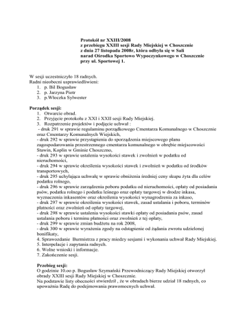 Protokół nr XXIII/2008 z przebiegu XXIII sesji Rady Miejskiej w Choszcznie z dnia 27 listopada 2008r, która odbyła się w Sali narad Ośrodka Sportowo Wypoczynkowego w Choszcznie przy ul. Sportowej 1. W sesji uczestniczyło 18 radnych. Radni nieobecni usprawiedliwieni: 1. p. Bil Bogusław 2. p. Jarzyna Piotr 3. p.Włoczka Sylwester Porządek sesji: 1. Otwarcie obrad. 2. Przyjęcie protokołu z XXI i XXII sesji Rady Miejskiej. 3. Rozpatrzenie projektów i podjęcie uchwał : - druk 291 w sprawie regulaminu porządkowego Cmentarza Komunalnego w Choszcznie oraz Cmentarzy Komunalnych Wiejskich, - druk 292 w sprawie przystąpienia do sporządzenia miejscowego planu zagospodarowania przestrzennego cmentarza komunalnego w obrębie miejscowości Stawin, Koplin w Gminie Choszczno, - druk 293 w sprawie ustalenia wysokości stawek i zwolnień w podatku od nieruchomości, - druk 294 w sprawie określenia wysokości stawek i zwolnień w podatku od środków transportowych, - druk 295 uchylająca uchwałę w sprawie obniŜenia średniej ceny skupu Ŝyta dla celów podatku rolnego, - druk 296 w sprawie zarządzenia poboru podatku od nieruchomości, opłaty od posiadania psów, podatku rolnego i podatku leśnego oraz opłaty targowej w drodze inkasa, wyznaczenia inkasentów oraz określenia wysokości wynagrodzenia za inkaso, - druk 297 w sprawie określenia wysokości stawek, zasad ustalania i poboru, terminów płatności oraz zwolnień od opłaty targowej, - druk 298 w sprawie ustalenia wysokości stawki opłaty od posiadania psów, zasad ustalania poboru i terminu płatności oraz zwolnień z tej opłaty, - druk 299 w sprawie zmian budŜetu na rok 2008, - druk 300 w sprawie wyraŜenia zgody na odstąpienie od Ŝądania zwrotu udzielonej bonifikaty, 4. Sprawozdanie Burmistrza z pracy miedzy sesjami i wykonania uchwał Rady Miejskiej. 5. Interpelacje i zapytania radnych. 6. Wolne wnioski i informacje. 7. Zakończenie sesji. Przebieg sesji: O godzinie 10.oo p. Bogusław Szymański Przewodniczący Rady Miejskiej otworzył obrady XXIII sesji Rady Miejskiej w Choszcznie. Na podstawie listy obecności stwierdził , Ŝe w obradach bierze udział 18 radnych, co upowaŜnia Radę do podejmowania prawomocnych uchwał. Następnie przywitał radnych, p. Burmistrza Roberta Adamczyka, sołtysów w tym nowo wybranego sołtysa Smolenia p. Małgorzatę Pawlak, kolejno przewodniczących zarządów osiedli, przedstawicieli zakładów pracy, prasy i uczestniczących mieszkańców Gminy. Na sekretarza obrad wyznaczył radnego p. Mirosława Jędrowskiego. p. Przewodniczący zaproponował radnym porządek sesji, jaki otrzymali w zawiadomieniu o terminie i miejscu sesji. p. Burmistrz zgłosił propozycje do porządku obrad tj: o skreślenie druku 295 i przyjęcie drugiej wersji druku 295, oraz o włączenie dodatkowego projektu uchwały na druku 303 zmieniający uchwałę nr XX/282/2008 Rady Miejskiej w Choszcznie w sprawie przyjęcia „Wieloletniego Planu Inwestycyjnego Gminy Choszczno na lata 2007 – 2015” Innych uwag do porządku nie zgłoszono.. poprawki do porządku obrad (radni wyrazili zgodę na jedno głosowanie) radni przyjęli 18 głosami „za”, i cały porządek sesji wraz z naniesionymi poprawki przyjęli 18 głosami „za”. Ad.2. W tym punkcie przyjętego porządku p. Przewodniczący zaproponował radnym przyjęcie protokołu z XXI i XXII sesji Rady Miejskiej bez odczytywania, poniewaŜ protokoły były wyłoŜone w biurze Rady, nikt uwag nie zgłosił. Radni bez uwag przyjęli protokół z XXI i XXII sesji 18 głosami „za”. Ad.3. Rozpatrzenie projektów uchwał na drukach kolejno przedstawiał p. Burmistrz: - na druku 291 w sprawie regulaminu porządkowego Cmentarza Komunalnego w Choszcznie oraz cmentarzy komunalnych wiejskich - zgłosił autopoprawkę do zapisu treści uchwały w postaci poprawki redakcyjnej i załączniku nr 1 i 2 w § 2 skreślić pkt 7 i 8 a w pkt.9 skreślić słowa „ 20 lat” w pkt.14 dopisać na końcu „ na stronie internetowej cmentarza” . Dalej p. Burmistrz podał w uzasadnieniu, Ŝe zgodnie z wymogami ustawowymi naleŜy w regulaminie zapisać konieczne zmiany, a na cmentarzach wiejskich wprowadzić równieŜ ujednolicone zapisy. Regulamin wprowadza jednakowe zasady dotyczące korzystania z urządzeń cmentarzy, a takŜe zapewni porządek i utrzymanie właściwego stanu estetycznego terenu przeznaczonego pod pochówek zmarłych. W dyskusji nad projektem uchwały pytał p. Zółkiewicz o zapis § 1pkt.1 – zapis ten wyjaśnił radca p. Kozłowski, iŜ uregulowania o które pytał radny są zawarte w uchwale t cen za usługi cmentarne. Dalszej dyskusji nad projektem nie było. Uchwała wraz z autopoprawkami została podjęta przez radnych16 głosami „za”, 2 wstrzymującymi, przy obecnych 18 radnych na sali. Nr uchwały XXIII/309/2008. - druk 292 w sprawie przystąpienia do sporządzenia miejscowego planu zagospodarowania przestrzennego cmentarza komunalnego w obrębie miejscowości Stawin, Koplin w gminie Choszczno przedstawił p. Burmistrz podając w uzasadnieniu, Ŝe powodem wprowadzenia tej uchwały jest zapewnienie lokalizacji dla pochówku zmarłych. Zgodnie ze studium uwarunkowań i kierunków zagospodarowania przestrzennego istnieje obowiązek sporządzenia mpzp dla wskazanego terenu w obrębie Stawina i Koplina. Teren pod cmentarz wynosi 100 ha. śadna komisja uwag do projektu nie wniosła, na sesji dyskusji nie podjęto. Uchwała została podjęta 18 głosami „za”, przy obecnych 18 radnych na sali. Nr uchwały XXIII/310/2008. - druk 293 w sprawie ustalenia wysokości stawek i zwolnień w podatku od nieruchomości przedstawił p. Burmistrz podając w uzasadnieniu iŜ uwzględnione zostały stawki Ministra Finansów w sprawie wysokości górnych granic stawek kwotowych w podatkach i opłatach lokalnych. Jednocześnie zróŜnicowane zostały stawki podatku od nieruchomości w zakresie budowli, wprowadzono obok stawki podstawowej stawkę preferencyjn