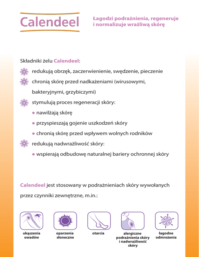 Łagodzi podrażnienia, regeneruje i normalizuje wrażliwą skórę Składniki żelu Calendeel: redukują obrzęk, zaczerwienienie, swędzenie, pieczenie chronią skórę przed nadkażeniami (wirusowymi, bakteryjnymi, grzybiczymi) stymulują proces regeneracji skóry: • nawilżają skórę • przyspieszają gojenie uszkodzeń skóry • chronią skórę przed wpływem wolnych rodników redukują nadwrażliwość skóry: • wspierają odbudowę naturalnej bariery ochronnej skóry Calendeel jest stosowany w podrażnieniach skóry wywołanych przez czynniki zewnętrzne, m.in.: ukąszenia owadów oparzenia słoneczne otarcia alergiczne podrażnienia skóry i nadwrażliwość skóry łagodne odmrożenia ATUR N B PAR A DN NE AL SKŁ BE Z KO AR ABE NS WN NÓ ER IK W, WA ÓW NT , ÓW IKI Calendeel ma skład przyjazny skórze: 11 naturalnych składników bez parabenów bez barwników bez konserwantów Żel Calendeel: jest dobrze tolerowany szybko się wchłania nie pozostawia śladów na skórze, ubraniu (nie brudzi) daje uczucie świeżości jest w aluminiowej tubie, która nie zasysa powietrza, chroniąc zawartość Jak stosować Calendeel Nanosić żel na zmienione obszary skóry w miarę potrzeby, jednokrotnie lub kilkakrotnie w ciągu dnia, a następnie wmasować delikatnie w czystą i suchą skórę. ukąszenia owadów Składniki żelu Calendeel: • redukują obrzęk, pieczenie, swędzenie • wspomagają proces gojenia • chronią przed nadkażeniami • wspierają proces regeneracji skóry oparzenia słoneczne Składniki żelu Calendeel: • redukują stan zapalny • wspomagają proces gojenia • nawilżają skórę • chronią przed wpływem wolnych rodników • wspierają funkcje obronne skóry pokrzywa żegawka (Urtica urens) pszczoła miodna (Apis mellifica) nagietek lekarski (Calendula officinalis) eukaliptus gałkowy (Eucalyptus globulus) jeżówka wąskolistna (Echinacea angustifolia) sosna zwyczajna (Pinus silvestris) trawa cytronelowa (Cymbopogon winterianus) dziki rozmaryn (Ledum palustre) lawenda wąskolistna (Lavandula angustifolia) witamina E nagietek lekarski (Calendula officinalis) jeżówka wąskolistna (Echinacea angustifolia) aloes zwyczajny (Aloe barbadensis) pszczoła miodna (Apis mellifica) trawa cytronelowa (Cymbopogon winterianus) eukaliptus gałkowy (Eucalyptus globulus) alergiczne podrażnienia skóry (skóra nadwrażliwa) Składniki żelu Calendeel: • redukują stan zapalny • nawilżają • znoszą nadwrażliwość skóry • wspierają proces regeneracji skóry • wzmacniają barierę ochronną skóry otarcia Składniki żelu Calendeel: • dzialają antyseptycznie • wspierają proces gojenia i regeneracji skóry łagodne odmrożenia Składniki żelu Calendeel: • redukują stan zapalny • nawilżają • wspierają proces gojenia i regeneracji skóry • wzmacniją barierę obronną skóry nagietek lekarski (Calendula officinalis) jeżówka wąskolistna (Echinacea angustifolia) aloes zwyczajny (Aloe barbadensis) pszczoła miodna (Apis mellifica) trawa cytronelowa (Cymbopogon winterianus) eukaliptus gałkowy (Eucalyptus globulus) witamina E lawenda wąskolistna (Lavandula angustifolia) dziki rozmaryn (Ledum palustre) nagietek lekarski (Calendula officinalis) eukaliptus gałkowy (Eucalyptus globulus) jeżówka wąskolista (Echinacea angustifolia) aloes zwyczajny (Aloe barbadensis) witamina E nagietek lekarski (Calendula officinalis) jeżówka wąskolistna (Echinacea angustifolia) aloes zwyczajny (Aloe barbadensis) pszczoła miodna (Apis mellifica) trawa cytronelowa (Cymbopogon winterianus) eukaliptus gałkowy (Eucalyptus globulus) lawenda wąskolistna (Lavandula angustifolia) witamina E Bogaty, naturalny skład przyjazny wrażliwej skórze Redukcja stanu zapalnego nagietek lekarski (Calendula officinalis) jeżówka wąskolistna (Echinacea angustifolia) aloes zwyczajny (Aloe barbadensis) pszczoła miodna (Apis mellifica) trawa cytronelowa (Cymbopogon winterianus) Regeneracja skóry jeżówka wąskolistna (Echinacea angustifolia) aloes zwyczajny (Aloe barbadensis) lawenda wąskolistna (Lavandula angustifolia) witamina E Zniesienie nadwrażliwości pszczoła miodna (Apis mellifica) witamina E jeżówka wąskolistna (Echinacea angustifolia) Wspomaganie procesu gojenia nagietek lekarski (Calendula officinalis) eukaliptus gałkowy (Eucalyptus globulus) Ochrona przed nadkażeniami jeżówka wąskolistna (Echinacea angustifolia) eukaliptus gałkowy (Eucalyptus globulus) sosna zwyczajna (Pinus silvestris) trawa cytronelowa (Cymbopogon winterianus) Wsparcie funkcji obronnych skóry jeżówka wąskolistna (Echinacea angustifolia) Bogaty, naturalny skład przyjazny wrażliwej skórze Nawilżenie skóry aloes zwyczajny (Aloe barbadensis) witamina E Redukcja pieczenia, swędzenia pokrzywa żegawka (Urtica urens) pszczoła miodna (Apis mellifica) Neutraliacja toksyn zawartych w jadzie owadów dziki rozmaryn (Ledum palustre) trawa cytronelowa (Cymbopogon winterianus) Redukcja obrzęku pszczoła miodna (Apis mellifica) Działanie antyseptyczne dziki rozmaryn (Ledum palustre) lawenda wąskolistna (Lavandula angustifolia) Repelenty lawenda wąskolistna (Lavandula angustifolia) dziki rozmaryn (Ledum palustre) Bogaty, naturalny skład przyjazny wrażliwej skórze Naturalne składniki żelu Calendeel: jeżówka wąskolistna (Echinacea angustifolia) nagietek lekarski (Calendula officinalis) pokrzywa żegawka (Urtica urens) dziki rozmaryn (Ledum palustre) aloes zwyczajny (Aloe barbadensis) sosna zwyczajna (Pinus silvestris) eukaliptus gałkowy (Eucalyptus globulus) lawenda wąskolistna (Lavandula angustifolia) trawa cytronelowa (Cymbopogon winterianus) pszczoła miodna (Apis mellifica) witamina E