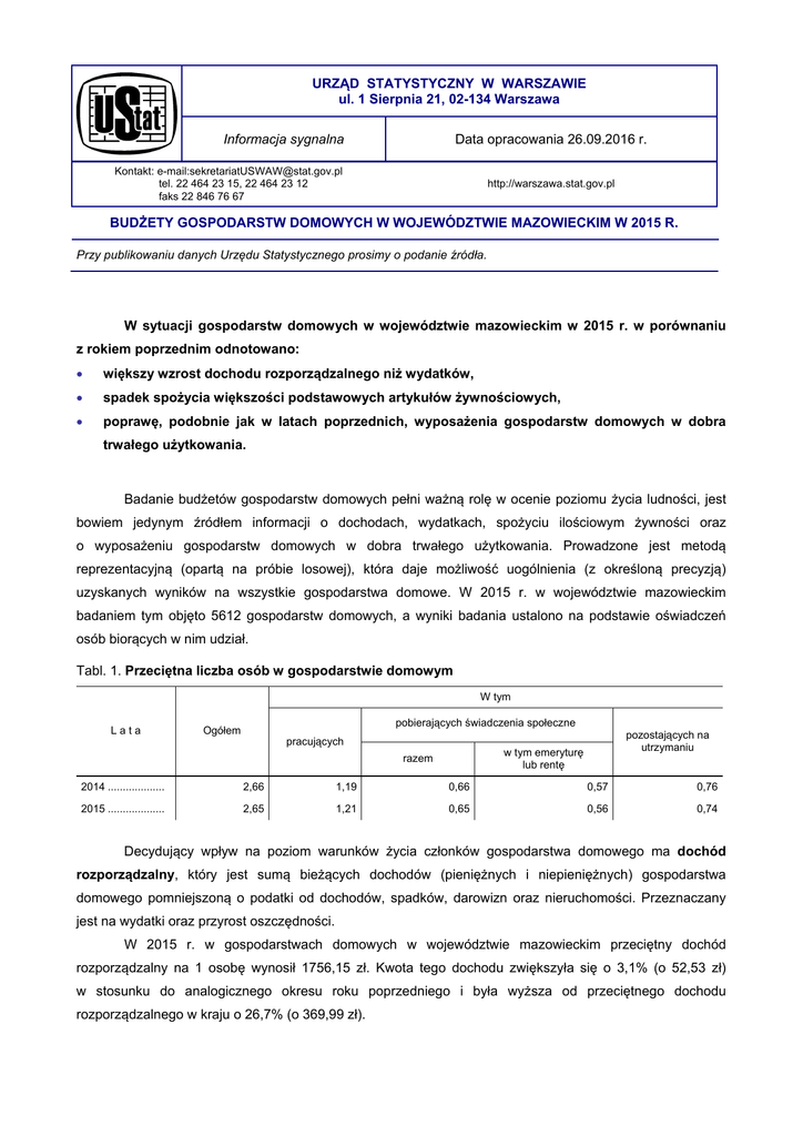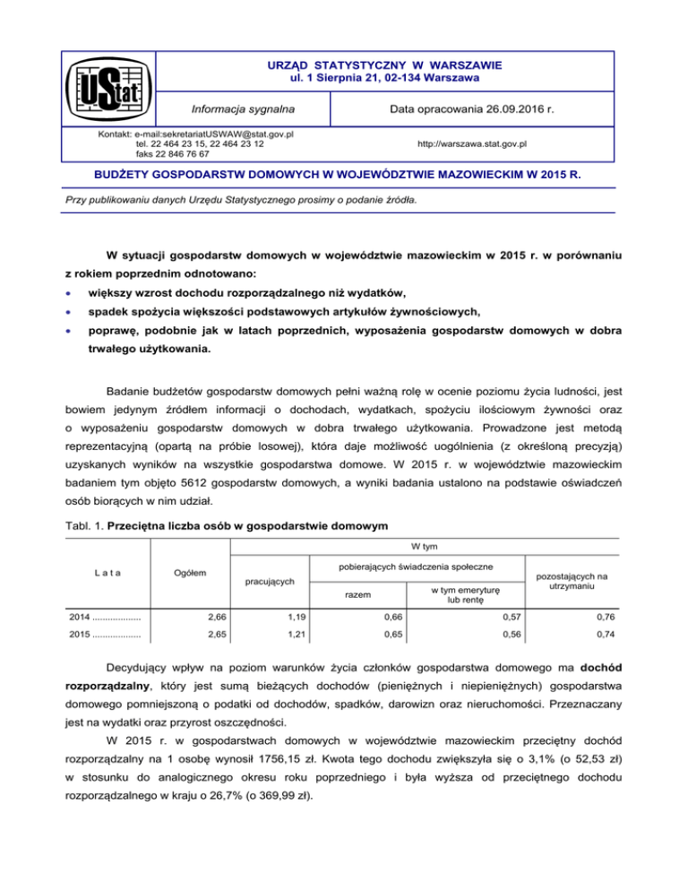 URZĄD STATYSTYCZNY W WARSZAWIE ul. 1 Sierpnia 21, 02-134 Warszawa Data opracowania 26.09.2016 r. Informacja sygnalna Kontakt: e-mail:[email protected] tel. 22 464 23 15, 22 464 23 12 faks 22 846 76 67 http://warszawa.stat.gov.pl BUDŻETY GOSPODARSTW DOMOWYCH W WOJEWÓDZTWIE MAZOWIECKIM W 2015 R. Przy publikowaniu danych Urzędu Statystycznego prosimy o podanie źródła. W sytuacji gospodarstw domowych w województwie mazowieckim w 2015 r. w porównaniu z rokiem poprzednim odnotowano: większy wzrost dochodu rozporządzalnego niż wydatków, spadek spożycia większości podstawowych artykułów żywnościowych, poprawę, podobnie jak w latach poprzednich, wyposażenia gospodarstw domowych w dobra trwałego użytkowania. Badanie budżetów gospodarstw domowych pełni ważną rolę w ocenie poziomu życia ludności, jest bowiem jedynym źródłem informacji o dochodach, wydatkach, spożyciu ilościowym żywności oraz o wyposażeniu gospodarstw domowych w dobra trwałego użytkowania. Prowadzone jest metodą reprezentacyjną (opartą na próbie losowej), która daje możliwość uogólnienia (z określoną precyzją) uzyskanych wyników na wszystkie gospodarstwa domowe. W 2015 r. w województwie mazowieckim badaniem tym objęto 5612 gospodarstw domowych, a wyniki badania ustalono na podstawie oświadczeń osób biorących w nim udział. Tabl. 1. Przeciętna liczba osób w gospodarstwie domowym W tym Lata pobierających świadczenia społeczne Ogółem pracujących pozostających na utrzymaniu w tym emeryturę lub rentę razem 2014 ................... 2,66 1,19 0,66 0,57 0,76 2015 ................... 2,65 1,21 0,65 0,56 0,74 Decydujący wpływ na poziom warunków życia członków gospodarstwa domowego ma dochód rozporządzalny, który jest sumą bieżących dochodów (pieniężnych i niepieniężnych) gospodarstwa domowego pomniejszoną o podatki od dochodów, spadków, darowizn oraz nieruchomości. Przeznaczany jest na wydatki oraz przyrost oszczędności. W 2015 r. w gospodarstwach domowych w województwie mazowieckim przeciętny dochód rozporządzalny na 1 osobę wynosił 1756,15 zł. Kwota tego dochodu zwiększyła się o 3,1% (o 52,53 zł) w stosunku do analogicznego okresu roku poprzedniego i była wyższa od przeciętnego dochodu rozporządzalnego w kraju o 26,7% (o 369,99 zł). W porównaniu z 2014 r. nastąpił wzrost dochodów z gospodarstwa indywidualnego w rolnictwie o 42,1% (o 15,85 zł) i dochodów z pracy najemnej o 3,5% (o 35,35 zł). Zmniejszyły się natomiast przeciętne miesięczne dochody z pracy na własny rachunek o 3,6% (o 7,59 zł). W 2015 r. przeciętny miesięczny dochód rozporządzalny na 1 osobę w gospodarstwie domowym wyniósł 1756,15 zł. Tabl. 2. Przeciętny miesięczny dochód rozporządzalny na 1 osobę w gospodarstwach domowych W tym Lata Ogółem z pracy najemnej z gospodarstwa indywidualnego w rolnictwie z pracy na własny rachunek ze świadczeń społecznych Dochód do dyspozycji w złotych 2014…………...... 1703,62 1007,33 37,61 a 209,39 365,95 1638,97 2015……………... 1756,15 1042,68 53,46 b 201,80 366,08 1691,00 a—b Błąd względny szacunków przekracza 10% i wynosi: a — 34,49%, b — 12,64%. Na dochód rozporządzalny gospodarstwa domowego składają się przede wszystkim dochody z pracy najemnej oraz dochody ze świadczeń społecznych. W 2015 r. ich udział w dochodzie rozporządzalnym wynosił odpowiednio 59,4% i 20,8%. W porównaniu z 2014 r. zwiększył się udział dochodów osiąganych z gospodarstwa indywidualnego w rolnictwie (o 0,8 p. proc.) oraz udział dochodów z pracy najemnej (o 0,3 p. proc.). Zmniejszył się natomiast udział dochodów z pracy na własny rachunek (o 0,8 p. proc.) i dochodów ze świadczeń społecznych (o 0,7 p. proc.). Dynamika przeciętnego miesięcznego dochodu rozporządzalnego na 1 osobę w gospodarstwach domowych (rok poprzedni=100) 2 Dynamika przeciętnych miesięcznych wydatków na 1 osobę w gospodarstwach domowych (rok poprzedni=100) W 2015 r. przeciętne miesięczne wydatki gospodarstwa domowego na 1 osobę w województwie wynosiły 1370,71 zł i były o 1,1% (o 15,30 zł) wyższe niż przed rokiem. Wydatki miesięczne ponoszone przez 1 osobę w województwie mazowieckim były o 25,6% (o 279,52 zł) wyższe niż przeciętnie ponoszone w kraju. W stosunku do 2014 r. wzrosły wydatki na rekreację i kulturę (o 11,5%), zdrowie (o 9,0%), pozostałe towary i usługi (o 6,9%) oraz na odzież i obuwie (o 3,6%). W ujęciu rocznym spadek odnotowano wśród wydatków m.in. na edukację (o 23,5%), transport (o 3,6%) oraz na napoje alkoholowe i wyroby tytoniowe (o 2,6%). Tabl. 3. Przeciętne miesięczne wydatki na 1 osobę w gospodarstwach domowych 2014 Wyszczególnienie 2015 w złotych 2014 2014=100 2015 w odsetkach O g ó ł e m a .................................................. 1355,41 1370,71 101,1 100,0 100,0 ab .......... 1290,77 1305,55 101,1 95,2 95,2 żywność i napoje bezalkoholowe ............... 289,13 285,26 98,7 21,3 20,8 napoje alkoholowe i wyroby tytoniowe ....... 34,43 33,52 97,4 2,5 2,4 odzież i obuwie ........................................... 76,52 79,25 103,6 5,6 5,8 użytkowanie mieszkania i nośniki energii ... 250,97 253,84 101,1 18,5 18,5 wyposażenie mieszkania i prowadzenie gospodarstwa domowego ...................... 70,18 71,75 102,2 5,2 5,2 zdrowie ....................................................... 70,88 77,28 109,0 5,2 5,6 128,59 96,4 9,8 9,4 4,7 4,7 W tym towary i usługi konsumpcyjne w tym: transport ..................................................... 133,43 c ................................................... 64,32 63,86 99,3 d..................................... 103,27 115,19 111,5 7,6 8,4 e ................................................... 32,11f 24,55 76,5 2,4 1,8 restauracje i hotele ..................................... 70,84 72,17 101,9 5,2 5,3 88,64 106,9 6,1 6,5 łączność rekreacja i kultura edukacja pozostałe towary i usługi ....
