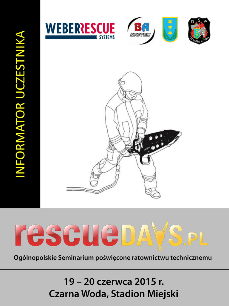 INFORMATOR UCZESTNIKA Informacje o RescueDays.PL 2015 OPIS IMPREZY RESCUE DAYS to prawdopodobnie największe warsztaty szkoleniowe z zakresu ratownictwa technicznego na świecie, zapoczątkowane przez firmę Weber-Hydraulik GmbH kilkanaście lat temu i organizowane corocznie w Niemczech. W ostatnim spotkaniu w Heitersheim/Niemcy gościło 800 uczestników z 20-tu państw. W czerwcu, korzystając ze wsparcia macierzystej firmy już po raz drugi organizujemy polską wersję imprezy - RescueDays.PL 2015. Planujemy udział ok. 100 uczestników, 4 instruktorów z Polski i 6 z Niemiec. Poniżej przedstawiamy informację o tych warsztatach. LOKALIZACJA RescueDays.PL 2015 odbędą się w miejscowości Czarna Woda (pow. Starogard Gdański), która znajduje się przy drodze Krajowej nr 22, w województwie Pomorskim. Miejscowość Czarna Woda, przecinają dwa główne szlaki komunikacyjne, droga krajowa nr 22 oraz trasa kolejowa Tczew - Chojnice. Odległości drogowe z Czarnej Wody: •do Gdańska - 90 km, •do Starogardu Gdańskiego (stolicy regionu) - 36 km, •do Chojnic - 40 km, •do autostrady A1- 50 km przebiegającej w okolicy Swarożyna . ORGANIZATORZY IMPREZY RescueDays.PL organizowane jest przez Weber Rescue Polska przy wsparciu firmy BA System z Gdańska, Burmistrza Czarnej Wody oraz Jednostki OSP Czarna Woda. www.facebook.com/WeberRescuePolska [email protected] Strona 2 OPIS ZAJĘĆ Warsztaty RescueDays.PL mają dwudniowy charakter. Składają się ze wstępu teoretycznego, który obejmuje 2 wykłady. Dalszą cześć seminarium stanowią sesje treningowe, gdzie na 5 zróżnicowanych tematycznie stanowiskach uczestnicy w praktyczny sposób uczestniczą w scenariuszach, pod nadzorem instruktorów. Instruktorzy, którzy prowadzą zajęcia wchodzą w skład międzynarodowej grupy WEBER RESCUE AUSBILDERTEAM. RescueDays.PL będą prowadzone przez Instruktorów z Polski oraz z Niemiec. Zajęcia odbędą się w grupach, które rotacyjnie będą przechodziły przez kolejne stanowiska. Ilość uczestników w jednej grupie nie przekroczy 12 osób. Scenariusze praktyczne zostały zróżnicowane ze względu na tematykę oraz techniki ratownicze, które będą tam stosowane. Zajęcia praktyczne zostaną poprzedzone wykładami wprowadzającymi. Tegoroczna tematyka wykładów to: 1. Nowoczesne konstrukcje pojazdów. 2. Ratownictwo medyczne podczas działań technicznych. W ramach sesji treningowych przewidujemy następujące scenariusze: • Nowoczesne konstrukcje pojazdów – systemy bezpieczeństwa, konstrukcja pojazdów, stosowane materiały, rozpoznanie ich w oparciu o różne źródła informacji. • Uderzenie boczne – metoda „Crossramming”, podczas bocznych zgniotów, przywracanie kształtu pierwotnego. Alternatywne drogi ewakuacji poszkodowanego. • Samochód na kołach, pod drzewem – połączenie elementów unoszenia, stabilizacji i uwalniania poszkodowanego ze zgniecionej konstrukcji pojazdu. • Samochód na dachu, na przeszkodzie – praca na wysokości, stabilizacja pojazdu, różne sposoby wykonywania dostępu do nóg poszkodowanego. Rozginanie i unoszenie konstrukcji zgniecionego samochodu. • Człowiek pod kołem – praca w oparciu o pneumatyczne zestawy ratownicze, podczas uwalniania poszkodowanego, znajdującego się pod kołem naczepy niskopodwoziowej. www.facebook.com/WeberRescuePolska [email protected] Strona 3 TEMATY ORGANIZACYJNE 1. Termin imprezy to: 19-20 (pt-sb) czerwca 2015 r. w miejscowości Czarna Woda (pow. Starogard Gdański). 2. Cena: koszt uczestnictwa to 590 zł. Wystawiamy faktury VAT, w razie potrzeby wystawiamy faktury pro-forma. Oryginał faktury uczestnik odbierze na miejscu imprezy. 3. Posiłki w ramach uczestnictwa: obiad w piątek, biesiada (kolacja) w piątek, obiad w sobotę. 4. Zakwaterowanie: Uczestnikom rekomendujemy nocleg w Hotelu WROTA KASZUB http://wrotakaszub.pl (24 km od imprezy). Podczas rezerwacji noclegu, podając hasło RESCUE DAYS koszt noclegu (z piątku na sobotę) w pokoju 2 osobowym, wyniesie 40 zł - dla jednego uczestnika. W cenie noclegu znajduję się również śniadanie. 5. Dla uczestników korzystających z tego hotelu, organizujemy dojazd autobusem na piątkową biesiadę wieczorną podczas, której przewidujemy koncert oraz powrót z imprezy (wyjazd o godz. 19.00 powrót około 23.00). 6. Uczestnictwo – zgłoszenia uczestnictwa można dokonać przez formularz kontaktowy http://www.rescue-days.pl/index.php/kontakt lub pod adresem [email protected] 7. Uczestnik warsztatów otrzymuje certyfikat uczestnictwa oraz pamiątkowe gadżety. 8. Zapisy prowadzone są do 1 czerwca 2015 r. Ilość miejsc w warsztatach jest ograniczona o uczestnictwie decyduje kolejność zgłoszeń. Każdy uczestnik RESCUE DAYS zobowiązany jest posiadać: Ubranie specjalne (kompletne), hełm lub kask, osłonę oczu, buty specjalne, rękawice ochronne, latarkę, nóż. www.facebook.com/WeberRescuePolska [email protected] Strona 4 Godz. 08.00 - 09.00 09.00 – 09.30 09.30 – 10.15 10.30 – 11.45 11.45 – 12.45 12.45 – 13.00 13.00 - 14.30 15.00 – 16.30 17.00 19.30 Godz. 09.00 – 10.30 11.00 - 12.30 13.30 - 15.00 15.15 - 15.45 PIĄTEK temat Rejestracja uczestników Rozpoczęcie RESCUE DAYS Wykład wprowadzający 1 Wykład wprowadzający 2 Obiad Wprowadzenie do zajęć SESJA TRENINGOWA Przerwa 30 min SESJA TRENINGOWA Rozjazd do hoteli Biesiada i koncert SOBOTA temat SESJA TRENINGOWA Przerwa 30 min SESJA TRENINGOWA Obiad SESJA TRENINGOWA Zakończenie www.facebook.com/WeberRescuePolska [email protected] Lokalizacja Stadion – biuro imprezy Szkoła - sala gimnastyczna Szkoła - sala gimnastyczna Szkoła - sala gimnastyczna Namiot – stadion Na stanowiskach Stadion Stadion Namiot – stadion lokalizacja Stadion Stadion Namiot – stadion Stadion Stadion Strona 5