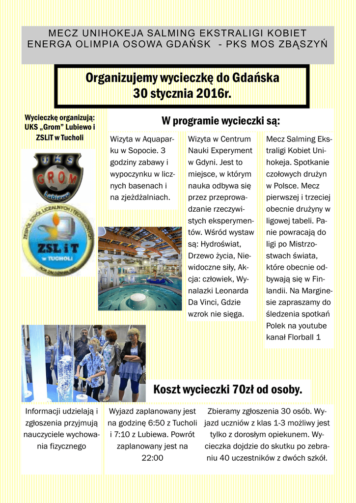 MECZ UNIHOKEJA SALMI NG EKSTRALIGI KOBIET ENERGA OLIMPIA OSOWA GDAŃSK - PKS MOS ZBĄSZYŃ Organizujemy wycieczkę do Gdańska 30 stycznia 2016r. Wycieczkę organizują: UKS „Grom” Lubiewo i ZSLiT w Tucholi W programie wycieczki są: Wizyta w Aquaparku w Sopocie. 3 godziny zabawy i wypoczynku w licznych basenach i na zjeżdżalniach. Wizyta w Centrum Nauki Experyment w Gdyni. Jest to miejsce, w którym nauka odbywa się przez przeprowadzanie rzeczywistych eksperymentów. Wśród wystaw są: Hydroświat, Drzewo życia, Niewidoczne siły, Akcja: człowiek, Wynalazki Leonarda Da Vinci, Gdzie wzrok nie sięga. Mecz Salming Ekstraligi Kobiet Unihokeja. Spotkanie czołowych drużyn w Polsce. Mecz pierwszej i trzeciej obecnie drużyny w ligowej tabeli. Panie powracają do ligi po Mistrzostwach świata, które obecnie odbywają się w Finlandii. Na Marginesie zapraszamy do śledzenia spotkań Polek na youtube kanał Florball 1 Koszt wycieczki 70zł od osoby. Informacji udzielają i Wyjazd zaplanowany jest Zbieramy zgłoszenia 30 osób. Wyzgłoszenia przyjmują na godzinę 6:50 z Tucholi jazd uczniów z klas 1-3 możliwy jest nauczyciele wychowa- i 7:10 z Lubiewa. Powrót tylko z dorosłym opiekunem. Wynia fizycznego zaplanowany jest na cieczka dojdzie do skutku po zebra22:00 niu 40 uczestników z dwóch szkół.