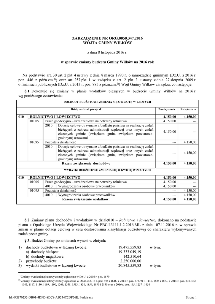 ZARZĄDZENIE NR ORG.0050.347.2016 WÓJTA GMINY WILKÓW z dnia 8 listopada 2016 r. w sprawie zmiany budżetu Gminy Wilków na 2016 rok Na podstawie art. 30 ust. 2 pkt 4 ustawy z dnia 8 marca 1990 r. o samorządzie gminnym (Dz.U. z 2016 r. poz. 446 z późn.zm.1)) oraz art. 257 pkt 1 w związku z art. 2 pkt 2 ustawy z dnia 27 sierpnia 2009 r. o finansach publicznych (Dz.U. z 2013 r. poz. 885 z późn.zm.2)) Wójt Gminy Wilków zarządza, co następuje: § 1. Dokonuje się zmiany w planie wydatków bieżących w budżecie Gminy Wilków na 2016 r. wg poniższego zestawienia: DOCHODY BUDŻETOWE ZMIENIA SIĘ O KWOTĘ W ZŁOTYCH Dział, rozdział, paragraf Zmniejszenia ROLNICTWO I ŁOWIECTWO Prace geodezyjno – urządzeniowe na potrzeby rolnictwa 01005 2010 Dotacje celowe otrzymane z budżetu państwa na realizację zadań bieżących z zakresu administracji rządowej oraz innych zadań zleconych gminie (związkom gmin, związkom powiatowogminnym) ustawami Pozostała działalność 01095 2010 Dotacje celowe otrzymane z budżetu państwa na realizację zadań bieżących z zakresu administracji rządowej oraz innych zadań zleconych gminie (związkom gmin, związkom powiatowogminnym) ustawami Razem zwiększenie dochodów: 010 Zwiększenia 4.150,00 4.150,00 4.150,00 --- 4.150,00 --- --- 4.150,00 --- 4.150,00 4.150,00 4.150,00 4.150,00 4.150,00 4.150,00 ----4.150,00 4.150,00 ----4.150,00 4.150,00 4.150,00 WYDATKI BUDŻETOWE ZMIENIA SIĘ O KWOTĘ W ZŁOTYCH ROLNICTWO I ŁOWIECTWO 01005 Prace geodezyjno – urządzeniowe na potrzeby rolnictwa 4010 Wynagrodzenia osobowe pracowników Pozostała działalność 01095 4010 Wynagrodzenia osobowe pracowników Razem zwiększenie wydatków: 010 § 2. Zmiany planu dochodów i wydatków w dziale010 – Rolnictwo i łowiectwo, dokonano na podstawie pisma z Opolskiego Urzędu Wojewódzkiego Nr FBC.I.3111.1.2.2016.ML z dnia 07.11.2016 r. w sprawie zmian w planie dotacji celowej w celu dostosowania klasyfikacji budżetowej do charakteru wykonywanych zadań przez gminy. § 3. Budżet Gminy po zmianach wynosi w złotych: 1) 2) 3) dochody budżetowe w łącznej kwocie: a) dochody bieżące: b) dochody majątkowe: przychody budżetu: wydatki budżetowe w łącznej kwocie: 19.475.559,83 19.333.049,19 142.510,64 2.250.000,00 20.845.559,83 w tym: w tym: 1) Zmiany wymienionej ustawy zostały ogłoszone w Dz.U. z 2016 r. poz. 1579 wymienionej ustawy zostały ogłoszone w Dz.U. z 2013 r. poz. 938 i 1646, z 2014 r. poz. 379, 911, 1146, 1626 i 1877, z 2015 r. poz. 238, 532, 1045, 1117, 1130, 1189, 1190, 1269, 1358, 1513, 1830, 1854, 1890 i 2150 oraz z 2016 r. poz. 195, 1257 i 1454 2) Zmiany Id: 0CB70235-DB01-4DFD-8DC8-AB234C2DF56E. Podpisany Strona 1 4) a) wydatki bieżące: b) wydatki majątkowe: rozchody budżetu: 18.785.470,19 2.060.089,64 880.000,00 § 4. Zarządzenie wchodzi w życie z dniem wydania. Wójt Gminy Wilków mgr Bogdan Zdyb Id: 0CB70235-DB01-4DFD-8DC8-AB234C2DF56E. Podpisany Strona 2