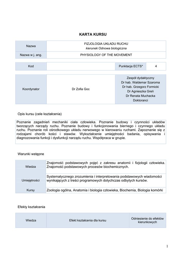KARTA KURSU Nazwa FIZJOLOGIA UKŁADU RUCHU kierunek Odnowa biologiczna Nazwa w j. ang. PHYSIOLOGY OF THE MOVEMENT Kod Punktacja ECTS* Koordynator Dr Zofia Goc 4 Zespół dydaktyczny Dr hab. Waldemar Szaroma Dr hab. Grzegorz Formicki Dr Agnieszka Greń Dr Renata Muchacka Doktoranci Opis kursu (cele kształcenia) Poznanie zagadnień mechaniki ciała człowieka. Poznanie budowy i czynności układów tworzących narządy ruchu. Poznanie budowy i funkcjonowania biernego i czynnego układu ruchu. Poznanie roli ośrodkowego układu nerwowego w kierowaniu ruchami. Zapoznanie się z rodzajami chorób kości i stawów. Wykształcenie umiejętności badania, opisywania i diagnozowania funkcji i dysfunkcji narządu ruchu. Współpraca w grupie. Warunki wstępne Wiedza Znajomość podstawowych pojęć z zakresu anatomii i fizjologii człowieka. Znajomość podstawowych procesów biochemicznych. Umiejętności Systematycznego zrozumienia i interpretowania podstawowych wiadomości wynikających z treści programowych dotychczas odbytych kursów. Kursy Zoologia ogólna, Anatomia i biologia człowieka, Biochemia, Biologia komórki Efekty kształcenia Wiedza Efekt kształcenia dla kursu Odniesienie do efektów kierunkowych 1 W01 Posiada szczegółowa wiedzę z zakresu budowy i funkcjonowania aparatu ruchu człowieka. W02 Zna strukturę mięśni szkieletowych poprzecznie prążkowanych i mięśnia gładkiego serca W03 Zna molekularne podstawy skurczu mięśniowego W04 Zna teorie ślizgową skurczu mięśniowego W05 Charakteryzuje mechanikę skurczu mięśniowego W06 Opisuje metabolizm energetyczny mięśni W07 Wymienia typy mięśni szkieletowych W08 Opisuje budowę i rodzaje mięśni gładkich W09 Opisuje własności elektryczne komórek mięśnia sercowego W10 Zna budowę i funkcje układu piramidowego i pozapiramidowego W11 Charakteryzuje rodzaje i funkcje prioprioreceptorów W12 Zna sposoby połączeń kości w układzie ruchu człowieka W13 Zna przyczyny i sposoby leczenia chorób kości i stawów Efekt kształcenia dla kursu Umiejętności U01 Wykonuje i opisuje schematyczne rysunki na podstawi przeprowadzonych obserwacji mikroskopowych U02 Wykonuje oznaczenia poziomu glukozy U03 Mierzy ciśnienie krwi. U04 Samodzielnie pogłębia wiedzę z zakresu fizjologii ruchy U05 Posiada umiejętność interpretowania wyników U06 Uczy się samodzielnie wyznaczonych zagadnień U07 Wykazuje krytyczne podejście do informacji z zakresu fizjologii ruchu dostępnych w Internecie Efekt kształcenia dla kursu Kompetencje społeczne K01 rozumie konieczność uczenia się ustawicznego K02 jest odpowiedzialny za powierzany sprzęt i własną pracę oraz szanuje pracę innych K03 krytycznie podchodzi do informacji upowszechnianych w mediach, szczególnie z zakresu nauk fizjologicznych K04 efektywnie działa indywidualnie według wskazówek oraz wykazuje zdolność do pracy w zespole K05 dąży do stałego aktualizowania wiedzy, doskonalenia warsztatu pracy K06 jest odpowiedzialny za bezpieczeństwo pracy własnej i innych K07 rozumie potrzebę prowadzenia aktywnego trybu życia i stosuje ją w życiu codziennym przez co staje się wzorem dla otoczenia K_W01, K_W02 K_W02 K_W07 K_W07 K_W07 K_W07 K_W02 K_W02 K_W07 K_W02 K_W02 K_W02 K_W03, K_W08, K_W13 Odniesienie do efektów kierunkowych K_U06 K_U02, K_U06, K_U15 K_U02, KU06, K_U15 K_U11, KU13 K_U14, K_U15 K_U13 K_U13, K_U14 Odniesienie do efektów kierunkowych K_K01 K_K13 K_K04 K_K05, K_K07 K_K04, K_K06 K_K13 K_K02, K_K03, K_K09 2 Organizacja Forma zajęć Liczba godzin Wykład (W) Ćwiczenia w grupach A K L 10 S P E 15 Opis metod prowadzenia zajęć Wykład, prezentacja multimedialna, dyskusja, ćwiczenia praktyczne. W01 W02 W03 W04 W05 W06 W07 W08 W09 W10 W11 W12 W13 U01 U02 U03 U04 U05 U06 U07 K01 K02 K03 K04 K05 K06 X X X X X X X X X X X X X X X X X X X X X X X X X X X X X X X X X X X X X X X X X X X Inne Egzamin pisemny Egzamin ustny Praca pisemna (esej) Referat Udział w dyskusji Projekt grupowy Projekt indywidualny Praca laboratoryjna Zajęcia terenowe Ćwiczenia w szkole Gry dydaktyczne E – learning Formy sprawdzania efektów kształcenia X X X X X X X X X X X X X X X X X X X X X X X X X X 3 X K07 Kryteria oceny X Zaliczenie ćwiczeń na podstawie aktywnego udziału w dyskusjach, przygotowywania przez studentów prezentacji na podany temat oraz wykonywanie w podgrupach zadań praktycznych. Egzamin ustny obejmuje pytania z zakresu programowego ćwiczeń i wykładów. Ocena końcowa egzaminu ustnego uzależniona jest od stopnia opanowania wiadomości i umiejętności studenta. Uwagi Treści merytoryczne (wykaz tematów) Tematyka wykładów 1. System mięśniowo szkieletowy człowieka. 2. Fizjologia mięśni poprzecznie prążkowanych i mięśni gładkich. 3. Składowe układu kontroli ruchu. Rola ośrodkowego układu nerwowego w kierowaniu ruchami. Tematyka ćwiczeń 1. Komórki tkanek układu ruchu. Macierz międzykomórkowa tkanki łącznej i kostnej. 2. Syndesmologia i artrologia. 3. Systematyka chorób kości i stawów cz. I 4. Systematyka chorób kości i stawów cz. II 5. Badanie wpływu wysiłku statycznego na organizm człowieka. Wykaz literatury podstawowej 1. 2. Konturek S.: Fizjologia człowieka. Wyd. UJ, Kraków, 2003. Spodaryk K.: Zarys fizjologii i patofizjologii układu ruchu człowieka - kości i stawy.Wyd. AZ Adam Zborowski, 2004. Wykaz literatury uzupełniającej 1. Bober T., Zawadzki J.: Biomechanika układu ruchu człowieka. Wyd. BK, Wrocław, 2001. Bilans godzinowy zgodny z CNPS (Całkowity Nakład Pracy Studenta) Ilość godzin w kontakcie z prowadzącymi Wykład 10 Konwersatorium (ćwiczenia, laboratorium itd.) 15 Pozostałe godziny kontaktu studenta z prowadzącym 5 4 Ilość godzin pracy studenta bez kontaktu z prowadzącymi Lektura w ramach przygotowania do zajęć 15 Przygotowanie krótkiej pracy pisemnej lub referatu po zapoznaniu się z niezbędną literaturą przedmiotu 10 Przygotowanie do sprawdzianów na zaliczenie ćwiczeń Przygot