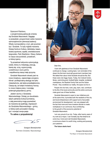Szanowni Państwo, z przyjemnością patrzę jak zmienia się Grodzisk Mazowiecki. Sięgając w przeszłość, przypominam sobie marzenia samorządowców pierwszej kadencji. Wtedy rozmawialiśmy o tym, jaki powinien być Grodzisk. To były mgliste marzenia. Dzisiaj Centrum Kultury, biblioteka, basen, boiska sportowe, szpital, zrewitalizowane targowisko, Park Skarbków i Stawy Goliana to nasza rzeczywistość, przestrzeń, w której żyjemy. Tę przestrzeń aktywnie wykorzystują ludzie, którzy tu mieszkają, pracują, bawią się, uczą, wypoczywają, uczestniczą w życiu gminy i współtworzą naszą małą ojczyznę. Grodzisk Mazowiecki otwarty jest na nowe inicjatywy, zapewniając przyjazny klimat i profesjonalną obsługę nie tylko mieszkańców, ale także przedsiębiorców. Cieszę się, że kolejni inwestorzy tworzą tu nowe miejsca pracy i rozwijają potencjał gospodarczy gminy. Jestem dumny z Grodziska Mazowieckiego. Dzisiaj, po dwudziestu latach pełnienia funkcji burmistrza, z całą pewnością mogę powiedzieć, że marzenia się spełniają. Zapraszam do Grodziska Mazowieckiego – gminy, w której warto prowadzić interesy, żyć i rozwijać swoje pasje. To adres z przyszłością! Grzegorz Benedykciński Burmistrz Grodziska Mazowieckiego Dear Sirs, I look with gladness at how Grodzisk Mazowiecki continues to change. Looking back, I am reminded of the dream the first-term local self-government members had. We talked then about what Grodzisk should be like. But these were only foggy hopes. Today, the Cultural Center, library, swimming pool, football fields, hospital, revitalized marketplace, the Skarbek Family Park and the Golian Ponds – they constitute our reality, the space we live in. People who live here, work, play, learn, rest, contribute to the life of the local community and the entire commune make good use of these facilities. Grodzisk Mazowiecki is open to new initiatives and, at the same time, it provides both the residents of the city and local entrepreneurs with support and a favourable environment for development. I am very pleased with the fact that more and more investors decide to create workplaces in our commune, thus contributing to the growth of the economic potential of Grodzisk Mazowiecki. I am very proud of our city. Today, after twenty years of my work as a mayor, I can honestly say that dreams do come true. Come and visit Grodzisk Mazowiecki, a commune where it is worth living, working and pursuing your passions. The future starts here! Grzegorz Benedykciński The Mayor of Grodzisk Mazowiecki I Początki Grodziska Origins of the city Dzieje grodu, osady, a potem miasta Grodziska sięgają początków państwa polskiego. Wtedy to na mazowieckiej równinie, pośród pokrytej bagnami puszczy, nad rzeką Mrowną pojawiło się grodzisko. Gród obronny, umocniony ziemnym wałem i palisadą, otoczony fosą i strzeżony przez drużynę wojów dawał schronienie okolicznym mieszkańcom, stanowiąc zarazem ośrodek władzy administracyjnej. Na przełomie XIII i XIV wieku w pobliżu dawnej warowni powstała osada targowa, położona przy lokalnym szlaku handlowym, należąca do rodu Grodziskich herbu Ostoja. Około roku 1355 Tomasz Grodziski ufundował we wsi pierwszy drewniany kościół, a w połowie wieku XV utworzona została parafia grodziska. Dzięki staraniom kolejnych właścicieli, Okuniów herbu Belina, wieś Grodzisko otrzymała prawa miejskie, nadane przez króla Zygmunta Starego 22 lipca 1522 roku. The history of the settlement and the city of Grodzisk date back to the beginning of the Polish state. This is when, amidst the marshes of the Mrowna River, a settlement was established on the old plain. The defensive settlement fortified with a mound and a palisade, surrounded by a ditch and guarded by knights provided shelter to the local community and served as the headquarters of the local authorities. On the turn of the 13th and 14th centuries, a market settlement was established by the Grodziski family, Ostoja coat of arms, near the old stronghold along the local trade route. Around 1355 Tomasz Grodziski founded the first wooden church in the village, and in the 15th century the Grodzisk parish was established. Owing to the untiring efforts of the successive owners of the property, the Okuń family, Belina coat of arms, the village of Grodzisko was granted the city charter by King Sigismund I of Poland on 22 July 1522. Początki Grodziska Starożytni hutnicy i strażnicy bursztynowego szlaku Szlak Naczynie gliniane kultura przeworska (II – III w. n.e.) Pottery vessel, Przeworsk culture (2nd-3rd century AD) Ziemia grodziska na początku naszej ery zamieszkiwana była przez plemiona barbarzyńskie, utożsamiane z Wandalami, prowadzące masową produkcję żelaza wytapianego w piecach dymarskich oraz kontrolujące szlak handlowy zwany bursztynowym. O wielowiekowej obecności barbarzyńców na tych terenach świadczą do dziś odkrywane ślady osad hutniczych, a także pozostałości warsztatów bursztyniarskich odnalezione w rejonie wsi Izdebno Kościelne i Tłuste. Ancient smelting masters and guardians of the Amber Road Rdzeń bursztynowy kultura przeworska (II – III w. n. e.) Naszyjnik koronowaty brąz, kultura jastorfska (II w. p.n.e.) Bronze crown-shaped necklace, Jastorf culture (2nd century BC) Zabytkowa drewniana willa z początku XX wieku położona przy ul. 3 Maja. A historic wooden villa dating back to early 20th century, located at 3 Maja Street. Amber core, Przeworsk culture (2nd-3rd century AD) In the beginning of the Common Era, the Grodzisk area was inhabited by barbarians, most probably Vandals, who engaged in iron production by smelting iron ore in bloomeries and controlled the trade route known as the Amber Road. The presence of barbarians within this area has been proven by numerous discoveries of remains of ancient settlements with furnaces for smelting iron and amber workshops in the area of Izdebno Kościelne and Tł