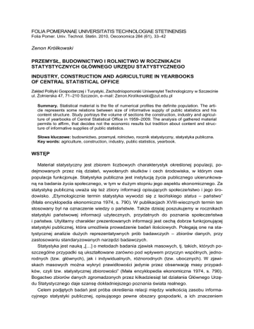 FOLIA POMERANAE UNIVERSITATIS TECHNOLOGIAE STETINENSIS Folia Pomer. Univ. Technol. Stetin. 2010, Oeconomica 284 (61), 33–42 Zenon Królikowski PRZEMYSŁ, BUDOWNICTWO I ROLNICTWO W ROCZNIKACH STATYSTYCZNYCH GŁÓWNEGO URZĘDU STATYSTYCZNEGO INDUSTRY, CONSTRUCTION AND AGRICULTURE IN YEARBOOKS OF CENTRAL STATISTICAL OFFICE Zakład Polityki Gospodarczej i Turystyki, Zachodniopomorski Uniwersytet Technologiczny w Szczecinie ul. Żołnierska 47, 71–210 Szczecin, e–mail: [email protected] Summary. Statistical material is the file of numerical profiles the definite population. The article represents some relations between size of informative supply of public statistics and his content structure. Study portrays the volume of sections the construction, industry and agriculture of yearbooks of Central Statistical Office in 1959–2009. The analysis of gathered material permits to affirm, that decides not the economic results but tradition about content and structure of informative supplies of public statistics. Słowa kluczowe: budownictwo, przemysł, rolnictwo, rocznik statystyczny, statystyka publiczna. Key words: agriculture, construction, industry, public statistics, yearbook. WSTĘP Materiał statystyczny jest zbiorem liczbowych charakterystyk określonej populacji, podejmowanych przez nią działań, wywołanych skutków i cech środowiska, w którym owa populacja funkcjonuje. Statystyka publiczna jest instytucją życia publicznego ukierunkowaną na badania życia społecznego, w tym w dużym stopniu jego aspektu ekonomicznego. Za statystykę publiczną uważa się też zbiory informacji opisujących społeczeństwo i jego środowisko. „Etymologicznie termin statystyka wywodzi się z łacińskiego status – państwo” (Mała encyklopedia ekonomiczna 1974, s. 790). W publikacjach XVIII-wiecznych termin ten stosowany był na oznaczenie wiedzy o państwie. Także dzisiaj poszukujemy w rocznikach statystyki państwowej informacji użytecznych, przydatnych do poznania społeczeństwa i państwa. Utylitarny charakter prezentowanych informacji jest cechą dobrze funkcjonującej statystyki publicznej, która umożliwia prowadzenie badań ilościowych. Polegają one na statystycznej analizie dużych reprezentatywnych prób badawczych – zbiorów danych, przy zastosowaniu standaryzowanych narzędzi badawczych. Statystyka jest nauką „[…] o metodach badania zjawisk masowych, tj. takich, których poszczególne przypadki są ukształtowane zarówno pod wpływem przyczyn wspólnych, jednorodnych (tzw. głównych), jak i indywidualnych, różnorodnych (tzw. ubocznych). W zjawiskach masowych można wykryć prawidłowości jedynie przez obserwację masy przypadków, czyli tzw. statystycznej zbiorowości” (Mała encyklopedia ekonomiczna 1974, s. 790). Bogactwo zbiorów danych zgromadzonych przez kilkadziesiąt lat działania Głównego Urzędu Statystycznego daje szansę dokładniejszego poznania świata realnego. Celem podjętych badań jest próba określenia relacji między wielkością zasobu informacyjnego statystyki publicznej, opisującego pewne obszary gospodarki, a ich znaczeniem 34 Z. Królikowski gospodarczym mierzonym wielkością wytworzonej wartości dodanej. Wybór miar wyznaczających rangę poszczególnych zjawisk w długim okresie podlega znacznym zmianom. W niektórych okresach może to być liczba pracowników, w innych – wielkość produkcji materialnej. Obecnie często powszechnie przyjmujemy produkt krajowy brutto jako miarę rozwoju gospodarczego (mimo wielu zastrzeżeń kwestionujących doskonałość i precyzję owej miary). Analiza, której wyniki prezentujemy, obejmuje kwestię prezentacji rolnictwa, budownictwa i przemysłu w Rocznikach Statystycznych Głównego Urzędu Statystycznego w latach 1959–2009. Objętość działów opisujących budownictwo, przemysł i rolnictwo w odniesieniu do ich znaczenia w gospodarce wydaje się sprawą istotną, podobnie jak podjęcie dyskusji nad zasobem statystyki publicznej, modernizacją zakresu treści oczekiwaną w kontekście zmieniającego się świata – priorytetów rozwojowych, roli czynników wytwórczych, mierników oceny rozwoju i/lub efektywności wykorzystania zasobów produkcyjnych. Poczynione obserwacje wskazują, że niezbędna jest dyskusja nad strukturą gromadzonych informacji statystycznych, a następnie wprowadzenie zmian w rocznikach. CECHY ZASOBÓW INFORMACYJNYCH STATYSTYKI PUBLICZNEJ Faktografia jest opisem zdarzeń jednostkowych (faktów) wykorzystywanych jako przesłanki w rozumowaniach naukowych. Łacińskie słowo „factum” oznacza to, co zaszło lub zachodzi w rzeczywistości; zdarzenie, zjawisko, objaw, czyn; określony stan rzeczy (Słownik wyrazów obcych 1978). Faktografia stanowi także element sprawozdania naukowego, charakteryzującego materiał badawczy. Poznajemy w tym wypadku metody gromadzenia faktów jednostkowych, na których oparto rozumowanie. Faktografia opisuje również zagadnienie reprezentatywności zgromadzonego materiału faktualnego. Efektem procesu przygotowania badania naukowego, a więc planowania poznania, postrzegania, obserwacji, rejestracji oraz opisu faktów, jest etap poznania nazywamy gromadzeniem wiedzy faktualnej. Realizacja tego etapu umożliwia klasyfikację materiału badawczego do źródeł pierwotnych lub wtórnych oraz dyskusję o metodach pozyskiwania materiału badawczego i niektórych aspektach badania naukowego. Podział materiału badawczego (zbioru obserwacji) na materiał pierwotny i wtórny jest zabiegiem porządkującym. Obydwa źródła dostarczają przesłanek, które są elementami rozumowania. Zasadnicza różnica polega na tym, że przesłanki mające swe źródło w materiale wtórnym powinny być poddane dokładniejszej (inaczej przeprowadzanej, specyficznej) weryfikacji pod względem ich prawdziwości, poprawności i, w przypadku materiałów statystyki publicznej, adekwatności do innych wykorzystanych w rozumowaniu przesłanek i sta