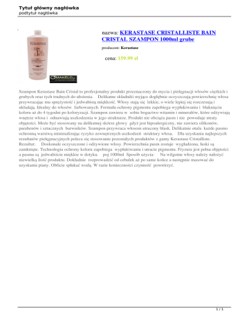 Tytuł główny nagłówka podtytuł nagłówka nazwa: KERASTASE CRISTALLISTE BAIN CRISTAL SZAMPON 1000ml grube producent: Kerastase cena: 159.99 zł Szampon Kerastase Bain Cristal to profesjonalny produkt przeznaczony do mycia i pielęgnacji włosów ciężkich i grubych oraz tych trudnych do ułożenia. Delikatne składniki myjące dogłębnie oczyszczają powierzchnię włosa przywracając mu sprężystość i jedwabistą miękkość. Włosy stają się lekkie, o wiele lepiej się rozczesują i układają. Idealny do włosów farbowanych. Formuła ochrony pigmentu zapobiega wypłukiwaniu i blaknięciu koloru aż do 4 tygodni po koloryzacji. Szampon zawiera w sobie bogactwo witamin i minerałów, które odżywiają wnętrze włosa i odnawiają uszkodzenia w jego strukturze. Produkt nie obciąża pasm i nie powoduje utraty objętości. Może być stosowany na delikatnej skórze głowy gdyż jest hipoalergiczny, nie zawiera silikonów, parabenów i sztucznych barwników. Szampon przywraca włosom utracony blask. Delikatnie otula każde pasmo ochronną warstwą minimalizując ryzyko zewnętrznych uszkodzeń struktury włosa. Dla uzyskania najlepszych rezultatów pielęgnacyjnych poleca się stosowanie pozostałych produktów z gamy Kerastase Cristalliste. Rezultat: Doskonale oczyszczone i odżywione włosy. Powierzchnia pasm zostaje wygładzona, łuski są zamknięte. Technologia ochrony koloru zapobiega wypłukiwaniu i utracie pigmentu. Fryzura jest pełna objętości a pasma są jedwabiście miękkie w dotyku. poj 1000ml Sposób użycia: Na wilgotne włosy należy nałożyć niewielką ilość produktu. Dokładnie rozprowadzić od cebulek aż po same końce a następnie masować do uzyskania piany. Obficie spłukać wodą. W razie konieczności czynność powtórzyć. 1/1