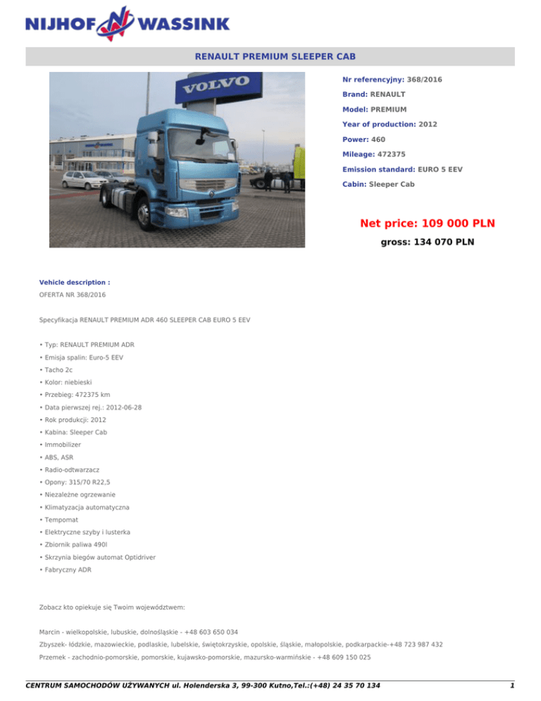 RENAULT PREMIUM SLEEPER CAB Nr referencyjny: 368/2016 Brand: RENAULT Model: PREMIUM Year of production: 2012 Power: 460 Mileage: 472375 Emission standard: EURO 5 EEV Cabin: Sleeper Cab Net price: 109 000 PLN gross: 134 070 PLN Vehicle description : OFERTA NR 368/2016 Specyfikacja RENAULT PREMIUM ADR 460 SLEEPER CAB EURO 5 EEV • Typ: RENAULT PREMIUM ADR • Emisja spalin: Euro-5 EEV • Tacho 2c • Kolor: niebieski • Przebieg: 472375 km • Data pierwszej rej.: 2012-06-28 • Rok produkcji: 2012 • Kabina: Sleeper Cab • Immobilizer • ABS, ASR • Radio-odtwarzacz • Opony: 315/70 R22,5 • Niezależne ogrzewanie • Klimatyzacja automatyczna • Tempomat • Elektryczne szyby i lusterka • Zbiornik paliwa 490l • Skrzynia biegów automat Optidriver • Fabryczny ADR Zobacz kto opiekuje się Twoim województwem: Marcin - wielkopolskie, lubuskie, dolnośląskie - +48 603 650 034 Zbyszek- łódzkie, mazowieckie, podlaskie, lubelskie, świętokrzyskie, opolskie, śląskie, małopolskie, podkarpackie-+48 723 987 432 Przemek - zachodnio-pomorskie, pomorskie, kujawsko-pomorskie, mazursko-warmińskie - +48 609 150 025 CENTRUM SAMOCHODÓW UŻYWANYCH ul. Holenderska 3, 99-300 Kutno,Tel.:(+48) 24 35 70 134 1 ZAPRASZAMY The above data of the vehicle was specified in good faith. However we reserve ourselves the right to make a mistake in the technical specification or in the description of technical condition. Validity of the specification, price and availability of the vehicle has to be confirmed through direct contact with out employee. We invite you. CENTRUM SAMOCHODÓW UŻYWANYCH ul. Holenderska 3 99-300 Kutno Tel.:(+48) 24 35 70 134 Fax.:(+48) 24 35 70 135 CONTACT PERSONS: Zbigniew Lachowicz tel. (+48) 723 987 432 e-mail: [email protected] Marcin Napieralski tel. (+48) 603 650 034 e-mail: [email protected] CENTRUM SAMOCHODÓW UŻYWANYCH ul. Holenderska 3, 99-300 Kutno,Tel.:(+48) 24 35 70 134 2 CENTRUM SAMOCHODÓW UŻYWANYCH ul. Holenderska 3, 99-300 Kutno,Tel.:(+48) 24 35 70 134 3 CENTRUM SAMOCHODÓW UŻYWANYCH ul. Holenderska 3, 99-300 Kutno,Tel.:(+48) 24 35 70 134 4 CENTRUM SAMOCHODÓW UŻYWANYCH ul. Holenderska 3, 99-300 Kutno,Tel.:(+48) 24 35 70 134 5 http://ciezarowki-uzywane.pl/renault-premium-sleeper-cab-c294.html CENTRUM SAMOCHODÓW UŻYWANYCH ul. Holenderska 3, 99-300 Kutno,Tel.:(+48) 24 35 70 134 6