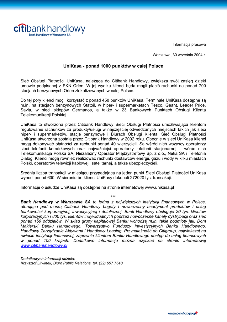 Informacja prasowa Warszawa, 30 września 2004 r. UniKasa - ponad 1000 punktów w całej Polsce Sieć Obsługi Płatności UniKasa, należąca do Citibank Handlowy, zwiększa swój zasięg dzięki umowie podpisanej z PKN Orlen. W jej wyniku klienci będa mogli płacić rachunki na ponad 700 stacjach benzynowych Orlen zlokalizowanych w całej Polsce. Do tej pory klienci mogli korzystać z ponad 450 punktów UniKasa. Terminale UniKasa dostępne są m.in. na stacjach benzynowych Statoil, w hiper- i supermarketach Tesco, Geant, Leader Price, Savia, w sieci sklepów Germanos, a także w 23 Bankowych Punktach Obsługi Klienta Telekomunikacji Polskiej. UniKasa to stworzona przez Citibank Handlowy Sieci Obsługi Płatności umożliwiająca klientom regulowanie rachunków za produkty/usługi w najczęściej odwiedzanych miejscach takich jak sieci hiper- i supermarketów, stacje benzynowe i Biurach Obsługi Klienta. Sieć Obsługi Płatności UniKasa utworzona została przez Citibank Handlowy w 2002 roku. Obecnie w sieci UniKasa klienci mogą dokonywać płatności za rachunki ponad 40 wierzycieli. Są wśród nich wszyscy operatorzy sieci telefonii komórkowych oraz najważniejsi operatorzy telefonii stacjonarnej – wśród nich Telekomunikacja Polska SA, Niezależny Operator Międzystrefowy Sp. z o.o., Netia SA i Telefonia Dialog. Klienci mogą również realizować rachunki dostawców energii, gazu i wody w kilku miastach Polski, operatorów telewizji kablowej i satelitarnej, a także ubezpieczycieli. Średnia liczba transakcji w miesiącu przypadająca na jeden punkt Sieci Obsługi Płatności UniKasa wynosi ponad 600. W sierpniu br. klienci UniKasy dokonali 272020 tys. transakcji. Informacje o usłudze UniKasa są dostępne na stronie internetowej www.unikasa.pl *** Bank Handlowy w Warszawie SA to jedna z największych instytucji finansowych w Polsce, oferująca pod marką Citibank Handlowy bogaty i nowoczesny asortyment produktów i usług bankowości korporacyjnej, inwestycyjnej i detalicznej. Bank Handlowy obsługuje 20 tys. klientów korporacyjnych i 800 tys. klientów indywidualnych poprzez nowoczesne kanały dystrybucji oraz sieć ponad 150 oddziałów. W skład grupy kapitałowej Banku wchodzą m.in. takie podmioty jak: Dom Maklerski Banku Handlowego, Towarzystwo Funduszy Inwestycyjnych Banku Handlowego, Handlowy Zarządzanie Aktywami i Handlowy Leasing. Przynależność do Citigroup, największej na świecie instytucji finansowej, zapewnia klientom Banku Handlowego dostęp do usług finansowych w ponad 100 krajach. Dodatkowe informacje można uzyskać na stronie internetowej www.citibankhandlowy.pl Dodatkowych informacji udziela: Krzysztof Litwinek, Biuro Public Relations, tel. (22) 657 7548