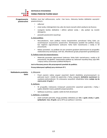 INSTRUKCJA STOSOWANIA FARBA PRZECIW PLEŚNI GALVI Przygotowanie powierzchni Podłoże musi być odtłuszczone, suche i bez kurzu. Zalecamy bardzo dokładnie wyczyścić powierzchnię tj.: • odkurzyć • zmyć wodą z detergentem (np. płyn do mycia naczyń) celem pozbycia się tłuszczu • następnie bardzo dokładnie i obficie spłukać wodą – aby pozbyć się resztek detergentu • pozwolić powierzchni wyschnąć. A. Stare podłoża: • Nieuszkodzone, stare podłoża można bezpośrednio pomalować farbą Galvi, po wcześniejszym oczyszczeniu powierzchni. Skredowane powłoki lub podłoża muszą być najpierw zagruntowane (zalecane: farba Galvi rozcieńczona z wodą w 10 procentach). • Należy sprawdzić, czy podłoże nie jest zarażone grzybami pleśniowymi (w przypadku niedostatecznej wentylacji). Jeśli tak, zlikwidować grzyby preparatem grzybobójczym. B. Podłoża nowe lub niepomalowane: • Materiały porowate zagruntować (zalecane: farba Galvi rozcieńczona z wodą w 10 procentach). Na gładkie, nieporowate podłoża np. betonach wysokiej klasy, typu B45 i więcej należy zastosować podkład Multiprim. Jest to kluczowy proces dla przyczepności powłoki do podłoża. Proszę dokonywać aplikacji przy minimum 8o C. Nakładanie produktu Galvi A. Mieszanie • Przed użyciem należy wsypać zawartość dwóch dodatków przymocowanych na pokrywie (cynk i miedź) do pojemnika z farbą następnie dokładnie wymieszać do uzyskania jednorodności. Po zmieszaniu wszystkich składników farba nadaje się do użycia przez 12 godz.! B. Aplikacja • W przypadku malowania mniejszych powierzchni zawartość pojemnika z farbą i sypkie składniki można podzielić proporcjonalnie. • Aplikacja za pomocą : pędzel, wałek do farb akrylowych C. Aplikacja – 2 warstwa • Jeżeli zachodzi potrzeba, drugą powłokę nakładamy po min. 1 godz. (mat), 2 godz. (półpołysk) max. 24 godz. (przy 20oC) po aplikacji 1 warstwy. 1/2 Po otrzymaniu materiałów należy pozostawić je aż do osiągnięcia temperatury pomieszczenia, w którym będą aplikowane. UWAGA: Powyższe informacje dotyczą aplikacji w +/- 20 oC. Wyższe temperatury skracają, a niższe temperatury wydłużają: czas indukcji, czas na wykorzystanie materiału oraz czas min/max jaki należy odczekać pomiędzy kolejnymi powłokami. Z reguły przy temp. ok. 30oC. czasy ulegają dwukrotnemu skróceniu, natomiast przy temp. ok. 10 oC. czasy ulegają wydłużeniu. Są to wartości przybliżone. Dla szczegółowych informacji proszę odnieść się do karty informacji technicznej. Dodatkowe informacje znajdą Państwo w karcie informacji technicznej. Informacje tu zawarte przekazywane są w dobrej wierze, w celach informacyjnych. Ponieważ warunki aplikacji są poza kontrolą producenta i dystrybutora, firma Noxan Sp. z o.o. nie może ponosić jakiejkolwiek odpowiedzialności lub obciążeń finansowych, które mogą wynikać z niewłaściwego zastosowania tych produktów. Noxan Sp. z o.o. zastrzega sobie prawo modyfikowania danych bez uprzedzenia. Niniejsza instrukcja stosowania zastępuje wszystkie poprzednie wersje. W razie dodatkowych pytań prosimy o kontakt: Dystrybutor: Noxan Sp. z o.o. Tel. +48 61 870 87 03 ul. Pułtuska 13 Fax +48 61 624 32 98 61-052 Poznań www.noxan.pl 2/2