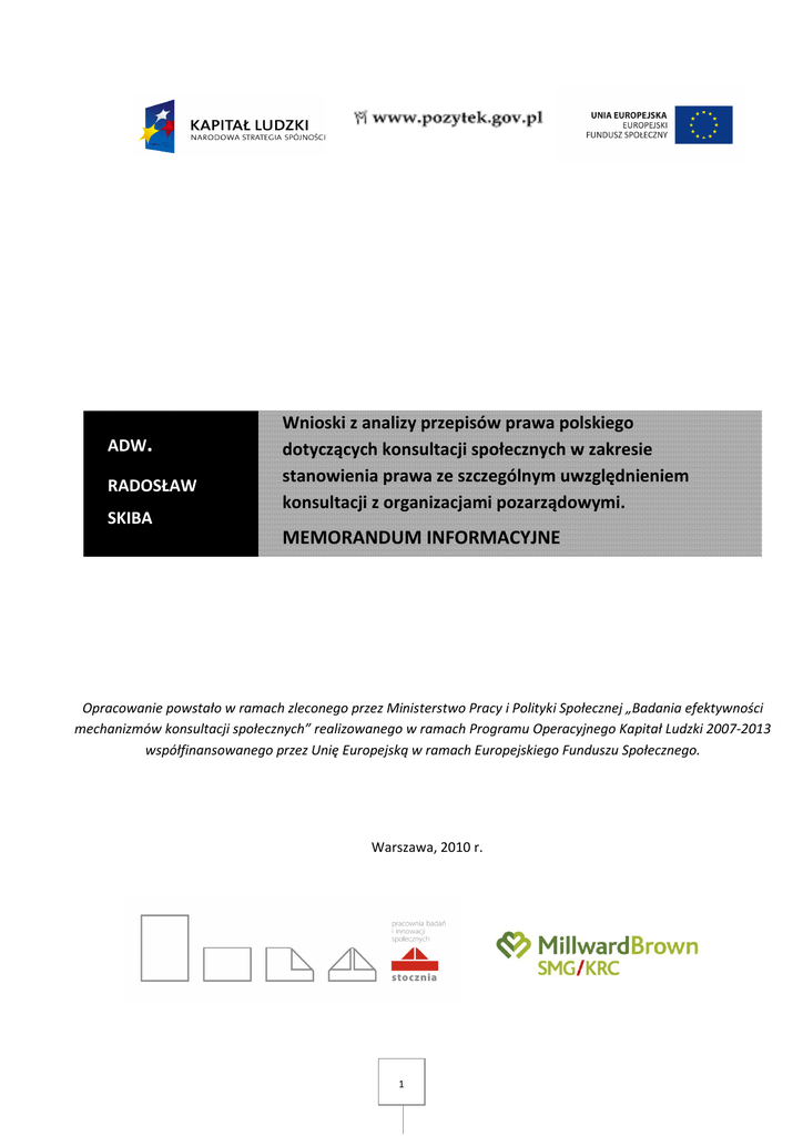 ADW. RADOSŁAW SKIBA Wnioski z analizy przepisów prawa polskiego dotyczących konsultacji społecznych w zakresie stanowienia prawa ze szczególnym uwzględnieniem konsultacji z organizacjami pozarządowymi. MEMORANDUM INFORMACYJNE Opracowanie powstało w ramach zleconego przez Ministerstwo Pracy i Polityki Społecznej „Badania efektywności mechanizmów konsultacji społecznych” realizowanego w ramach Programu Operacyjnego Kapitał Ludzki 2007-2013 współfinansowanego przez Unię Europejską w ramach Europejskiego Funduszu Społecznego. Warszawa, 2010 r. 1 Memorandum informacyjne zostało opracowane na zlecenie Pracowni Badań i Innowacji Społecznych „Stocznia” w celu wykorzystania podczas realizacji projektu „Badanie efektywności mechanizmów konsultacji społecznych”. Memorandum obejmuje analizę przepisów prawa polskiego w zakresie obowiązków i sposobów prowadzenia konsultacji społecznych w procesie stanowienia prawa na poziomie krajowym oraz na poziomie lokalnym. Memorandum koncentruje się na konsultacjach społecznych, prowadzonych z udziałem organizacji pozarządowych, jednakże w wielu miejscach obejmuje także konsultacje z mieszkańcami i społecznościami lokalnymi. Ponadto w memorandum uwzględniono konsultacje prowadzone za pośrednictwem specjalnie tworzonych komisji, rad, komitetów, itp. tworzonych z udziałem obywateli, samorządu zawodowego, związków zawodowych lub organizacji pozarządowych. Memorandum zostało podzielone na dwie zasadnicze części: przegląd przepisów prawa pod kątem konsultacji społecznych oraz opis obowiązujących procedur konsultacyjnych, a następnie komentarz oraz wnioski z przeprowadzonej analizy. 2 SPIS TREŚCI I. Podstawowe pojęcia ............................................................................................................................................. 5 Akt prawny ...................................................................................................................................................... 5 Organizacja pozarządowa ................................................................................................................................ 6 II. Akty prawne na szczeblu krajowym .................................................................................................................... 9 Konstytucja RP ................................................................................................................................................. 9 Ustawa z dnia 24 kwietnia 2003 r. o działalności pożytku publicznego i o wolontariacie ............................. 11 Ustawa z dnia 4 września 1997 r. o działach administracji rządowej ............................................................ 12 Ustawa z dnia 8 sierpnia 1996 r. o Radzie Ministrów .................................................................................... 13 Uchwała nr 49 Rady Ministrów z dnia 19 marca 2002 r. Regulamin pracy Rady Ministrów ......................... 15 Wytyczne do oceny skutków regulacji........................................................................................................... 16 Regulamin Sejmu RP ...................................................................................................................................... 18 Regulamin Senatu RP..................................................................................................................................... 20 Ustawa z dnia 7 lipca 2005 r. o działalności lobbingowej w procesie stanowienia prawa ............................ 21 Konwencja z Aarhus....................................................................................................................................... 22 Ustawia z dnia 27 kwietnia 2001r. Prawo Ochrony Środowiska (Dz. U. 2001r. Nr 62 poz. 627 z późn. zm) . 24 Akty prawne dotyczące praw pracowniczych ................................................................................................ 25 Rozporządzenie określające sposób i warunki wykorzystania ogólnej kwoty połowowej ............................ 26 III. Konsultacje instytucjonalne – prowadzone za pośrednictwem specjalnie tworzonych ciał doradczych ......... 27 Komisja Wspólna Rządu i Samorządu Terytorialnego ................................................................................... 27 Trójstronna Komisja do Spraw Społeczno-Gospodarczych i wojewódzkie komisje dialogu społecznego. .... 27 Rada Działalności Pożytku Publicznego ......................................................................................................... 28 Wojewódzkie Rady Działalności Pożytku Publicznego................................................................................... 29 Powiatowe i Gminne Rady Działalności Pożytku Publicznego ....................................................................... 30 Rada Pomocy Społecznej ............................................................................................................................... 31 Krajowa Rada Konsultacyjna do Spraw Osób Niepełnosprawnych ............................................................... 32 Wojewódzkie społeczne rady do spraw osób niepełnosprawnych ............................................................... 33 Powiatowe społeczne rady do spraw osób niepełnosprawnych ................................................................... 33 Krajowa Rada Oświatowa i wojewódzkie rady oświatowe ............................................................................ 34 3 Rada do spraw Szkolnictwa Artystycznego będącą ....................................................................................... 35 Naczelna Rada Zatrudnienia oraz wojewódzkie i powiatowe rady zatrudnienia. ......................................... 36 Komisja Wspólna Rządu i Mniejszości Narodowych i Etnicznych ...............................................................