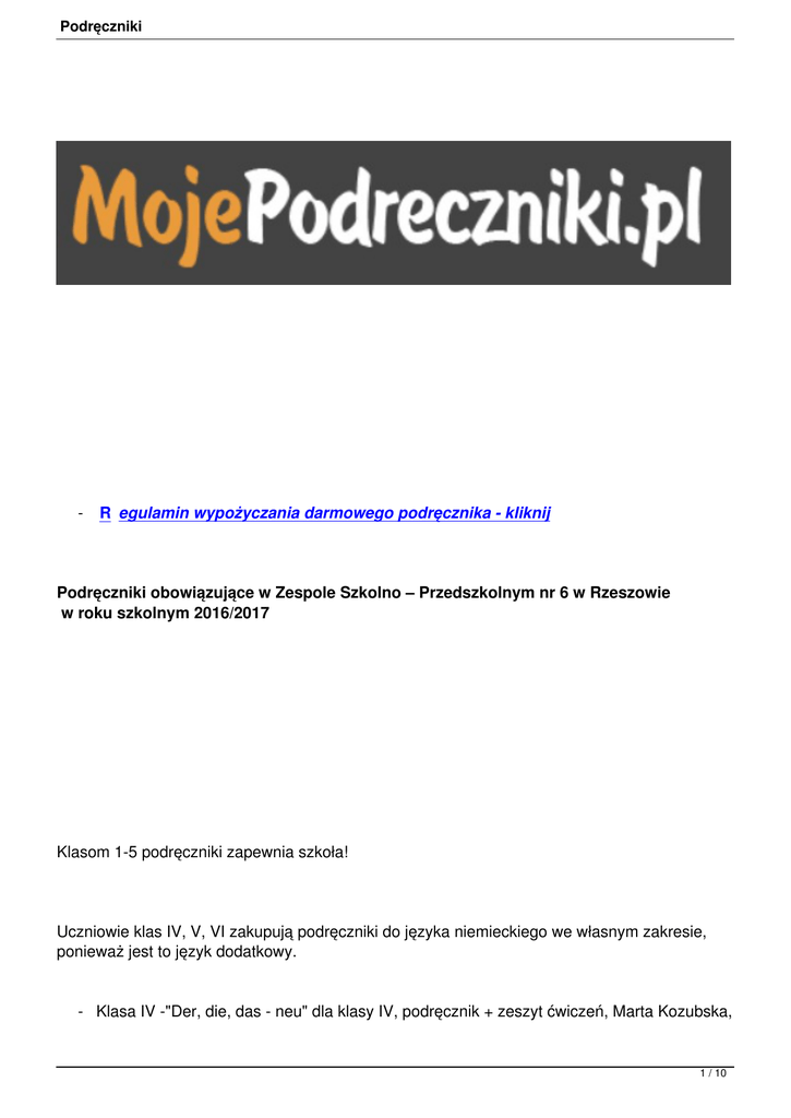 Podręczniki - R egulamin wypożyczania darmowego podręcznika - kliknij Podręczniki obowiązujące w Zespole Szkolno – Przedszkolnym nr 6 w Rzeszowie w roku szkolnym 2016/2017 Klasom 1-5 podręczniki zapewnia szkoła! Uczniowie klas IV, V, VI zakupują podręczniki do języka niemieckiego we własnym zakresie, ponieważ jest to język dodatkowy. - Klasa IV -"Der, die, das - neu" dla klasy IV, podręcznik + zeszyt ćwiczeń, Marta Kozubska, 1 / 10 Podręczniki Ewa Krawczyk, Lucyna Zastąpiło - Klasa V - I semestr kontynuacja podręcznika i ćwiczeń z klasy IV, II semestr "Der, die, das - neu" dla klasy V, podręcznik + zeszyt ćwiczeń, Marta Kozubska, Ewa Krawczyk, Lucyna Zastąpiło - Klasa VI - I semestr kontynuacja podręcznika i ćwiczeń z klasy V, II semestr "Der, die, das - neu" dla klasy VI, podręcznik + zeszyt ćwiczeń, Marta Kozubska, Ewa Krawczyk, Lucyna Zastąpiło Podręczniki obowiązujące w roku szkolnym 2016/2017 w klasach VI Lp. Przedmiot 2 / 10 Podręczniki Tytuł Autor Wydawnictwo 1. Język polski „Między nami” Język polski 6 Podręcznik „Między nami” Język polski 6 Zeszyt ćwiczeń Cz. 1 „Między nami” Język polski 6 Zeszyt ćwiczeń Cz. 2 Agnieszka Łuczak, Anna Murdzek Gdańskie Wyd. Oświat. 2. 3 / 10 Podręczniki Historia „My i historia. Historia i społeczeństwo” Klasa 6 podręcznik + zeszyt ćwiczeń Bogumiła Olszewska Wiesława Surdyk- Fertsch Wydawnictwo Szkolne PWN 3. Przyroda „Tajemnice przyrody” podręcznik z ćwiczeniami cz. I i II Joanna Stawarz, Feliks Szlajfer, Hanna Kowalczyk, Nowa Era 4 / 10 Podręczniki 4. Przyroda Atlas „Przyroda. Świat wokół nas” Nowa Era 5. Matematyka „Matematyka wokół nas” podręcznik + ćwiczenia Klasa VIa, VIc, VId, VIe H. Lewicka, M. Kowalczyk 5 / 10 Podręczniki WSiP 6. Matematyka „Matematyka z kluczem” podręcznik + ćwiczenia Klasa VIb Marcin Braun, Agnieszka Mańkowska, Małgorzata Paszyńska Nowa Era 6. Język angielski „Discover English 3” podręcznik + ćwiczenia 6 / 10 Podręczniki Jayne Wildman Pearson Central Europe 7. Plastyka „Plastyka. Lubię tworzyć kl. 6” podręcznik Marzena Kwiecień, Wojciech Sygut MAC Edukacja 8. Muzyka 7 / 10 Podręczniki „Muzyczny świat” zeszyt ćwiczeń Teresa Wójcik MAC Edukacja 9. Zajęcia techniczne Bez podręcznika 10. Zajęcia komputerowe Kontynuacja podręcznika 4-6 11. Religia 8 / 10 Podręczniki „Tajemnice bogatego życia” (podręcznik + zeszyt ćwiczeń) K. Mielnicki E. Kondrak E. Parszewska JEDNOŚĆ Kielce Zgodnie z obowiązującą Ustawą o systemie oświaty podręczniki do nauczania religii nie są refundowane przez MEN, chyba, że decyzję o ich sfinansowaniu podejmie organ prowadzący szkołę podstawową. Dlatego uczniowie wszystkich klas szkoły podstawowej uczęszczający na lekcje religii zakupują podręczniki i zeszyty ćwiczeń we własnym zakresie. Obowiązujące podręczniki i zeszyty ćwiczeń są następujące: Wydawnictwo JEDNOŚĆ Klasy I -III szkoły podstawowej 9 / 10 Podręczniki - Kl. I szkoły podstawowej nr AZ-11-01/12-KI-1/12: Żyjemy w Bożym świecie Kl. II szkoły podstawowej nr AZ-12-01/12-KI-3/12: Idziemy do Jezusa Kl. III szkoły podstawowej nr AZ-13-01/12-KI-4/13: Jezus jest z nami kl III SP zeszyt ćwiczeń Jezus jest z nami Klasy IV - VI szkoły podstawowej - Kl. IV szkoły podstawowej nr AZ-21-02/12-KI-1/12: Miejsca pełne BOGActw - kl. IV SP zeszyt ćwiczeń Miejsca pełne BOGActw - Kl. V szkoły podstawowej nr AZ-22-02/12-KI-1/13: Spotkania uBOGAcające - kl. V SP zeszyt ćwiczeń Spotkania uBOGAcające - Kl. VI szkoły podstawowej nr AZ-23-02/12-KI-3/14: Tajemnice BOGAtego życia - kl. VI SP zeszyt ćwiczeń Tajemnice BOGAtego życia 10 / 10