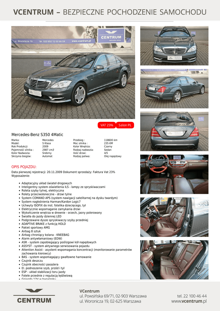 Mercedes-Benz S350 4Matic Marka: Model: Rok Produkcji: Pojemność silnika : Kolor Nadwozia: Skrzynia biegów: Mercedes S Klasa 2009 2987 cm3 Srebrny Automat Przebieg : Moc silnika : Kolor Wnętrza: Rodzaj nadwozia: Ilość drzwi: Rodzaj paliwa: 118600 km 235 KM Czarny Sedan 4/5 Olej napędowy OPIS POJAZDU: Data pierwszej rejestracji: 20.11.2009 Dokument sprzedaży: Faktura Vat 23% Wyposażenie: Adaptacyjny układ świateł drogowych Inteligentny system oświetlenia ILS - lampy ze spryskiwaczami Roleta szyby tylnej, elektryczna Rolety przeciwsłoneczne - drzwi tylne System COMAND APS (system nawigacji satelitarnej na dysku twardym) System nagłośnienia Harman/Kardon Logic7 Uchwyty ISOFIX do inst. fotelika dziecięcego, tył Elektrycznie wspomaganie zamykania drzwi Wykończenie wnętrza w drewnie - orzech, jasny polerowany Światła do jazdy dziennej LED Podgrzewane dysze spryskiwaczy szyby przedniej ADAPTIVE BRAKE z funkcją HOLD Pakiet sportowy AMG Airbag 8 sztuk Airbag chroniący kolana - KNEEBAG Alarm antywłamaniowy (EDW) ASR - system zapobiegający poślizgowi kół napędowych ASSYST - system aktywnego serwisowania pojazdu Attention Assist - asystent wspomagania koncentracji (monitorowanie parametrów zachowania kierowcy) BAS - system wspomagający gwałtowne hamowanie Czujnik deszczu Czujnik obecności pasażera El. podnoszenie szyb, przód i tył ESP - układ stabilizacji toru jazdy Fotele przednie z regulacją lędźwiową Gniazdo 12V w bagażniku Immobiliser Interfejs Bluetooth Kierownica wielofunkcyjna Kierownica z manetkami zmiany biegów DIRECT SELECT Klimatyzacja komfortowa – THERMOTRONIC Lampki do czytania - przód/tył Lampy Bi-ksenonowe ze spryskiwaczami Listwy boczne w kolorze nadwozia Lusterka prawe i lewe ustawiane elektrycznie i podgrzewane Ogrzewane dysze spryskiwaczy szyby przedniej Pasy bezpieczeństwa z automatyczną regulacją, tył Pasy bezpieczeństwa z regulacją wysokości, przód Schowek na okulary Sygnalizacja spadku ciśnienia w oponach System PRE-SAFE Aktywny tempomat z regulowanym ogranicznikiem prędkości Speedtronic Tirefit - zestaw do naprawy przebitej opony Tylny podłokietnik ze schowkiem Zabezpieczenie przed otwarciem drzwi przez dzieci Zabezpieczenie wnętrza pojazdu Zagłówki z tyłu składane i podnoszone elektrycznie Zawieszenie Airmatic Zderzaki w kolorze nadwozia Szyberdach Kamera ułatwiająca parkowanie - tył Kierownica w drewnie i skórze Lusterko boczne kierowcy oraz wsteczne automatycznie przyciemniane Pakiet Foteli Komfortowych z przodu - podgrzewane i wentylowane Zagłówki przednie - komfortowe System KEYLESS-GO - dostęp i uruchamianie pojazdu bez użycia kluczyka Zdalne zamykanie pokrywy bagażnika Dodatkowe Wyposażenie ✓Automatycznie przyciemniane wewnętrzne lusterko wsteczne ✓Elektryczne domykanie drzwi ✓Elektrycznie otwierana klapa bagażnika ✓Elektrycznie sterowany fotel kierowcy z pamięcią ustawień ✓Elektrycznie sterowany fotel kierowcy i pasażera ✓Elektrycznie sterowany hamulec postojowy ✓Elementy dekoracyjne drewniane ✓Kierownica wykończona drewnem ✓Kierownica wykończona skórą ✓Klimatyzacja automatyczna sterowana elektronicznie ✓Komputer pokładowy ✓Napęd 4Matic ✓Pakiet sportowy AMG ✓Podgrzewane i wentylowane przednie fotele ✓Reflektory Bi-Xenonowe Aktywne ✓Szyberdach ✓Światła do jazdy dziennej LED ✓Tempomat ✓Czujniki parkowania tył i przód ✓Zawieszenie AGILITI CONTROL ✓Aktywny Tempomat (ACC) ✓Podgrzewane spryskiwacze szyby przedniej ✓Czujnik deszczu Systemy Bezpieczeństwa ✓Mocowanie fotelików dziecięcych (ISOFIX) ✓Poduszka powietrzna kierowcy i pasażera ✓Poduszki przednie boczne ✓Poduszki tylne boczne Multimedia ✓Kamera wspomagająca parkowanie ✓Gniazdo AUX ✓Gniazdo USB / iPod® ✓Przyciski w kierownicy sterujące zestawem audio ✓System nawigacji satelitarnej ✓Zestaw audio harman/kardon Logic 7 ✓Zestaw głośnomówiący Bluetooth FINANSOWANIE I UBEZPIECZENIA: Przykładowa rata miesięczna, wpłata 20%, okres leasingu/kredytu 48 miesięcy, 10% wykupu. Rata leasingu jest wartością netto bez vat. Rata: 2 086 Cena: 141 900 PLN PLN Niniejsza treść nie stanowi oferty w rozumieniu przepisów Kodeksu Cywilnego oraz opisu towaru ani zapewnienia w rozumieniu art. 4 Ustawy z dnia 27 lipca 2002r o szczególnych warunkach sprzedaży konsumenckiej. Powered by TCPDF (www.tcpdf.org)