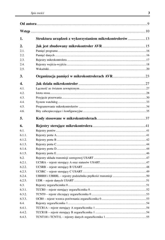 Spis treści 3 Od autora ............................................................................................................................. 9 Wstęp .................................................................................................................................. 10 1. Struktura urządzeń z wykorzystaniem mikrokontrolerów .................... 13 2. Jak jest zbudowany mikrokontroler AVR ................................................. 15 2.1. 2.2. 2.3. 2.4. 2.5. Pamięć programu ....................................................................................................................16 Pamięć danych ........................................................................................................................16 Rejestry mikrokontrolera ........................................................................................................17 Rejestry wejścia-wyjścia .........................................................................................................18 Wskaźniki ................................................................................................................................20 3. Organizacja pamięci w mikrokontrolerach AVR ..................................... 23 4. Jak działa mikrokontroler ............................................................................ 27 4.1. 4.2. 4.3. 4.4. 4.5. 4.6. Łączność ze światem zewnętrznym ........................................................................................27 Istota stosu...............................................................................................................................28 Przyjęcie przerwania ...............................................................................................................30 System watchdog ....................................................................................................................33 Programowanie mikrokontrolerów .........................................................................................34 Bity zabezpieczające i konfiguracyjne ...................................................................................35 5. Kody stosowane w mikrokontrolerach ....................................................... 37 6. Rejestry sterujące mikrokontrolera ............................................................ 41 6.1. 6.1.1. 6.1.2. 6.1.3. 6.1.4. 6.1.5. 6.2. 6.2.1. 6.2.2. 6.2.3. 6.2.4. 6.2.5. 6.3. 6.3.1. 6.3.2. 6.3.3. 6.4. 6.4.1. 6.4.2. 6.4.3. Rejestry portów .......................................................................................................................41 Rejestry portu A ......................................................................................................................41 Rejestry portu B ......................................................................................................................42 Rejestry portu C ......................................................................................................................44 Rejestry portu D ......................................................................................................................44 Rejestry portu E ......................................................................................................................46 Rejestry układu transmisji szeregowej USART .....................................................................47 UCSRA – rejestr sterujący A oraz statusów USART.............................................................47 UCSRB – rejestr sterujący B USART ....................................................................................48 UCSRC – rejestr sterujący C USART ....................................................................................49 UBRRH i UBRRL – rejestry podzielnika prędkości transmisji ............................................50 UDR – rejestr danych USART ...............................................................................................51 Rejestry zegara/licznika 0 .......................................................................................................51 TCCR0 – rejestr sterujący zegara/licznika 0 ..........................................................................52 TCNT0 – rejestr zliczający zegara/licznika 0 ........................................................................53 OCR0 – rejestr wzorca porównania zegara/licznika 0 ...........................................................53 Rejestry zegara/licznika 1 .......................................................................................................54 TCCR1A – rejestr sterujący A zegara/licznika 1 ...................................................................54 TCCR1B – rejestr sterujący B zegara/licznika 1 ...................................................................54 TCNT1H i TCNT1L – rejestry danych zegara/licznika 1......................................................55 4 Spis treści 6.4.4. 6.4.5. 6.4.6. 6.5. 6.5.1. 6.5.2. 6.5.3. 6.6. 6.7. 6.7.1. 6.7.2. 6.7.3. 6.8. 6.8.1. 6.8.2. 6.8.3. 6.8.4. 6.9. 6.9.1. 6.9.2. 6.9.3. 6.9.4. 6.9.5. 6.9.6. 6.9.7. 6.9.8. OCR1AL i OCR1AH – rejestry porównania zegara/licznika 1 .............................................56 OCR1BH i OCR1BL – rejestry porównania zegara/licznika 1 .............................................57 ICR1L i ICR1H – rejestry przechwytywania zegara/licznika 1 ............................................57 Rejestry pamięci EEPROM ....................................................................................................58 EEARH i EEARL – para rejestrów adresowych pamięci EEPROM ....................................58 EEDR – rejestr danych pamięci EEPROM ............................................................................58 EECR – rejestr sterujący dostępem do pamięci EEPROM...............................