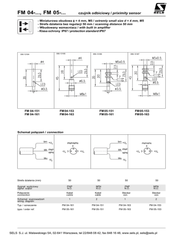 FM 04-..., FM 05-... czujnik odbiciowy / priximity sensor - Miniaturowa obudowa φ = 4 mm, M5 / extremly small size d = 4 mm, M5 - Strefa działania bez regulacji 50 mm / scanning distance 50 mm - Wbudowany wzmacniacz / with built in amplifier - Klasa ochrony IP67 / protection standard IP67 090-13185 090-13184 090-13186 FM 04-153 FM 04-163 FM 04-151 FM 04-161 090-13187 FM 05-151 FM 05-161 FM 05-153 FM 05-163 Schemat połączeń / connection brn +U B blk PNP NPN blu Strefa działania (mm) brn +U B PNP/NPN 4 4 blk PNP NPN 1 +UB -UB 3 blu -UB 50 Sygnał wyjściowy signal output PNP N.O. NPN N.O. PNP N.O. Połączenie connection Kabel cable Kabel cable Stecker con. 1 2 -UB 3 1 +UB -UB 50 Schemat wyprowadzeń wiring diagram PNP/NPN 50 1 50 NPN N.O. Stecker con. 2 Typ / oznaczenie FM 04-161 FM 04-151 FM 04-163 FM 04-153 type / order ref. FM 05-161 FM 05-151 FM 05-163 FM 05-153 SELS S.J. ul. Malawskiego 5A, 02-641 Warszawa, tel 22/848 08 42, fax 848 16 48, www.sels.pl, [email protected] FM 04-..., FM 05-... czujnik odbiciowy / priximity sensor Schemat połączeń / wiring PNP brn 1 blk 4 blu 3 +UB FM 04-... FM 05-... PNP NPN -UB Rys. 1 / fig. 1 brn 1 blk 4 blu 3 +UB FM 04-... FM 05-... NPN -UB Rys. 2 / fig. 2 091-13188 Charakterystyka czułości czujnika / response diagram Parametry elektryczne / Electrical data (typ.) Parametry optyczne / Optical data (typ.) Napięcie zasilania: operating voltage UB: Materiał odniesienia: reference material: biały, 100 x 100 mm white 100 x 100 mm Rodzaj światła: used light: IR 880 nm pulsujące IR 880 nm, pulsed Zabezpieczenie przed zmianą polaryzacji: polarity reversal protection: Czas opóźnienia po załączeniu zasilania: standby delay: Max. prąd obciążenia IL: max. output current IL: Zabezp. przed krótkotrwałym przeciążeniem: short circuit protection: 15 mA 15 mA wbudowane built in < 300 ms < 300 ms 100 mA 100 mA wbudowane built in Histereza: distance hysteresis: 10 % strefy działania czujnika 10 % from adjusted scanning range Warunki zewnętrzne oświetlenia: ambient light: EN 60947-5-2 EN 60947-5-2 Parametry mechaniczne / Mechanical data Materiał obudowy: casing material: Klasa ochrony: protection standard: mosiądz niklowany brass, nickel plated IP67 IP67 Dopuszczalne napięcie resztkowe syg. wyjściowego: < 2,4 V voltage drop at signal output: < 2,4 V Temperatura pracy: ambient temperature range: -25 ... +75 °C -25 ... +75 °C Częstotliwość przełączania (ti/tp 1:1): switching frequency (at ppp 1:1): 200 Hz 200 Hz Temperatura przechowywania: storage temperature range: -25 ... +80 °C -25 ... +80 °C Min. czas załączenia: min. response time on: 2,5 ms 2,5 ms Kabel: standard cable: Min. czas wyłączenia: min. response time off: 2,5 ms 2,5 ms Masa weight Konektor connectors Sygnalizacja sygnału wyjściowego: output signal indicator: Klasa bezpieczeństwa: protection class: 1) 1) LED gelb LED yellow 3 x 0,14 mm2, 2 m, PUR 3 x 0,14 mm2, 2 m, PUR 38 g 38 g M8/3pin M8/3pin 1) dla 50 V DC rated voltage 50 V DC Powyższy czujnik nie może być stosowany w aplikacjach bezpieczeństwa lub podobnych. These Proximity Switches are not suited for safety related applications. SELS S.J. ul. Malawskiego 5A, 02-641 Warszawa, tel 22/848 08 42, fax 848 16 48, www.sels.pl, [email protected] 068-13147 Pobór prądu bez obciążenia: power consumption (no load): 20 % 20 % 04/96 Max. tętnienia zasilania: residual ripple: 10 ... 30 V DC 10 ... 30 V DC